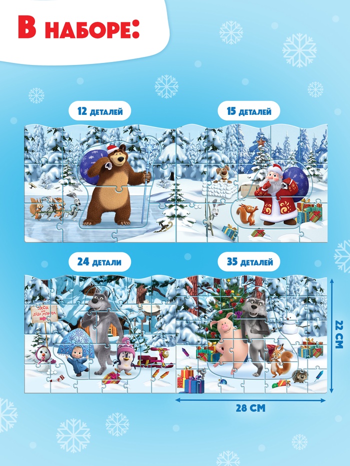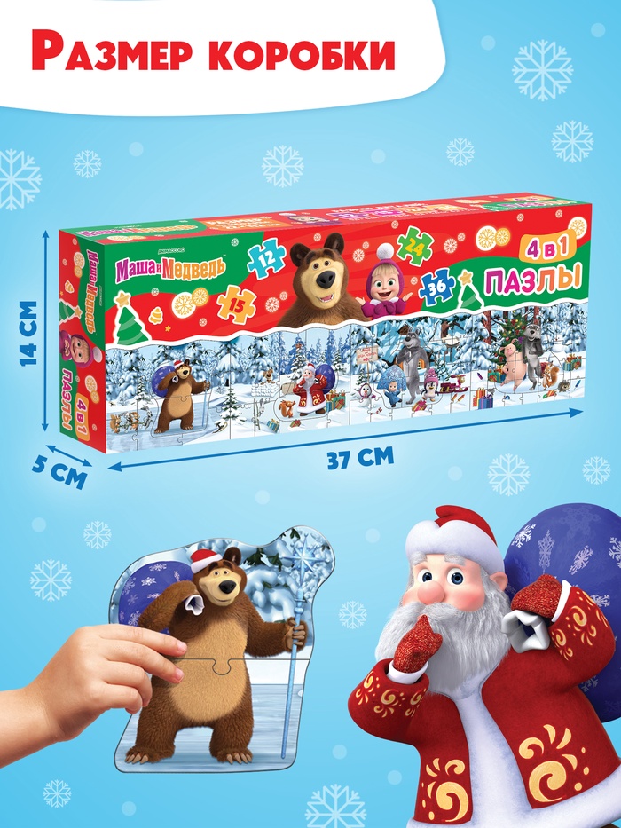 Габариты: 37 x 14 x 5 Страна: Китай В боксе: 30 шт Состав: Картон Материалы: картон Фасовка: по 1 шт Индивидуальная упаковка: Плёнка Сертификат: ЕАС Для кого: Унисекс Возраст: От 3 лет В наборе, шт.: 4 Ширина собранного пазла, см: 22 Количество элементов: 86 Длина собранного пазла, см: 112 Тематика: Новогодняя, Мультфильмы Вид упаковки: Коробка картонная Тематика праздника: Новый год Адресат: Без адресата Возраст: Детский Материал: Картон Составляющие набора: Пазлы Возраст: Для детей Тип пазлов: С фигурными элементами Форма: Прямоугольник Особенности: Набор Новогодние пазлы «Маша и Медведь: Волшебство зимы» — это набор из 4 головоломок, которые помогут создать праздничное настроение и подарят часы увлекательного досуга. Этот комплект создан для детей от 3 лет и включает пазлы с разным количеством деталей: 12, 15, 24 и 35 элементов. Собирая их, ребёнок сможет составить красочную новогоднюю историю с любимыми персонажами популярного мультсериала. Особенности набора