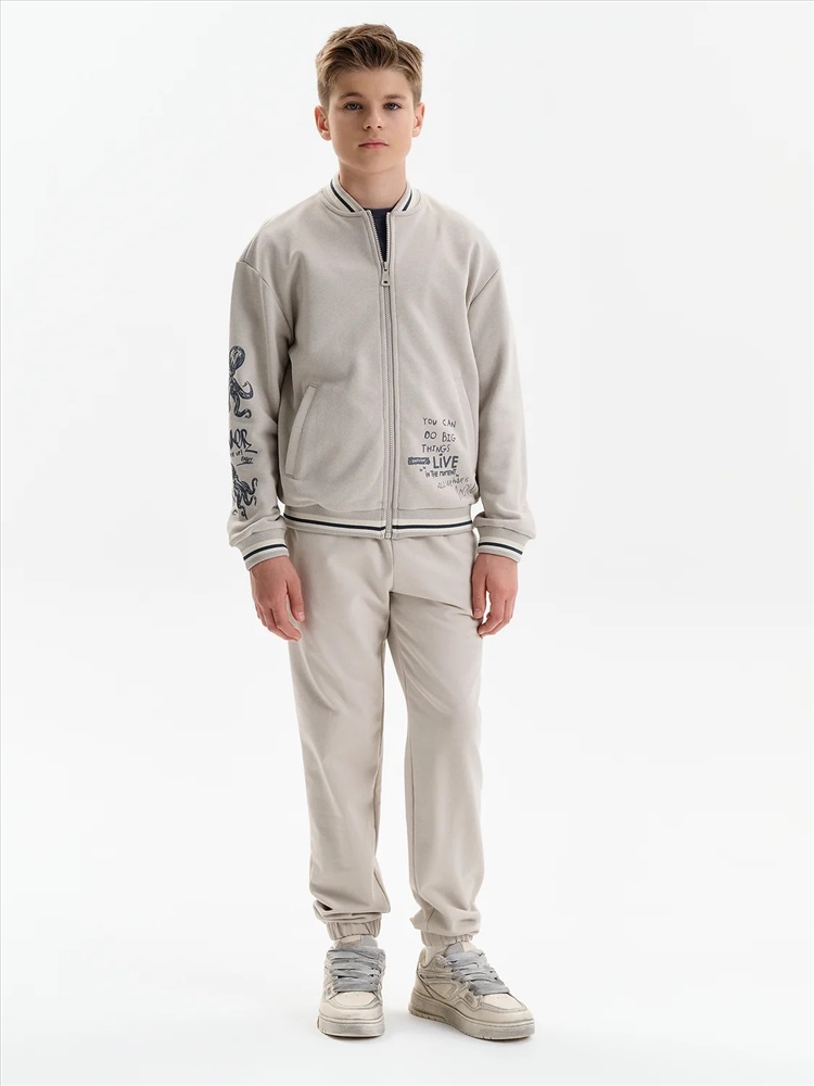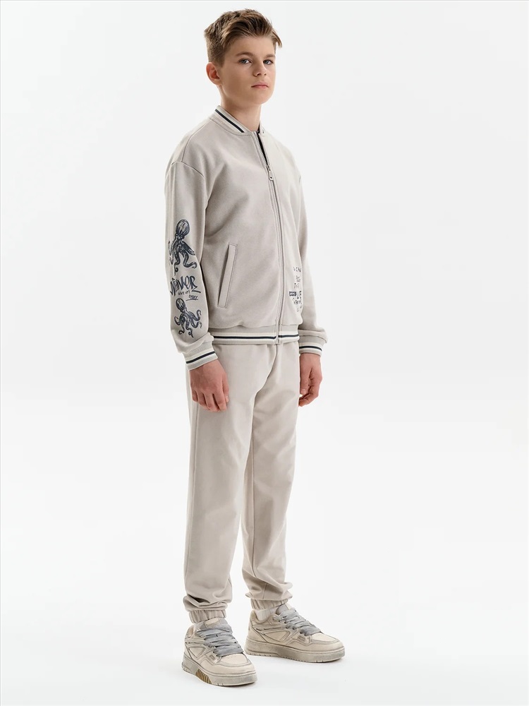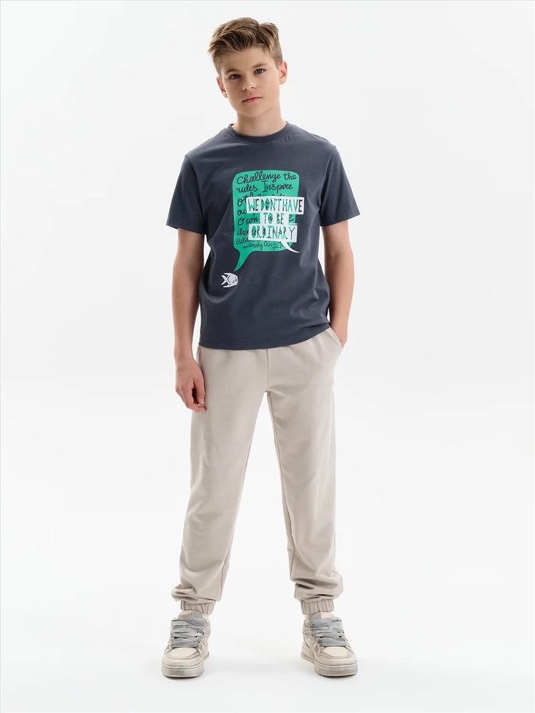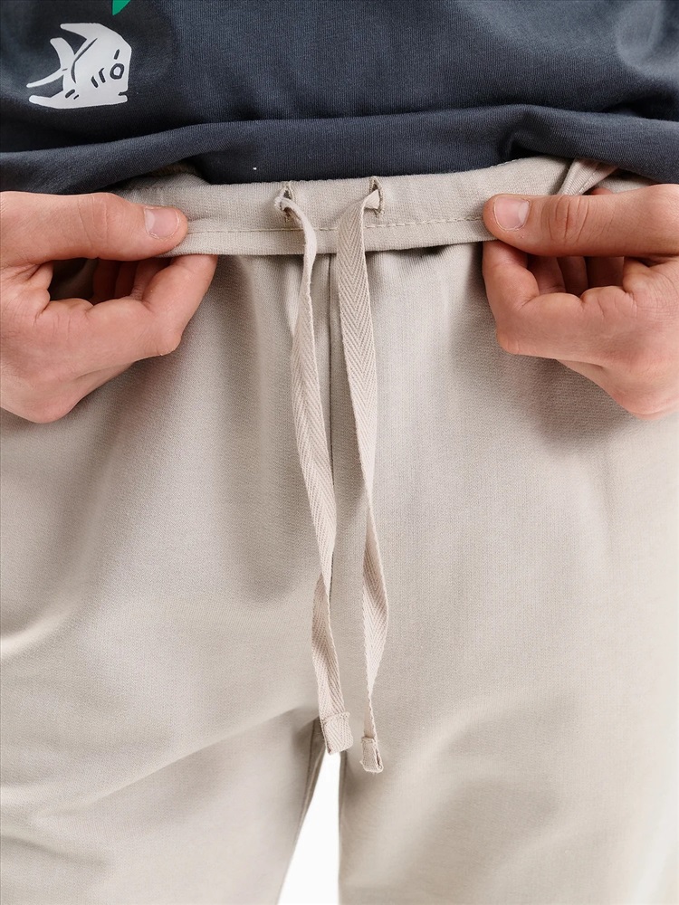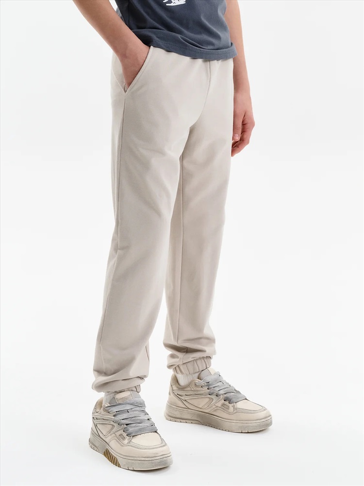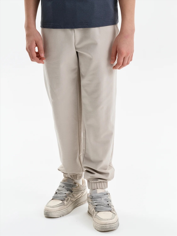 Брюки для мальчика на резинке из тонкого трикотажа. Комфортные спортивные штаны для мальчика свободного силуэта, по низу брюк тунельная резина. Пояс из основной ткани, внутри широкий эластик, прострочен двумя строчками. Брюки с карманами выполнены из футера. Внутренняя утяжка по поясу шнурком.