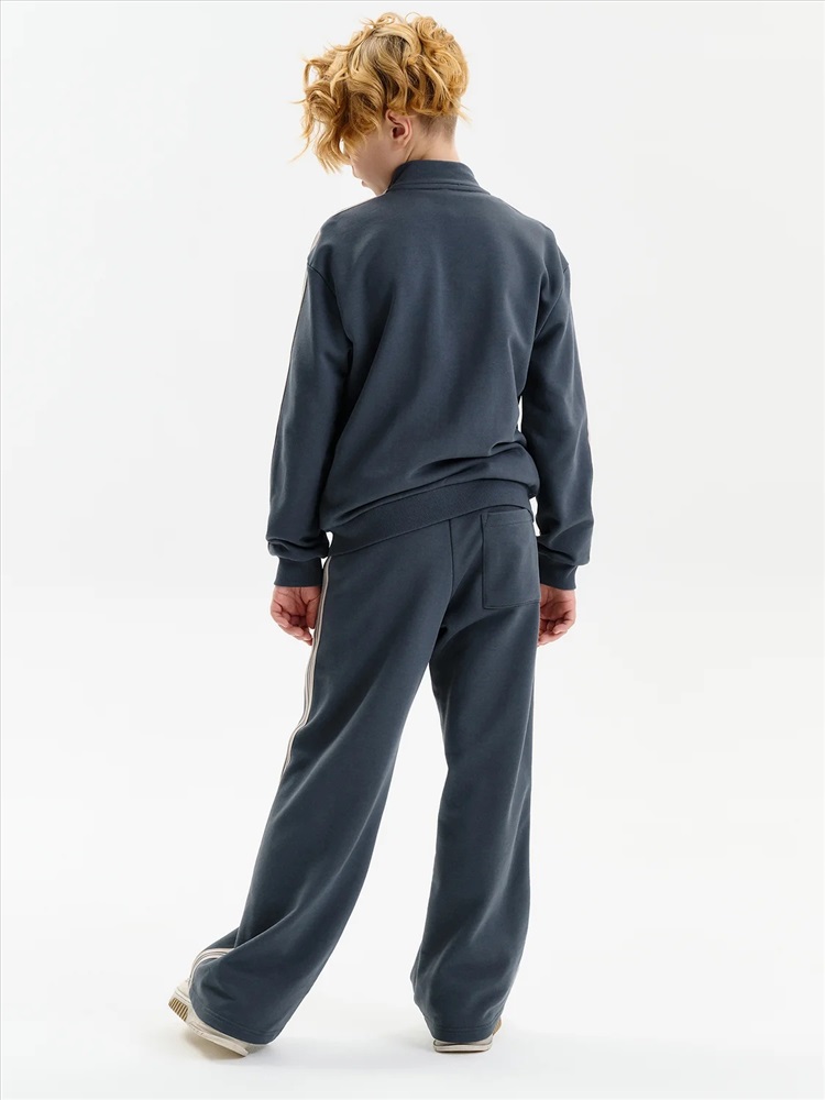 Широкие прямые брюки для мальчика из футера плотностью 350 гр/кв.м. Карманы в боковых швах. На задней половинке брюк справа накладной карман. Пояс из основной ткани, внутри широкий эластик, прострочен двумя строчками. В поясе внутренняя утяжка на шнурок. По бокам трикотажные лампасы.