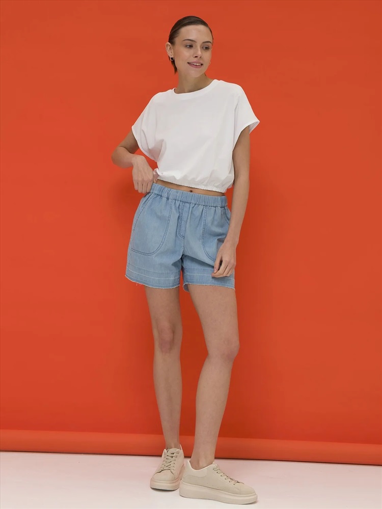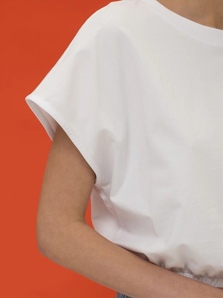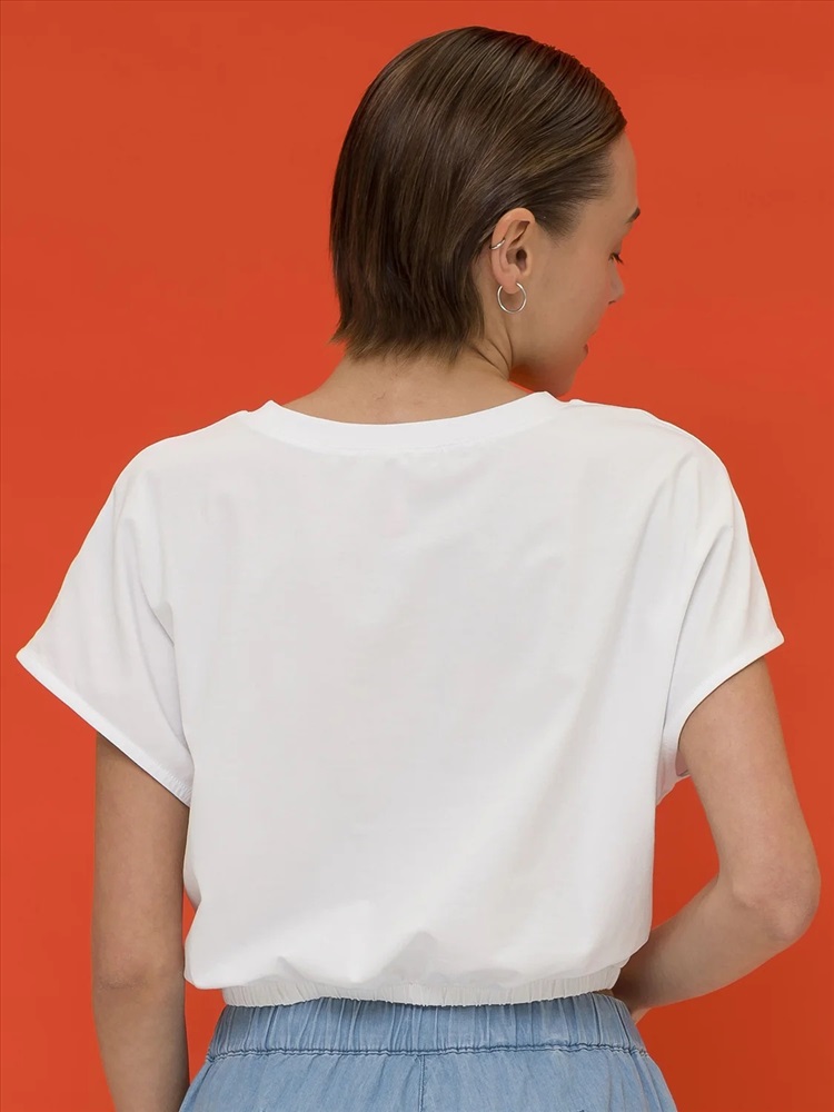 Женский кроп-топ с короткими цельнокроеными рукавами. В составе ткани преобладает хлопок — изделие приятно на ощупь и отлично подходит для жаркой погоды. Эластан помогает сохранять форму. Горловина с классическим округлым вырезом отделана рибаной, она долго не теряет форму. Низ модели собран на широкую резинку - это создаёт актуальный силуэт заправленной внутрь футболки. Такой топ благодаря лаконичному дизайну великолепно сочетается с различными шортами и брюками.