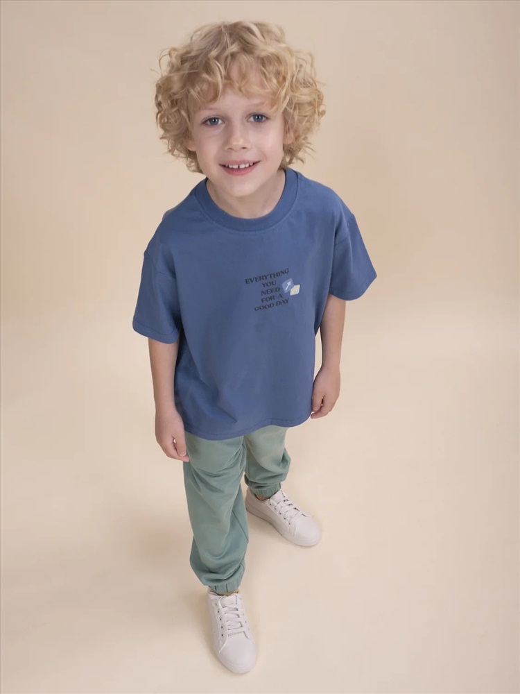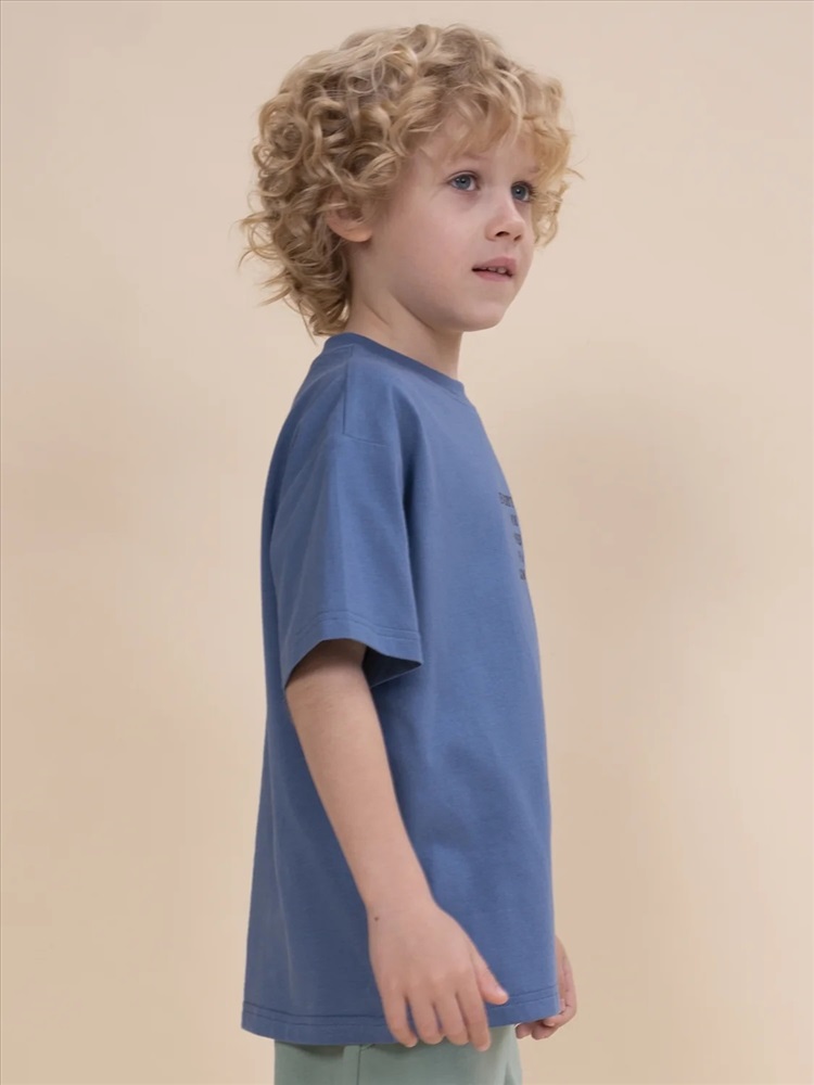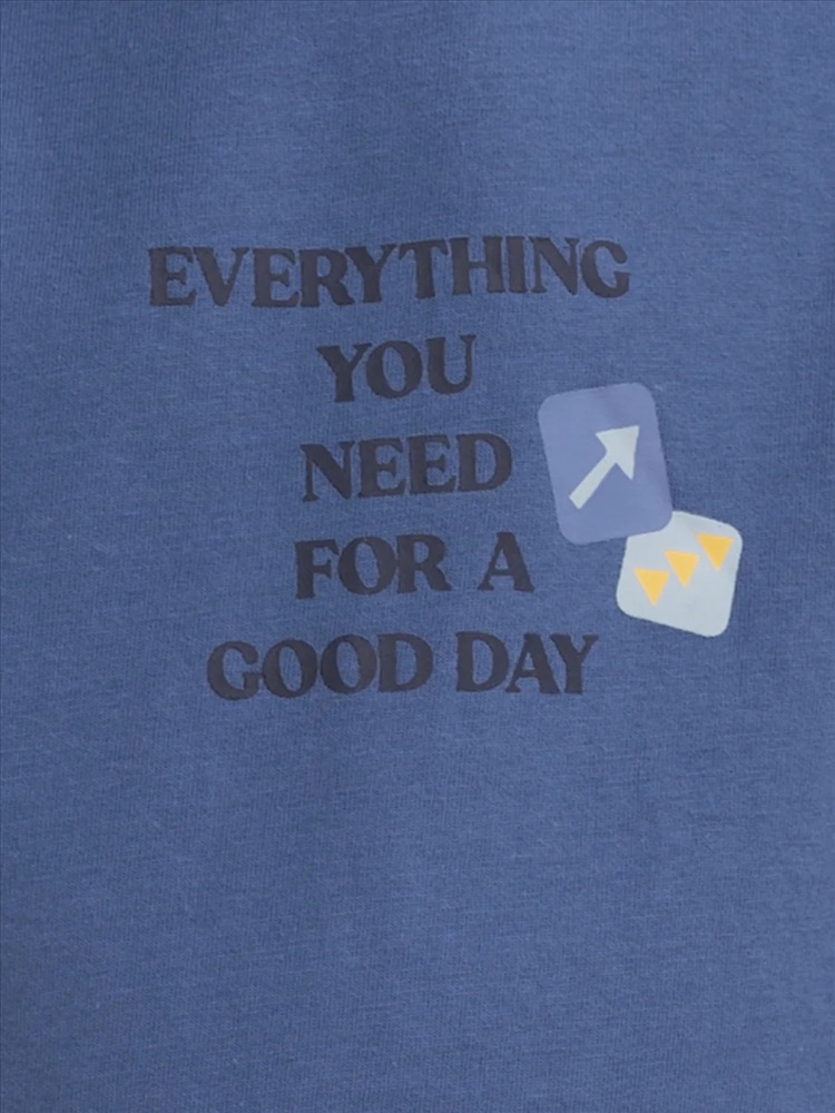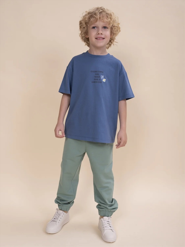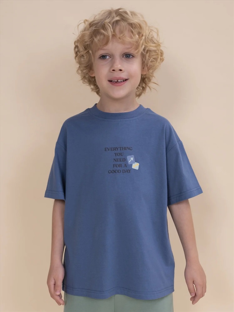 Футболка для мальчика оверсайз – модель большого объема на каждый день, для дома и прогулок. Легкая трикотажная футболка подходит в качестве нательного белья и многослойных образов. Базовая футболка на любой сезон. Изделие сшито из 100% натурального хлопка. Мягкий материал приятно прилегает к телу, не вызывая дискомфортных ощущений во время движений. Хлопок хорошо пропускает воздух, обеспечивает гигроскопичность. Материал не задерживает влагу - ребенок не потеет. Оптимальный размер горловины удобен в носке - позволяет ребенку с легкостью надевать и снимать ее самостоятельно. Футболка для мальчика прослужит долго и будет радовать износостойкостью. Модель представлена в цвете джинс. Синяя футболка для мальчика - красивый вариант на любой выход. Футболка для мальчика с принтом спереди украшена надписью "Everything you need for a good day" – перевод "Всё что нужно для хорошего дня". На спинке – забавный рисунок. Изделие привлекает интересным дизайном. Свободная футболка для мальчика подростковая рассчитана на возраст садика и школы. Размерная линейка: 1 (86): 2 (92): 3 (98): 4 (104): 5 (110): 6 (116): 7 (122): 8 (128): 9 (134): 10 (140): 11 (146). Крутая футболка для мальчика – отличный подарок для сына, внука, братика, племянника, крестника! Выбирайте нужный размер по таблице размеров на фото. Цвет товара на экране вашего устройства может отличаться от цвета изделия вживую.