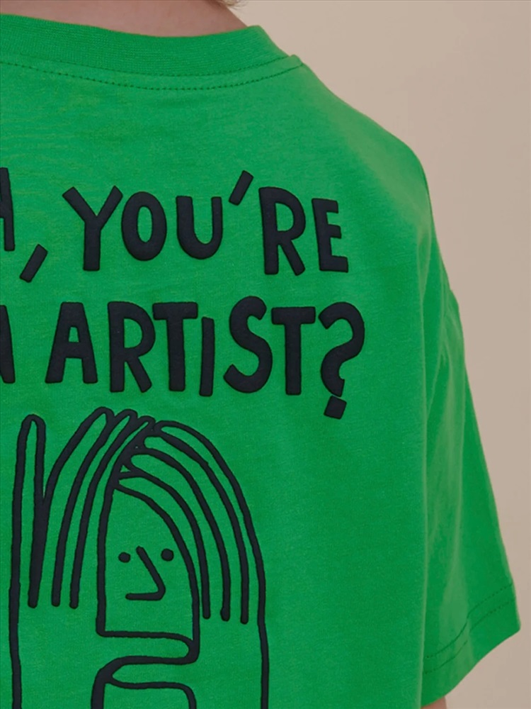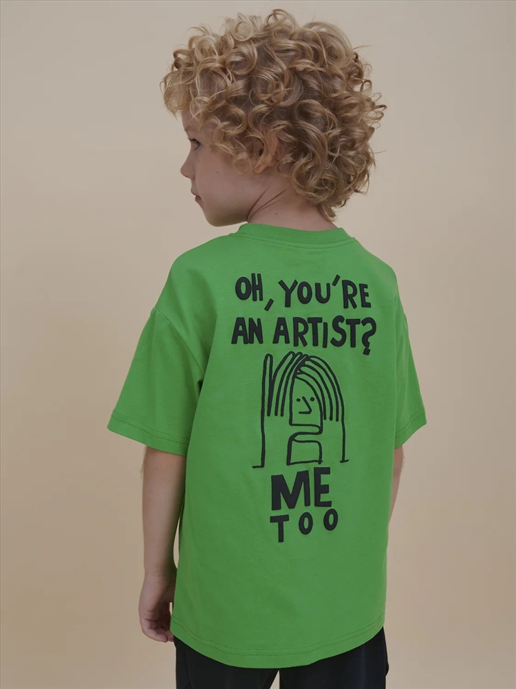 Футболка детская – модель умеренного объема на каждый день, для дома и прогулок. Легкая трикотажная футболка подходит в качестве нательного белья и многослойных образов. Базовая футболка на любой сезон. Изделие сшито из 100% натурального хлопка, мягкий материал приятно прилегает к телу, не вызывая дискомфортных ощущений во время движений. Хлопок хорошо пропускает воздух, обеспечивает гигроскопичность. Материал не задерживает влагу - ребенок не потеет. Детская футболка с оптимальным размером горловины удобна в носке - позволит ребенку с легкостью надевать и снимать ее самостоятельно, прослужит долго и будет радовать износостойкостью. Модель представлена в зеленом цвете. Красивый вариант на любой выход. Футболка для мальчика с принтом украшена надписью "Oh, you’re an artist?" – перевод "О, ты художник? – Я тоже! ". Изделие привлекает забавным дизайном. Футболка для мальчика подростковая рассчитана на возраст садика и школы. Размерная линейка: 1 (86): 2 (92): 3 (98): 4 (104): 5 (110): 6 (116): 7 (122): 8 (128): 9 (134): 10 (140): 11 (146). Крутая футболка для мальчика – отличный подарок для сына, внука, братика, племянника, крестника! Выбирайте нужный размер по таблице размеров на фото. Цвет товара на экране вашего устройства может отличаться от цвета изделия вживую.