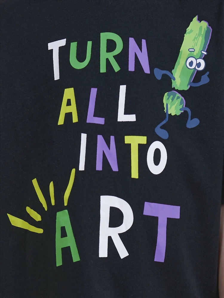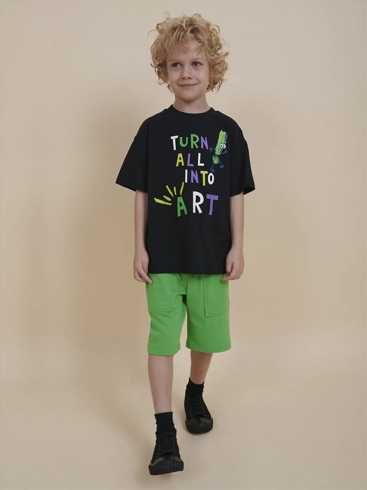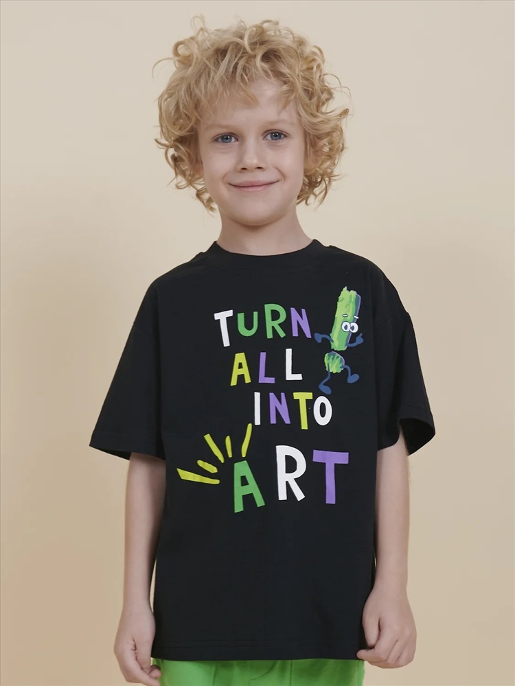 Футболка для мальчика оверсайз – модель большого объема на каждый день, для дома и прогулок. Легкая трикотажная футболка подходит в качестве нательного белья и многослойных образов. Базовая футболка на любой сезон. Изделие сшито из 100% натурального хлопка, мягкий материал приятно прилегает к телу, не вызывая дискомфортных ощущений во время движений. Хлопок хорошо пропускает воздух, обеспечивает гигроскопичность. Материал не задерживает влагу - ребенок не потеет. Футболка с оптимальным размером горловины удобна в носке - позволит ребенку с легкостью надевать и снимать ее самостоятельно, прослужит долго и будет радовать износостойкостью. Модель представлена в черном цвете. Черная футболка для мальчика - оптимальный вариант на любой выход. Футболка для мальчика с принтом украшена надписью "Turn all into art" – перевод "Превратим всё в искусство". Изделие привлекает интересным дизайном. Свободная футболка для мальчика подростковая рассчитана на возраст садика и школы. Размерная линейка: 1 (86): 2 (92): 3 (98): 4 (104): 5 (110): 6 (116): 7 (122): 8 (128): 9 (134): 10 (140): 11 (146). Крутая футболка для мальчика – отличный подарок для сына, внука, братика, племянника, крестника! Выбирайте нужный размер по таблице размеров на фото. Цвет товара на экране вашего устройства может отличаться от цвета изделия вживую.