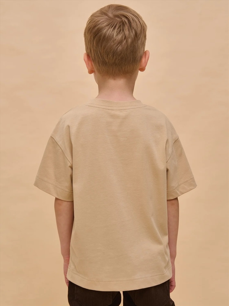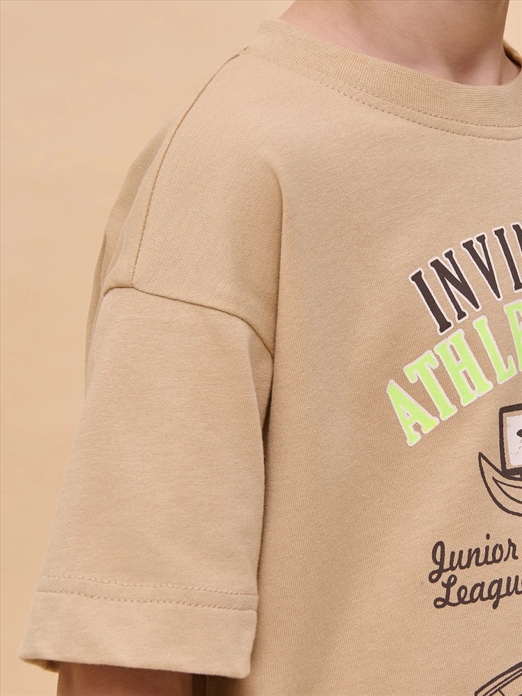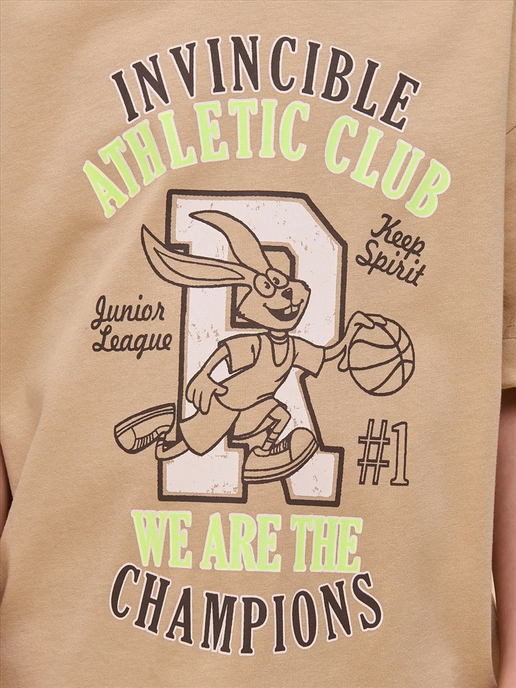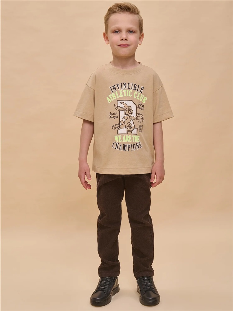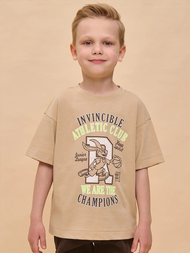 Детская футболка для мальчика. Комфортная майка свободного объёма со спущенным плечом не будет стеснять движений ребёнка. Вырез горловины обработан эластичной рибаной (ткань в рубчик) — она прекрасно держит форму, не растягивается, при этом ребёнку удобно надевать и снимать футболку. Изделие неприхотливо в уходе. Футболка детская с принтом в актуальном университетском стиле по переду. Надписи переводятся: «непобедимы клуб атлетики, мы чемпионы», «сохраняй настрой», «младшая лига». Принт эластичный и прочный, не боится частых стирок. В составе ткани 100% хлопка — майка мягкая, дышащая, приятная на ощупь. Футболка для мальчиков выполнена в универсальном цвете, её легко комбинировать с различными брюками, шортами. Детские футболки с принтом подходят как для маленьких мальчиков, так и для подростков. Оверсайз-футболка для мальчика подходит для любого времени года, её можно носить как летом, так и в холодное время года в качестве среднего слоя одежды. Помните о правильном уходе за изделием: рекомендуется стирать при температуре не выше 30 °C, без предварительного замачивания, с изнанки. Это поможет сохранить качество и цвет футболки на длительное время. Не забывайте о выборе правильного размера. Используйте таблицу размеров на фотографии, чтобы выбрать подходящий вариант для вашего мальчика. Обратите внимание, что цвет товара на экране вашего устройства может отличаться от реального.