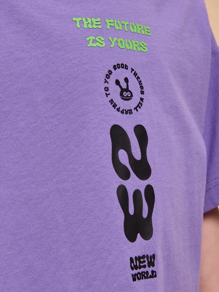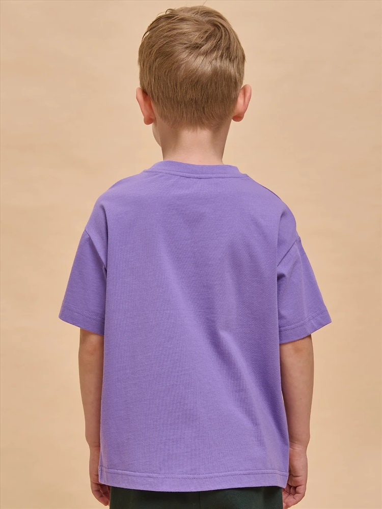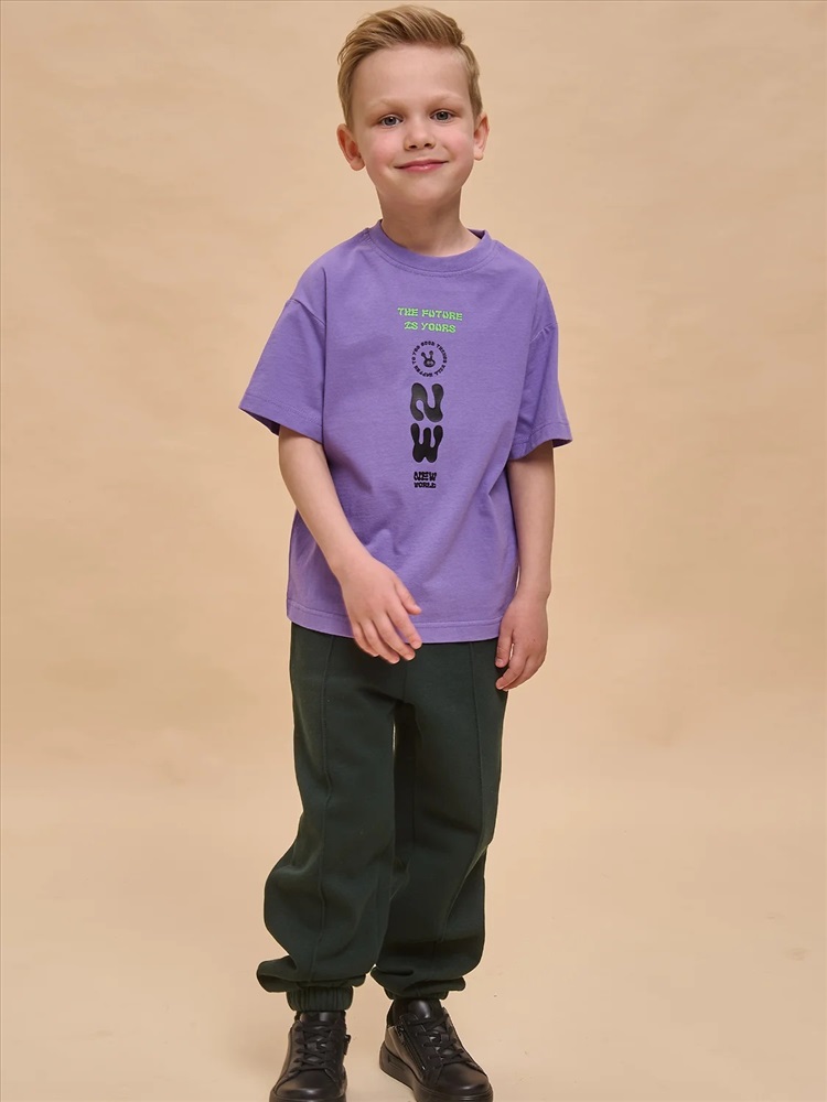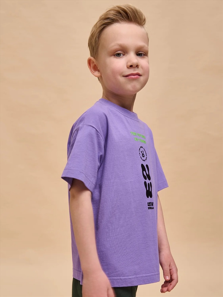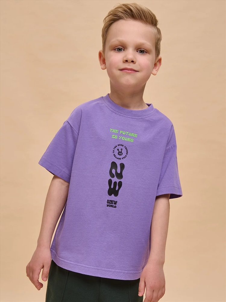 Детская футболка для мальчика. Комфортная майка умеренного оверсайз-объёма со спущенным плечом подарит ребёнку свободу движений. Вырез горловины обработан эластичной рибаной (ткань в рубчик) — она отлично держит форму, не растягивается, при этом ребёнку удобно надевать и снимать футболку. Изделие неприхотливо в уходе. Футболка детская с принтом с актуальным матовым эффектом в позитивном настроении по переду. Надписи переводятся: «будущее — твоё», «хорошие вещи произойдут с тобой», «новый мир». Принт эластичный и устойчивый, хорошо переносит многочисленные стирки. В составе ткани 100% хлопка — майка мягкая, воздухопроницаемая, приятная на ощупь. Футболка для мальчиков выполнена в трендовой расцветке, поможет создать яркий образ. Детские футболки с принтом подходят как для маленьких мальчиков, так и для подростков. Оверсайз-футболка для мальчика подходит для любого времени года, её можно носить как летом, так и в холодное время года в качестве среднего слоя одежды. Помните о правильном уходе за изделием: рекомендуется стирать при температуре не выше 30 °C, без предварительного замачивания, с изнанки. Это поможет сохранить качество и цвет футболки на длительное время. Не забывайте о выборе правильного размера. Используйте таблицу размеров на фотографии, чтобы выбрать подходящий вариант для вашего мальчика. Обратите внимание, что цвет товара на экране вашего устройства может отличаться от реального.