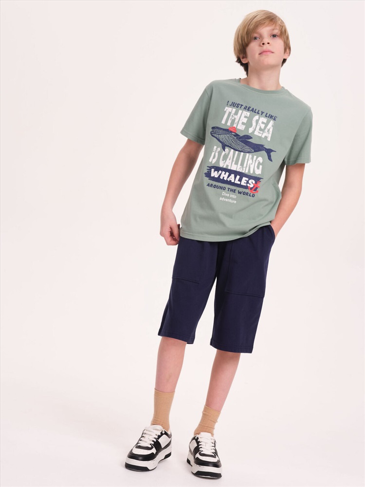 Футболка для мальчика прямого кроя - это идеальный выбор для активного ребенка. Вырез горловины обработан эластичной тканью — она прекрасно держит форму, не растягивается, при этом ребёнку удобно надевать и снимать футболку. По переду принт в морском стиле с надписью. Перевод надписи "I just really like the sea is calling" - мне просто очень нравится что море зовёт, "whales around the world" - киты по всему миру, "dive into adventure" - погрузись в приключение. Спортивная футболка подходит как для подростков так и для малышей в детский сад. Подходит для любого времени года.