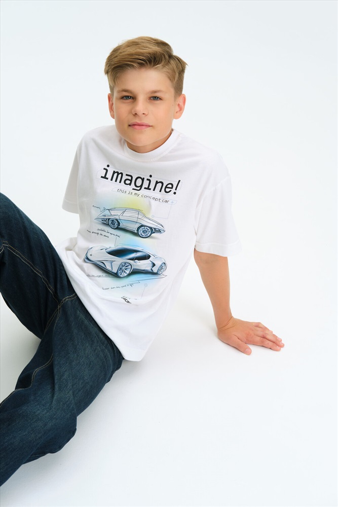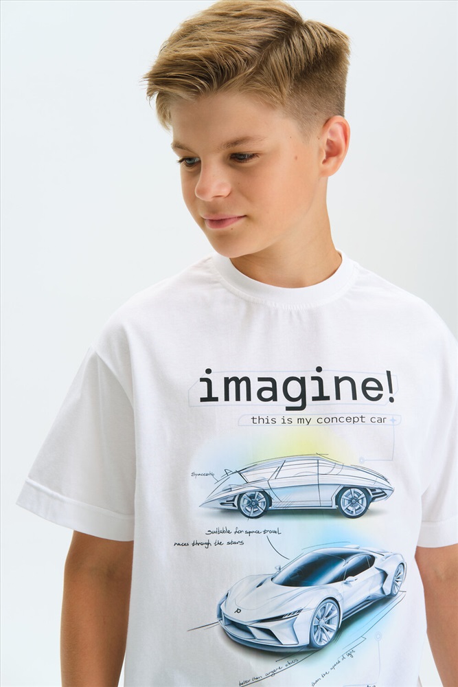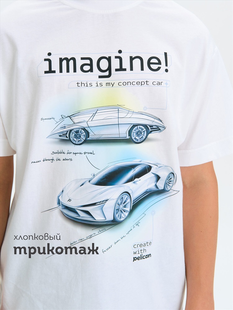 Футболка для мальчика прямого кроя маленького объема - это идеальный выбор для активного ребенка. Вырез горловины обработан эластичной тканью — она прекрасно держит форму, не растягивается, при этом ребёнку удобно надевать и снимать футболку. Футболка с фотопринтом, разработанным с помощью ИИ и надписями. Перевод надписей: Представте себе! Это мой концепт машины. Скетч надписи: Космический корабль, подходящий для космических путешествий. Гнать сквозь звёзды. Лучше, чем у кого-либо еще. Быстрее скорости света. Творите вместе с Пеликан. Спортивная футболка подходит как для подростков так и для малышей в детский сад. Подходит для любого времени года.