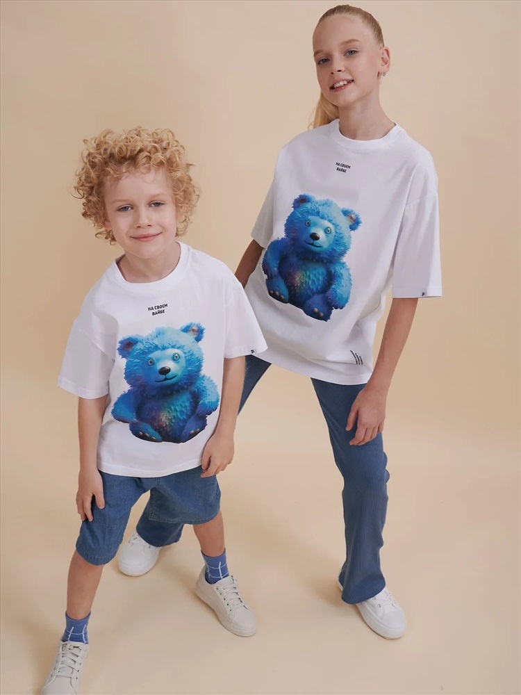 Детская футболка оверсайз. Комфортный джемпер свободного силуэта со спущенным плечом не будет стеснять движений ребёнка. Объёмная майка подарит ощущение комфорта и уюта. Вырез горловины отделан эластичной рибаной (ткань в рубчик) — она прекрасно держит форму, при этом ребёнку удобно надевать и снимать футболку. Модель неприхотлива в уходе. Главная фишка футболки — яркий стильный принт, изображающий персонажа, сгенерированного нейросетью (искусственным интеллектом). Это супермодный тренд! Футболка с прикольным принтом по переду выполнена из 100% высококачественного хлопка — изделие мягкое и воздухопроницаемое, что позволяет коже ребёнка свободно дышать. Принт эластичный и стойкий — без проблем переносит многочисленные стирки, не теряя своей яркости. На принте изображён милый плюшевый мишка голубого цвета + надписи "на своём вайбе" и "создано с помощью искусственного интеллекта". Футболка оверсайз белая универсальна, подходит и для девочек, и для мальчиков. Как для малышей дошкольного и младшего школьного возраста, так и для подростков. Модель идеальна для детского сада, спорта, прогулок, отдыха, а также в качестве домашней одежды. В линейке представлены следующие размеры: 1 (86): 2 (92): 3 (98): 4 (104): 5 (110): 6 (116): 7 (122): 8 (128): 9 (134): 10 (140): 11 (146). Белые футболки подходят для носки летом, осенью и весной (демисезон), зимой в качестве среднего слоя одежды. Легко сочетается с различными брюками, джинсами, юбками, легинсами и шортами. Футболка с принтом оверсайз — стильный и красивый подарок сыну, дочери, внуку или внучке на любой праздник. Выбирайте нужный размер по таблице размеров на фото. Цвет товара на экране вашего устройства может отличаться от цвета изделия вживую.