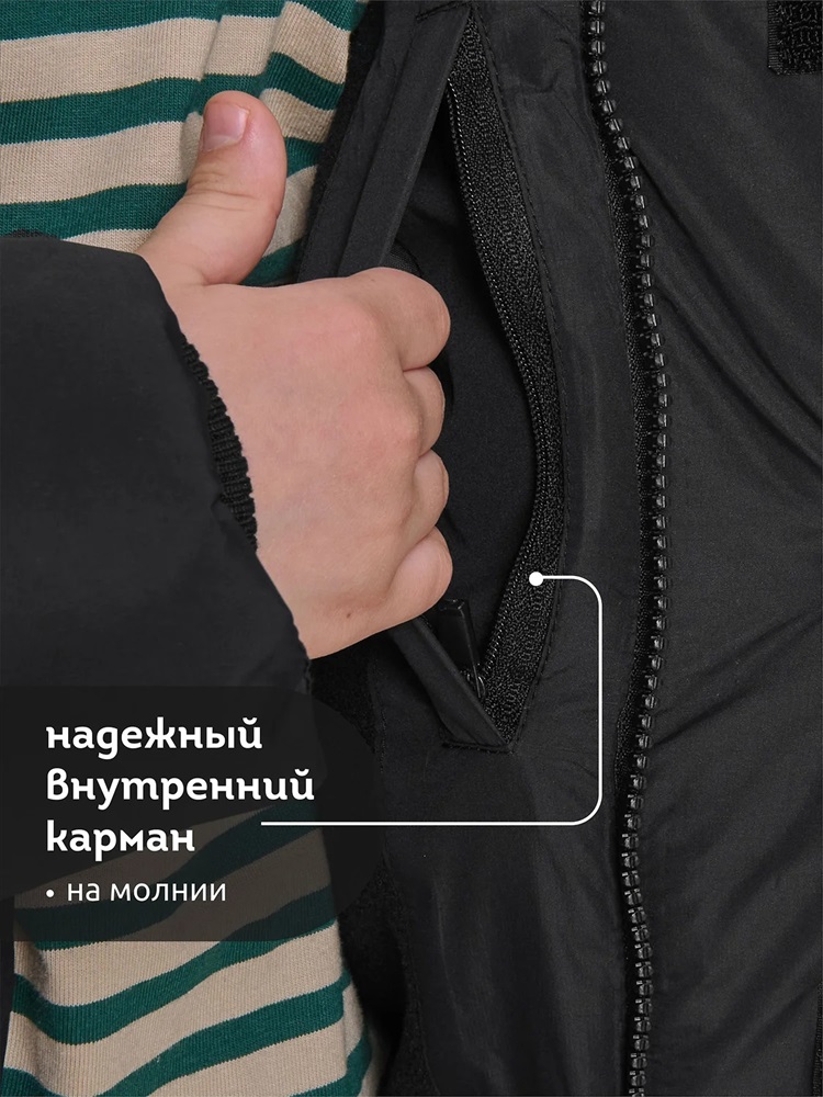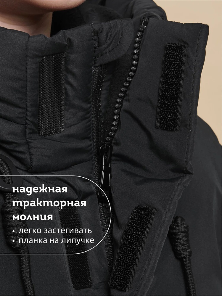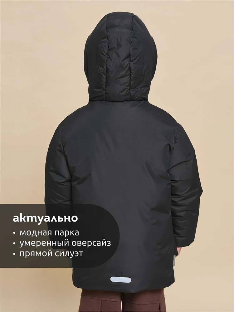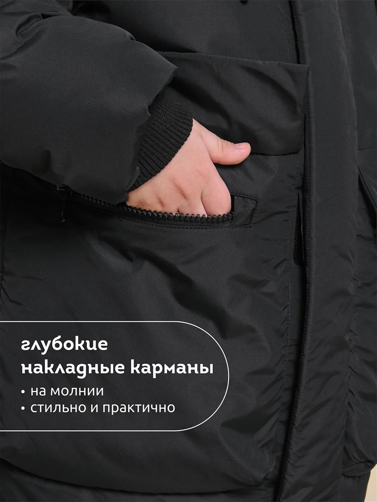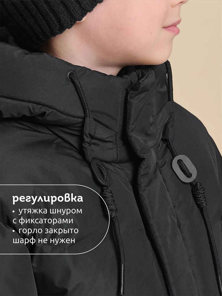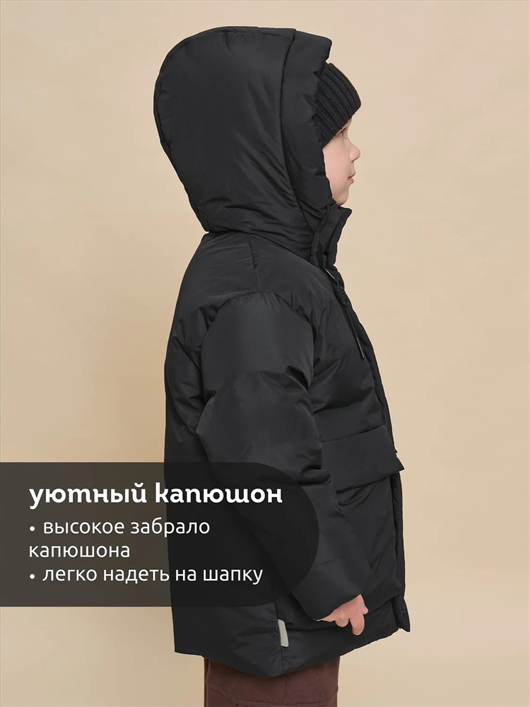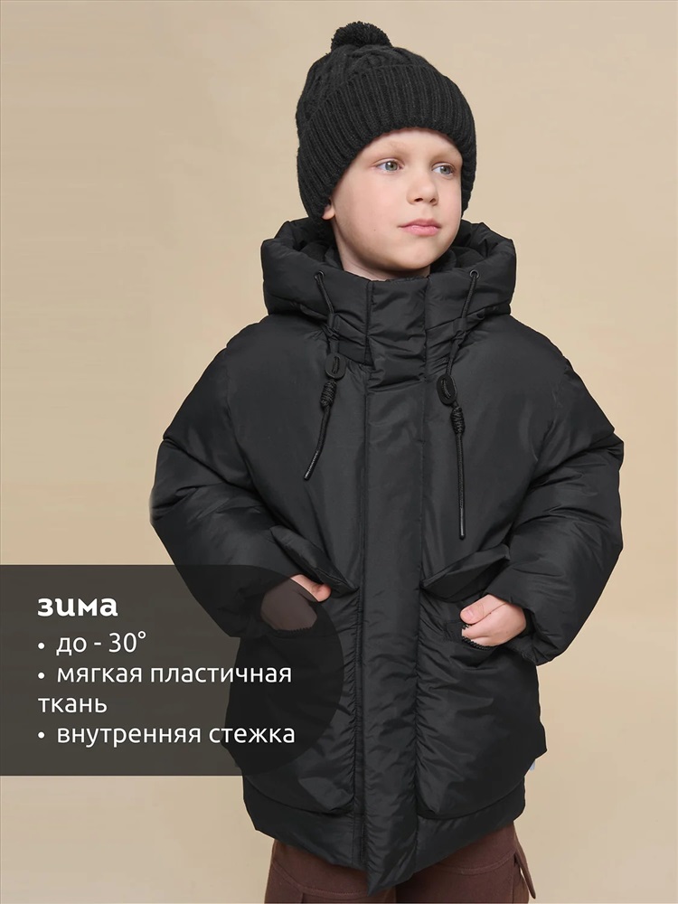 Куртка зимняя для мальчика. Модель прямого силуэта, объем - умеренный оверсайз. Куртка гладкая, без стёжки — суперактуальный тренд сезона. При этом утеплитель простёган внутри изделия — он равномерно распределён и надёжно зафиксирован. На внешнюю поверхность материала нанесена водоотталкивающая пропитка (DWR), она задерживает грязь и влагу снаружи — ребёнок не промокнет от снега, а комбинезон легко отстирается. Также есть дополнительная пропитка на внутренней стороне ткани — для более надёжной защиты от промокания. Капюшон с двумя швами, что обеспечивает анатомически правильную форму и комфортную посадку по голове. Легко одевается на шапку. Высокое забрало капюшона защищает шею и лицо от холода и ветра. Горло закрыто, шарф не нужен. Объём капюшона регулируется эластичным шнуром со стопперами. Центральная застёжка на пластиковую тракторную молнию, разъёмную с двух сторон — удобно садиться, пуллеры металлические, прочные. Сверху планка на велькро (липучках) — быстро застёгивается и расстёгивается. Куртка теплая — центральная молния с изнаночной стороны дополнительно закрыта ветрозащитной планкой. В рукавах внутренние манжеты из эластичной рибаны для защиты от холода и ветра. Рибана приятна на ощупь и при этом надолго сохраняет эластичность, не теряет форму. По переду объёмные накладные карманы с клапанами, закрываются на молнию. Внутренний карман на молнии для важных мелочей. В каждой куртке есть нейм-лейбл! Ребенок не потеряется и не потеряет куртку! В боковых швах и на спинке расположены светоотражающие элементы — безопасность в тёмное время суток. Модель без принта. Зимняя куртка с наполнителем из полиэстера — она тёплая, лёгкая, без проблем стирается, быстро сохнет, сохраняет отличную форму и цвет надолго. Мягкая флисовая подкладка добавляет дополнительную теплоту изделию во время холодов. В рукавах подкладка из гладкого полиэстера для лёгкости надевания. Отличная куртка для мальчика дошкольного и младшего школьного возраста, а также подростка. Идеальный, тёплый и стильный зимний пуховик. Рекомендуемый температурный режим: не ниже минус 30 градусов. Утеплитель: экопух. Куртка водоотталкивающая утеплённая подходит для носки в детский сад, школу, для прогулок и активного зимнего отдыха, игр на воздухе. Помните о правильном уходе за изделием: рекомендуется стирать при температуре не выше 30 °C, без предварительного замачивания, с изнанки. Это поможет сохранить качество и цвет куртки на длительное время. Не забывайте о выборе правильного размера. Используйте таблицу размеров на фотографии, чтобы выбрать подходящий вариант для вашего мальчика. Обратите внимание, что цвет товара на экране вашего устройства может отличаться от реального.