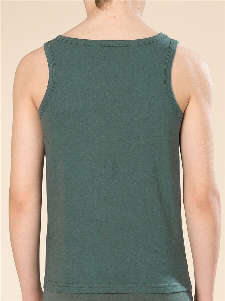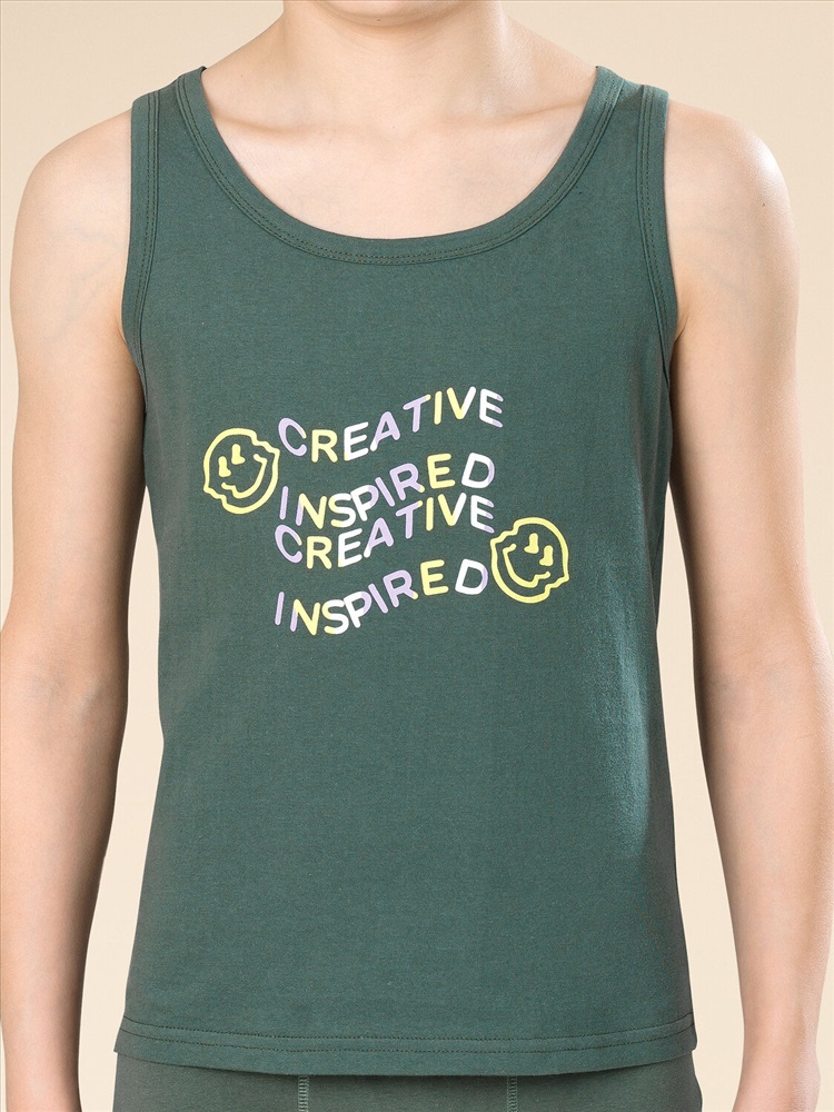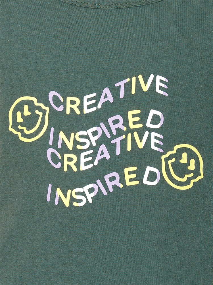 Выбирая бельё для своего ребёнка, любая мама заботится о его качестве и о том, чтобы ребёнку в нём было комфортно. Наша майка из 100% хлопка для мальчика — именно то, что вам нужно! Благодаря натуральному составу ткани модель приятна на ощупь, прекрасно пропускает воздух — кожа ребёнка дышит. Изделие правильного кроя — комфортно садится по фигуре, ребёнку удобно на протяжении всего дня. Такую майку можно носить под джемпер или свитер в качестве нательного белья. Горловина и проймы обработаны в тон — они не растягиваются, сохраняют великолепный внешний вид надолго. Изделие выполнено в трендовом цвете шалфея. Темно-зеленый цвет красивый и практичный. По переду майку украшает забавный принт с позитивным настроением. Перевод: "Вдохновленный творчеством". Принт эластичный и прочный — прекрасно переносит частые стирки. Эта модель универсальна, подходит для повседневной носки, летнего отдыха и как одежда для дома. Станет замечательным подарком, который способен вызвать искреннюю радость у каждого ребёнка, оставив н