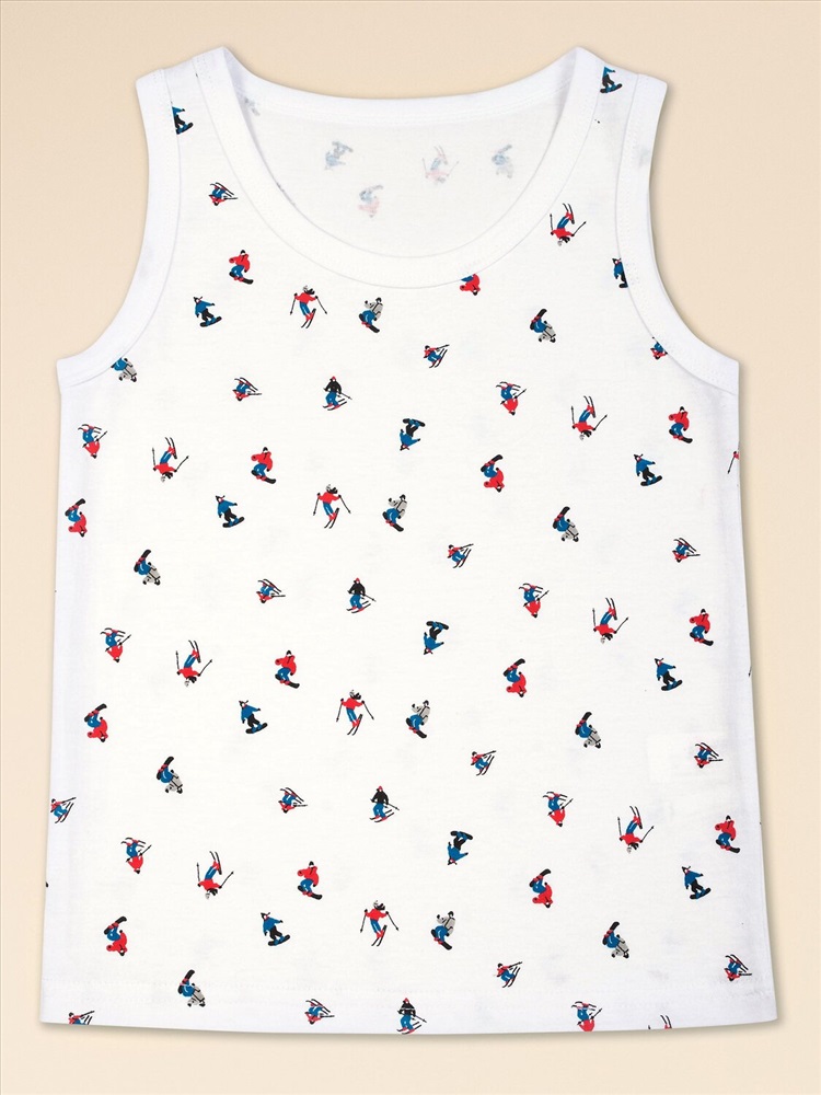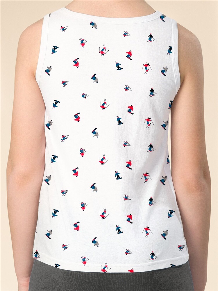 Белая майка для мальчика с олловер-принтом и круглым вырезом горловины станет комфортным, базовым вариантом белья. Изделие выполнено из мягкого материала со 100% содержанием хлопка. Белье приятно прилегает к телу, не вызывает раздражений за счет гипоаллергенного состава ткани. Майка из хлопка хорошо пропускает воздух, впитывает влагу, отводя ее от тела, позволяя мальчику свободно двигаться, играть. Кромка горловины и плеч аккуратно прошита мягкой полоской ткани - бейкой. В хлопковом нижнем белье высокого качества ребенок будет чувствовать себя комфортно и безопасно. Детская и подростковая майка из хлопка - это базовая одежда в гардеробе каждого ребенка. Высокое качество материала и пошива наделяет изделие долгим сроком службы с сохранением привлекательного внешнего вида. Благодаря мягкой ткани и удобному крою изделие легко сочетать с футболками, рубашками и свитерами. Белая майка для мальчика с мелким рисунком отлично подходит в качестве нательной одежды, варианта для сна, домашнего отдыха. Нужная вещь на все случаи жизни! Нательная майка украшена принтом лыжника, подходит для мальчика возраста садика, школы, а также подростка. Соберите комплект из хлопковой майки и трусов из представленной зимней коллекции в подарок на Новый год и Рождество для самых любимых!