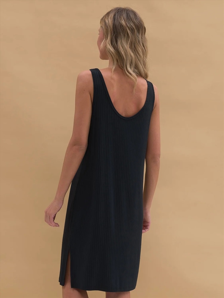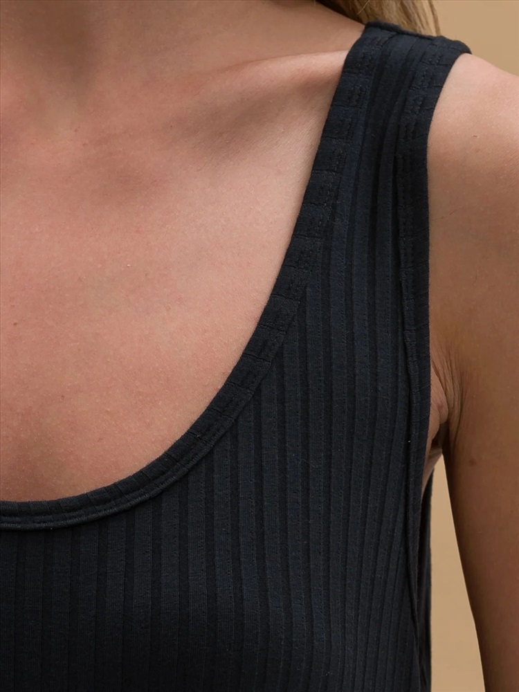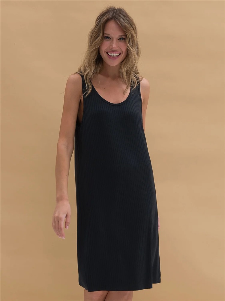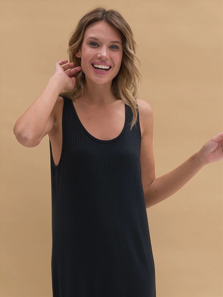 Женское платье-майка из эластичной ткани в рубчик. Ткань отлично растягивается и быстро возвращается в исходную форму, приятна на ощупь и проста в уходе. Платье на широких бретелях свободного кроя с увеличенными проймами – стильное, спортивное, комфортное. Боковые разрезы снизу для легкого акцента на ноги. Удобно спать, заниматься повседневными делами и просто быть собой.