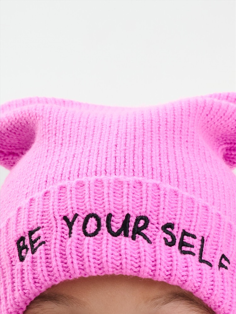 Тёплая и мягкая шапка с завязками на уютном флисовом подкладе — отличный выбор для прохладной погоды. Верхняя часть украшена забавными свисающими ушками с милыми косичками, которые придают модели игривый и неповторимый стиль. Шапка связана плотной, эластичной вязкой с аккуратным отворотом и цельновязанными ушками по низу. Модель отлично закрывает уши и шею, надёжно защищая от ветра и холода. Мягкие завязки обеспечивают комфортную и надежную фиксацию на голове. Особенный акцент — вышивка на отвороте с вдохновляющей надписью «Будь самим собой», которая придаёт образу индивидуальность и настроение.