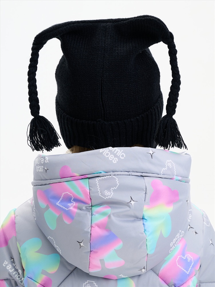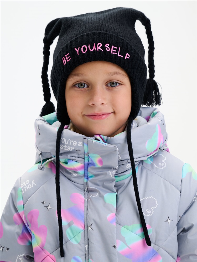 Тёплая и мягкая шапка с завязками на уютном флисовом подкладе — отличный выбор для прохладной погоды. Верхняя часть украшена забавными свисающими ушками с милыми косичками, которые придают модели игривый и неповторимый стиль. Шапка связана плотной, эластичной вязкой с аккуратным отворотом и цельновязанными ушками по низу. Модель отлично закрывает уши и шею, надёжно защищая от ветра и холода. Мягкие завязки обеспечивают комфортную и надежную фиксацию на голове. Особенный акцент — вышивка на отвороте с вдохновляющей надписью «Будь самим собой», которая придаёт образу индивидуальность и настроение.