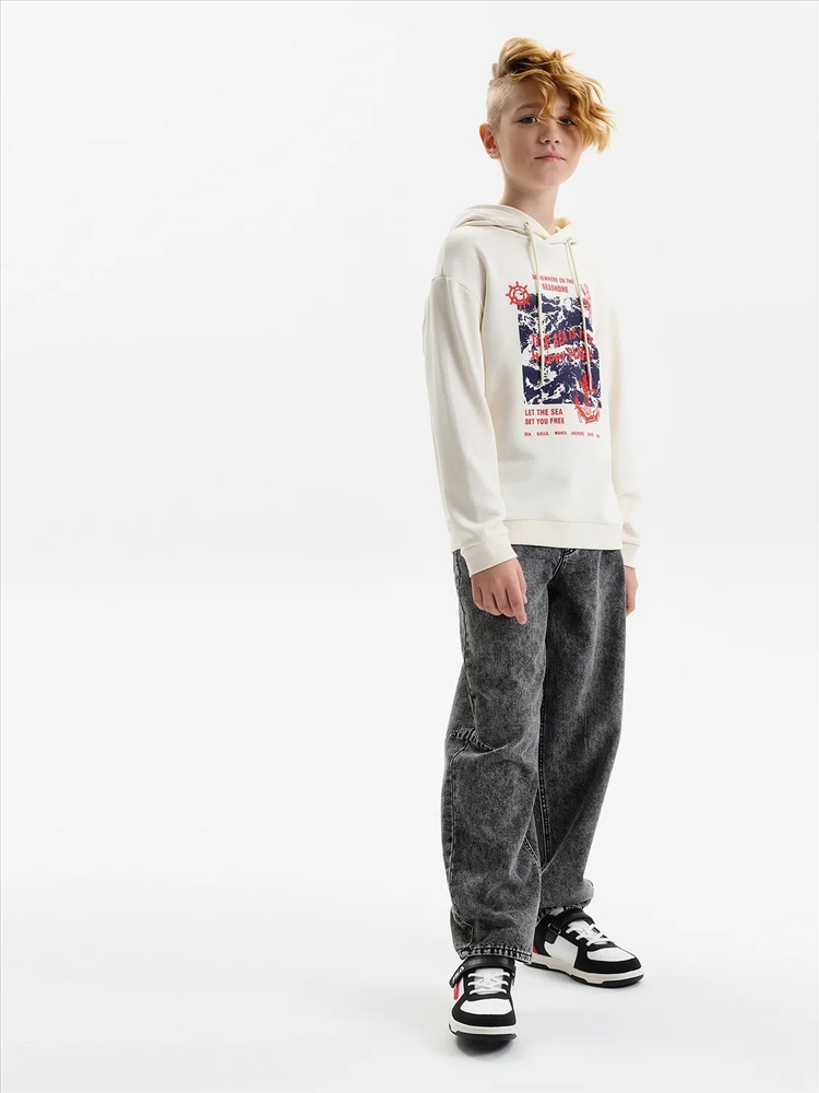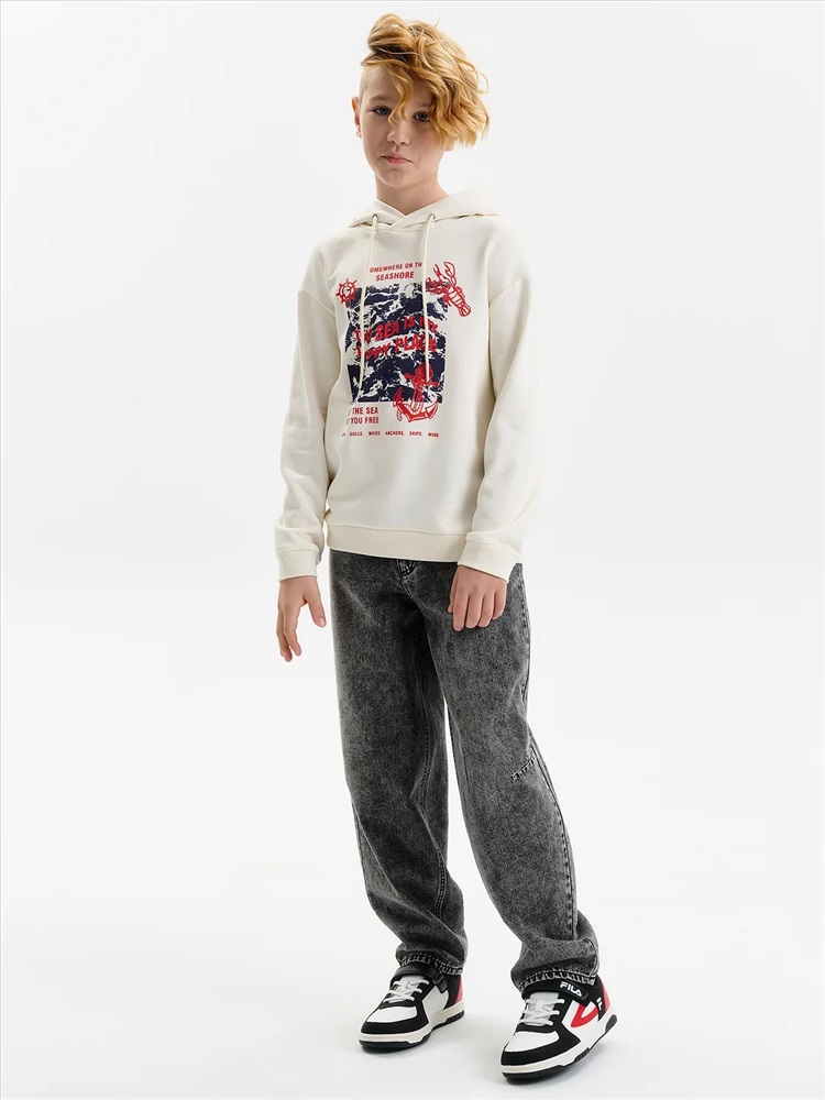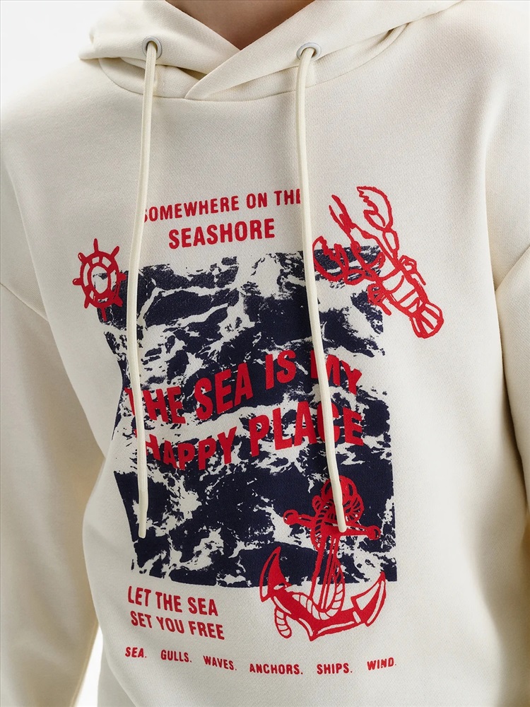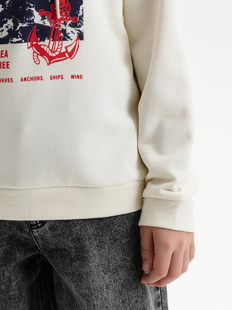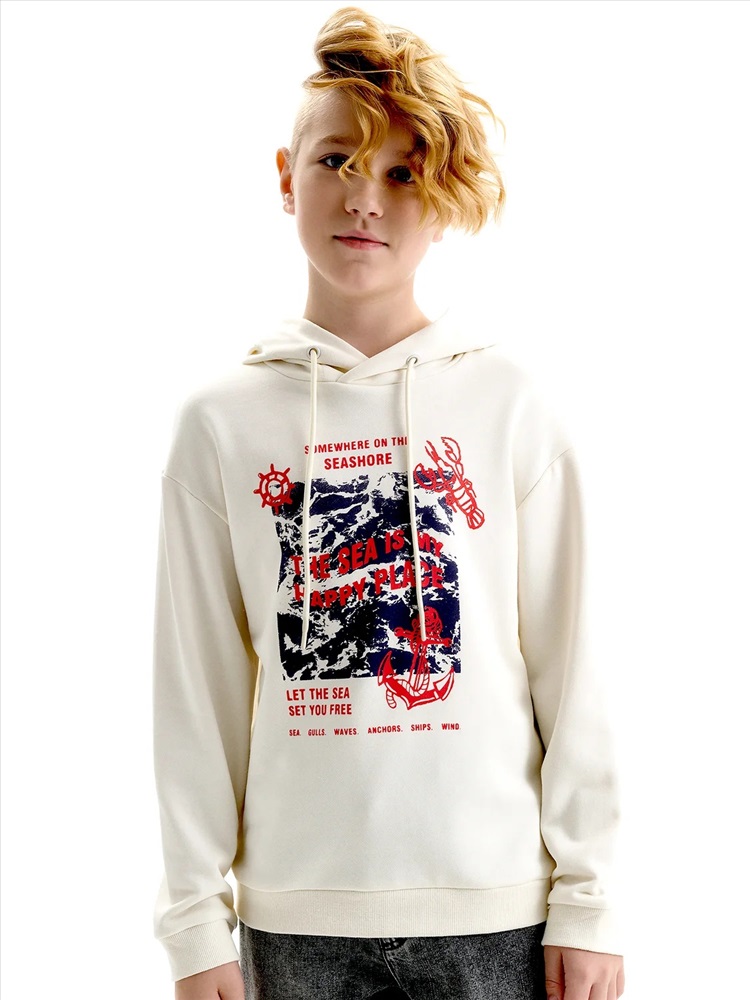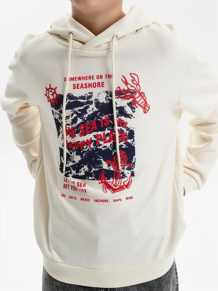Худи для мальчика без начеса – актуальная вещь в любом сезоне, будь то весна, лето или осень. Кофта спортивная для мальчика выполнена из плотного футера-петля, который отлично согревает в прохладную погоду и при этом хорошо пропускает воздух – ребенок активно двигается, играет, не потеет. Толстовка свободного покроя оверсайз со спущенным плечом, углубленной проймой. Рукава а также низ изделия на манжете из рибаны. Кофта без карманов. Капюшон с регулировкой объема. По переду изделие украшено принтом с надписью. Перевод надписей "somewhere on the seashore" - где-то на побережье, "the sea is my happy place" - море-мое счастливое место, "let the sea set you free" - позвольте морю освободить вас, "sea.gulls.waves.anchors.ships.wind" - море.чайки.волны.якоря.корабли.ветер. Размерный ряд подходит как для малышей так и для подростков.