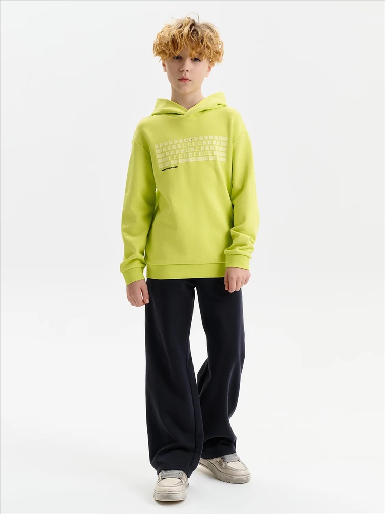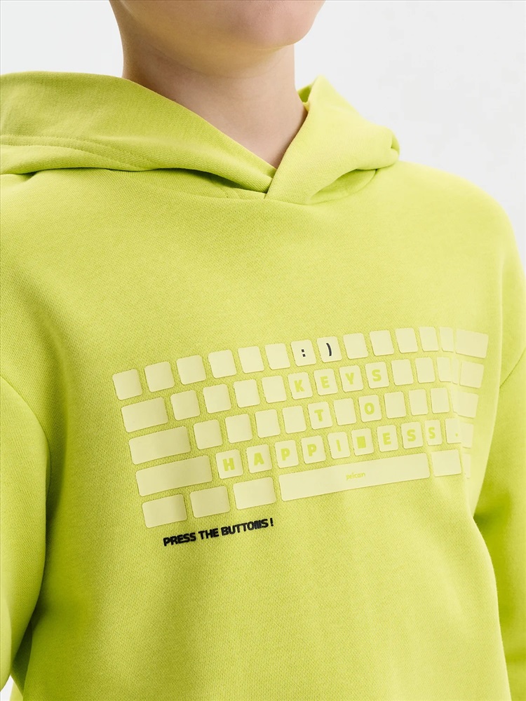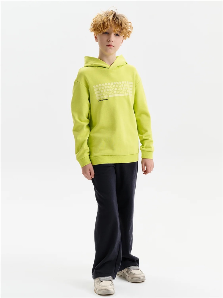 Худи для мальчика. Ткань футер-петля без начёса. Толстовка свободного покроя со спущенным плечом, углубленной проймой. Рукава, а также низ изделия на манжете из рибаны. Кофта без карманов. Капюшон объемный, без регулировки, отлично держит форму. Перевод текстов: клавиши к счастью: жми на кнопки.