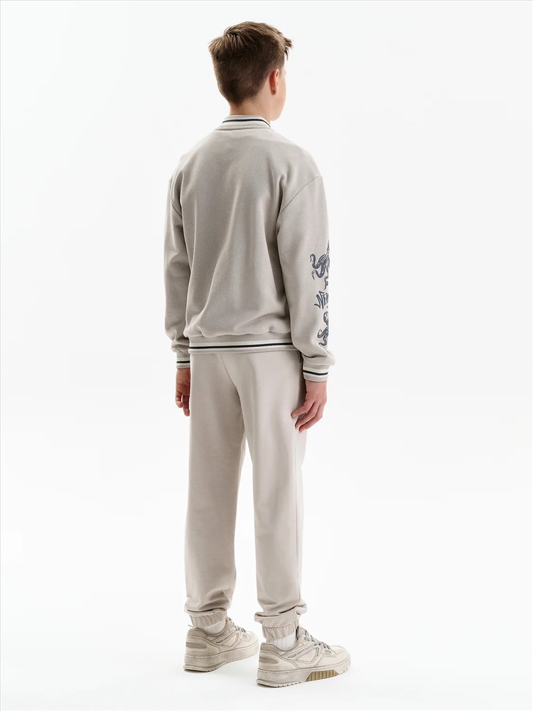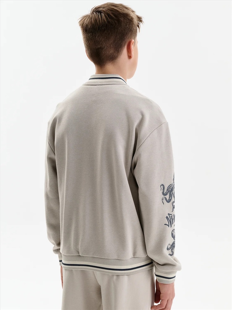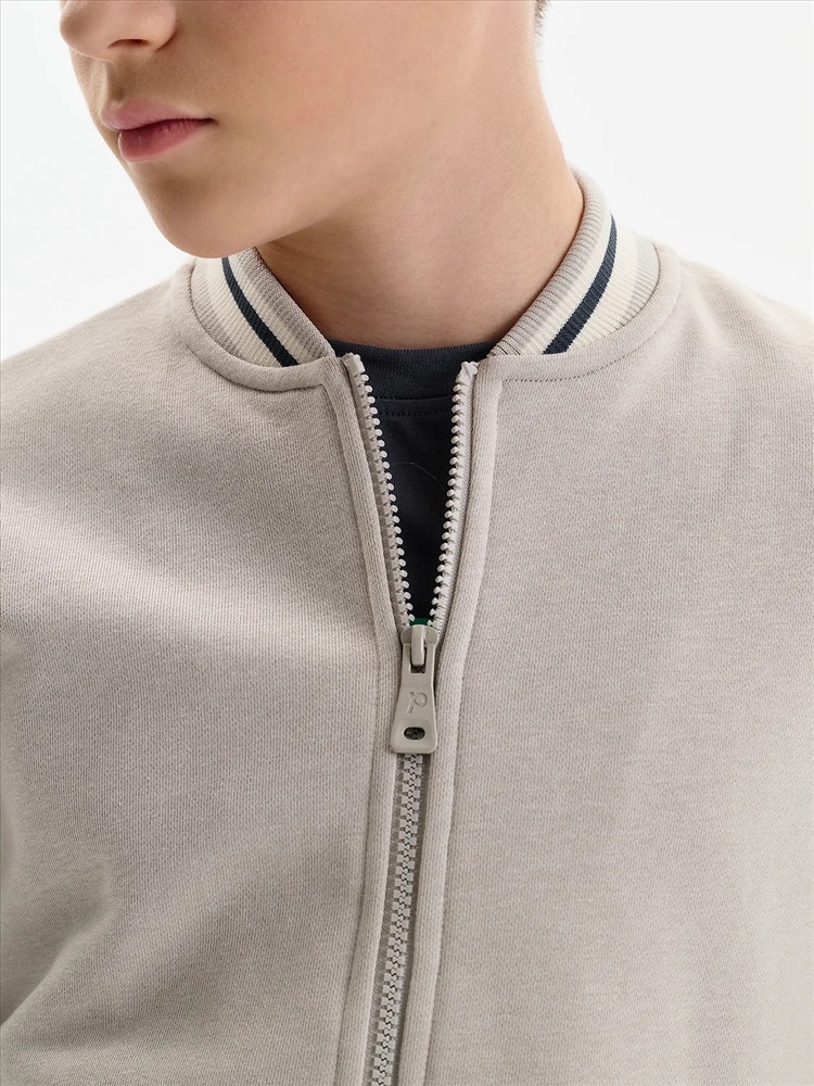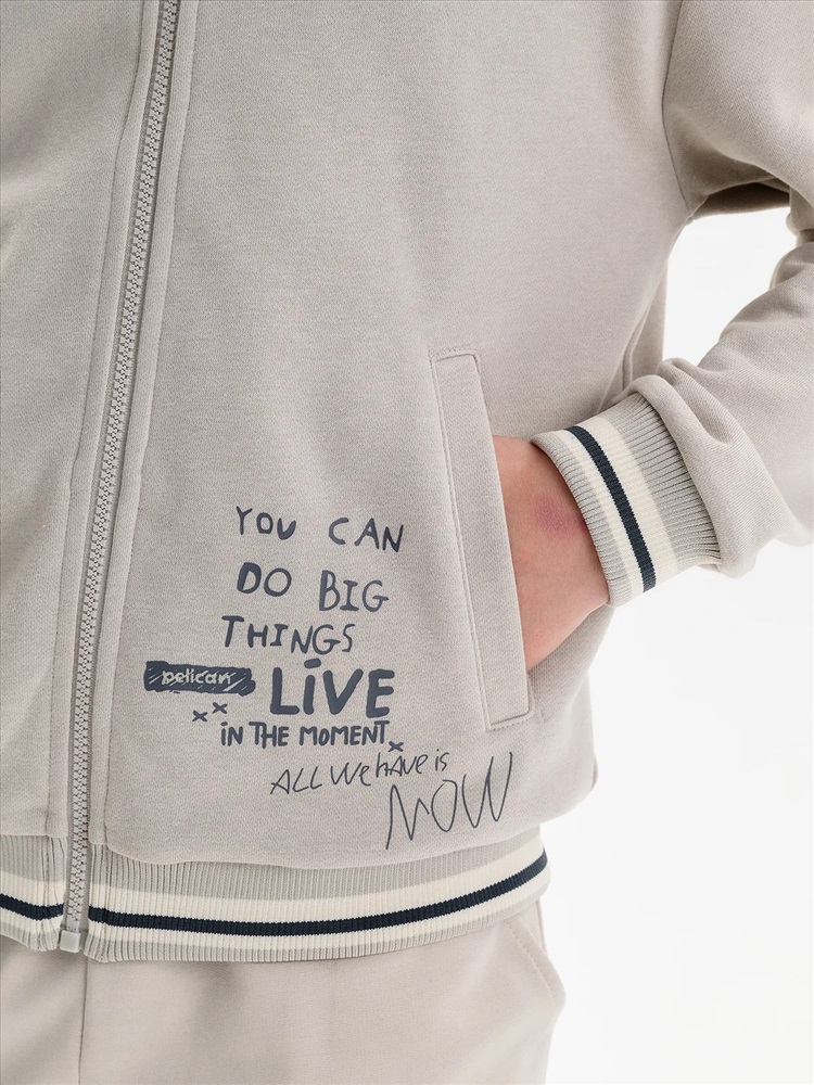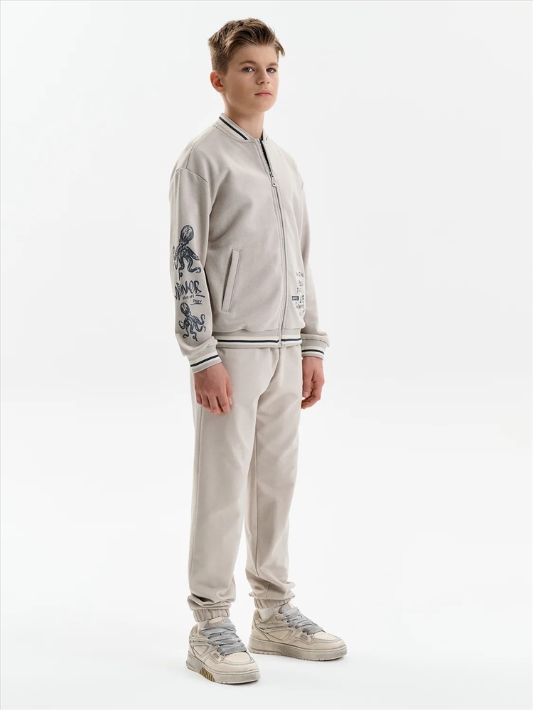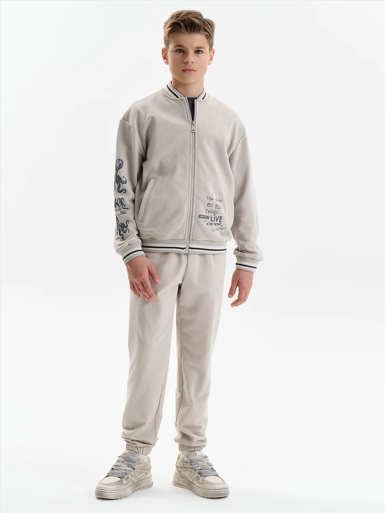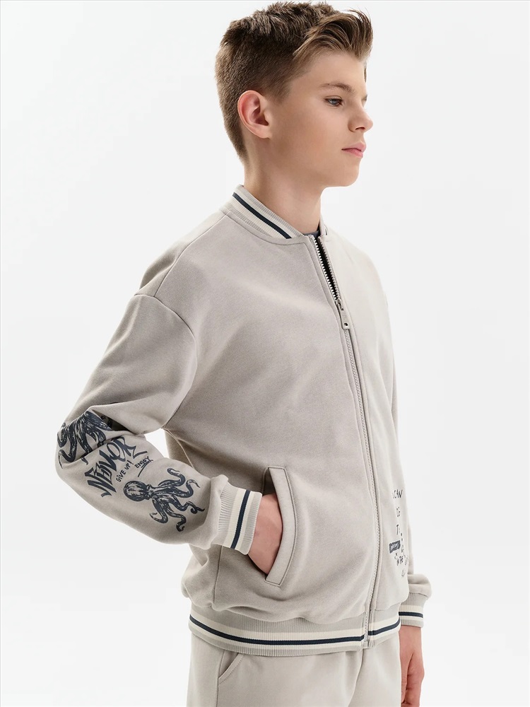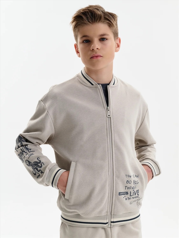 Бомбер для мальчика – трикотажная модель свободного кроя. Изделие выполнено из смесовой ткани с высоким содержанием хлопка и небольшим добавлением полиэстера.Бомбер на центральной застежке молнии, со спущенным плечом и углубленной проймой. Воротник, манжеты по рукавам и низу изделия - из декоративного полосатого риба. Боковые карманы с листочками расположены на переде под наклоном. Бомбер декорирован принтом и надписями. Перевод текста на рукавах: никогда не сдавайся: наслаждайся. Перевод на кармане: Ты можешь совершать великие дела. Живи настоящим. Всё, что у нас есть, — это настоящее.