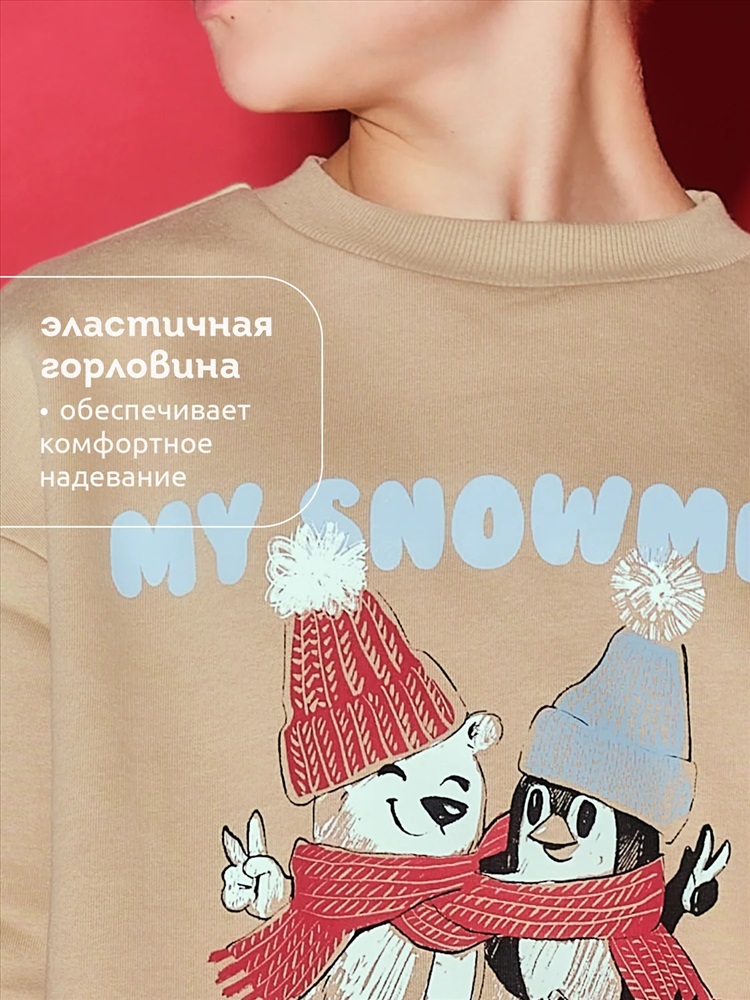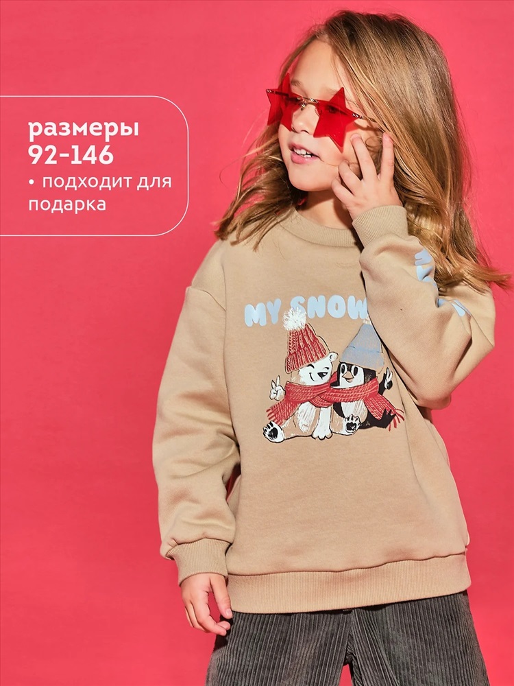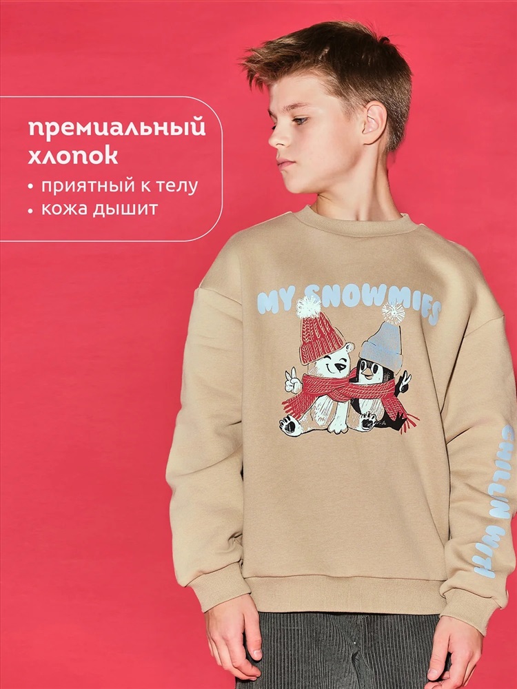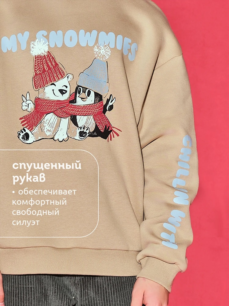 Свитшот детский с начесом. Свободная толстовка со спущенным плечом и углубленной проймой подарит ребёнку комфорт и стнет стильным дополнением гардероба. Свитшот для подростков девочек средней длины — актуальный модный тренд. Манжеты, отделка горловины и низа изделия выполнены из эластичной рибаны (ткани в рубчик). Она не растягивается, отлично сохраняет форму, при этом ребёнку удобно надевать и снимать свитшот. Модель неприхотлива в уходе. Свитшот с рисунком по переду и рукаву выполнен из футера с начёсом. Принты мягкие и стойкие, без проблем переносят частые стирки. В составе ткани преобладает высококачественый хлопок — толстовка приятна на ощупь и прекрасно пропускает воздух. Полиэстер помогает сохранить цвет и первозданный внешний вид надолго. Свитшот для мальчика выполнен в в универсальных цветах, которые легко сочетать с любыми брюками, джинсами. Оверсайз-свитшот подходит как для маленьких детей, так и для подростков. Джемпер идеален для детского сада, прогулок, активного отдыха, дома. Свитшот с принтом можно носить круглый год. Помните о правильном уходе за изделием: рекомендуется стирать при температуре не выше 30 °C, без предварительного замачивания, с изнанки. Это поможет сохранить качество и цвет куртки на длительное время. Перевод принта: "чилим с моими снежинками". Не забывайте о выборе правильного размера. Используйте таблицу размеров на фотографии, чтобы выбрать подходящий вариант для вашего мальчика. Обратите внимание, что цвет товара на экране вашего устройства может отличаться от реального.