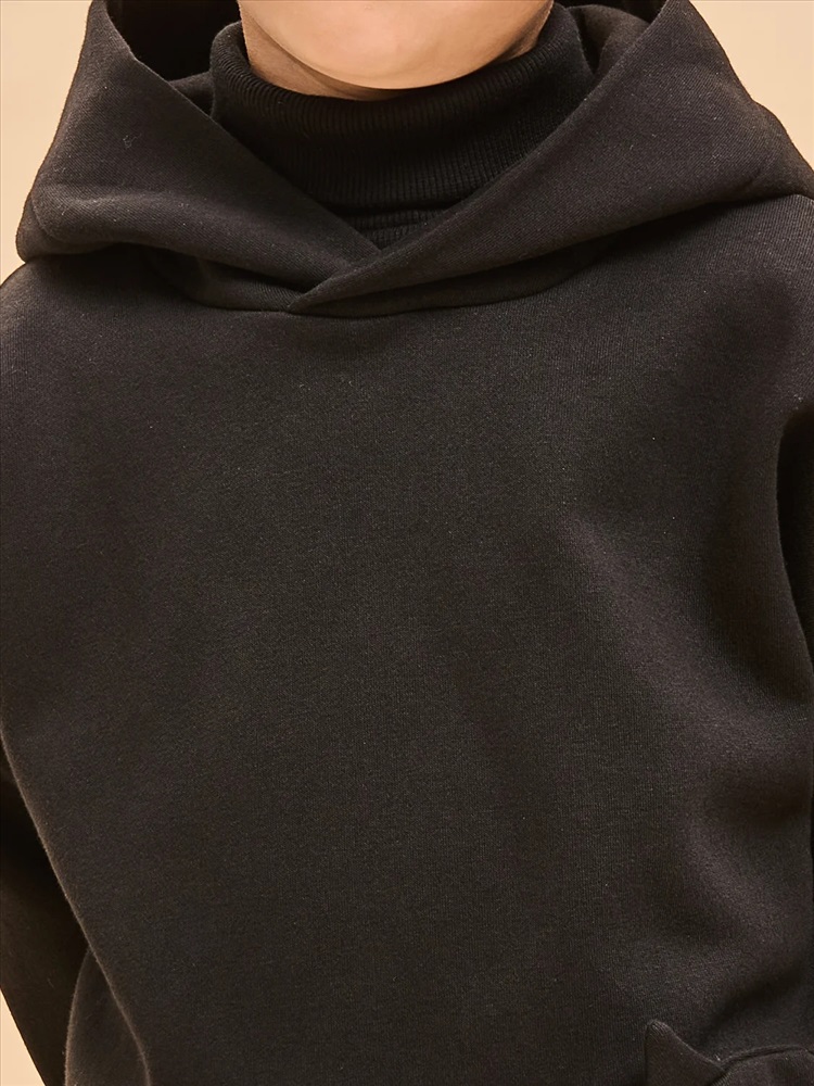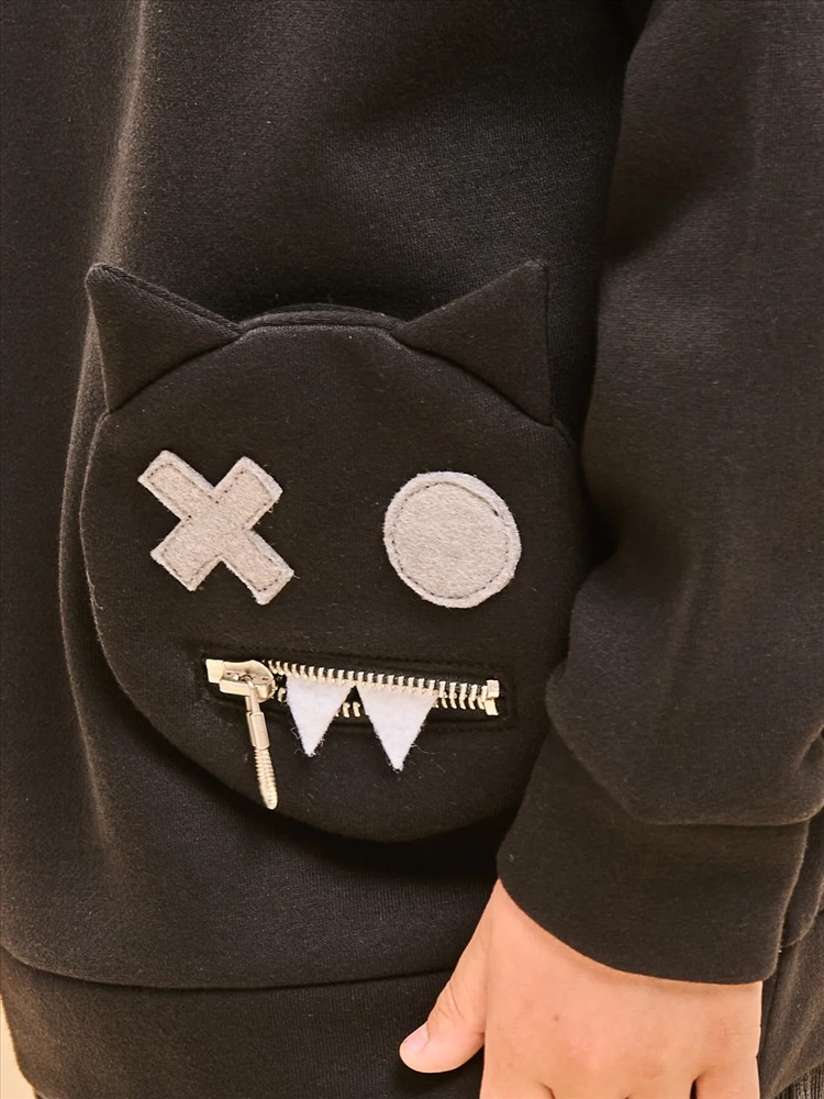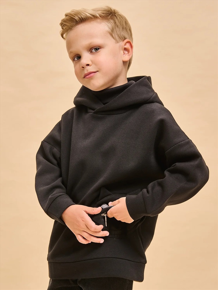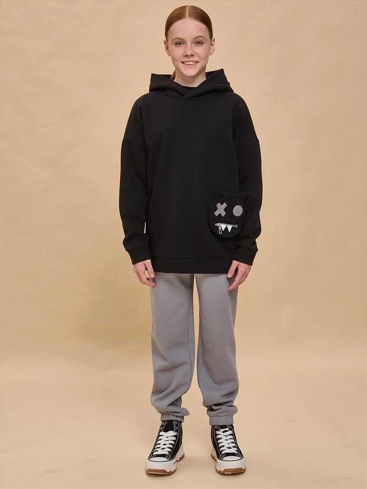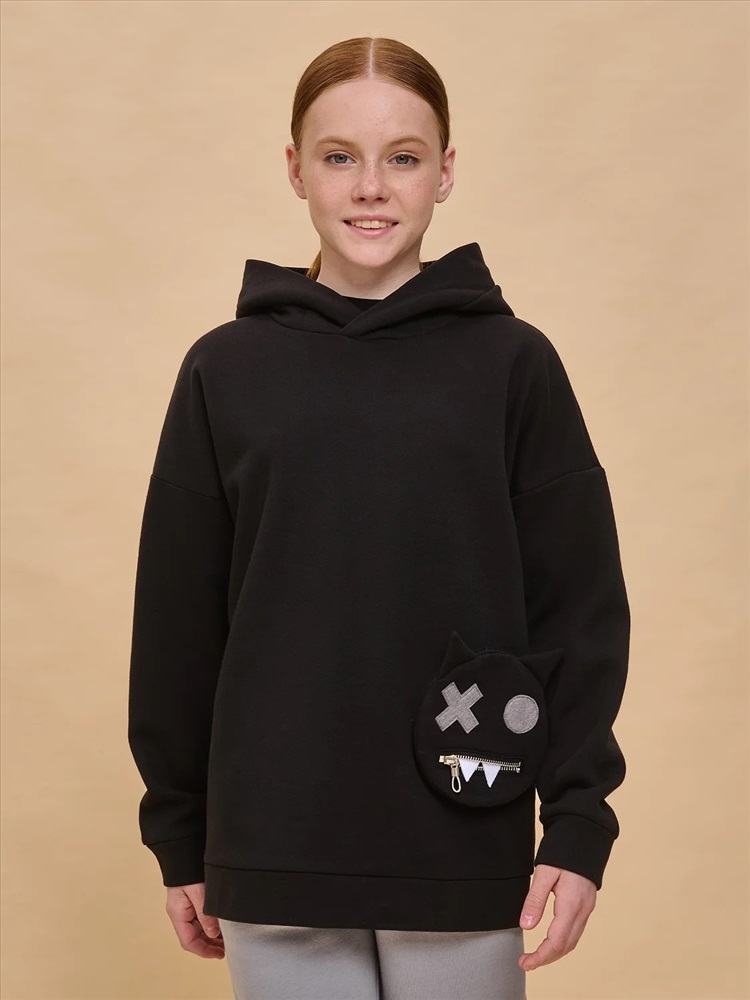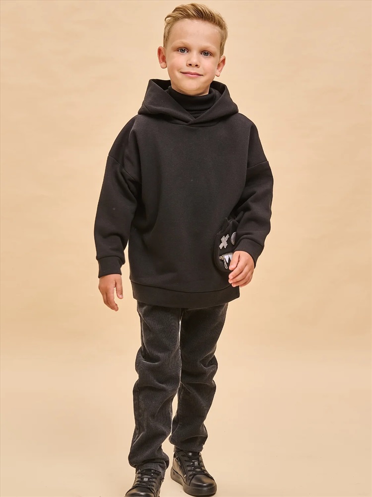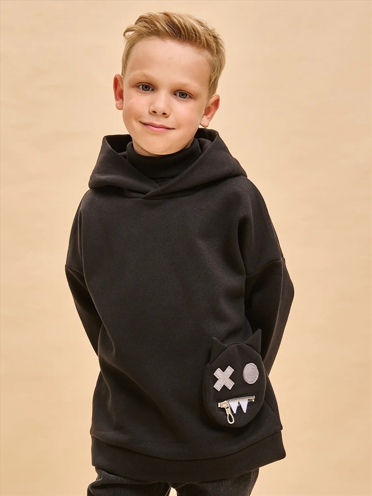 Худи детское овресайз. Модель унисекс — одинаково классно смотрится и на мальчиках, и на девочках. Удлинённое худи актуального оверсайз-силуэта со спущенным плечом подарит ребёнку комфорт и не будет сковывать его движений. Худи с капюшоном двухшовным — это обеспечивает анатомически правильную форму и комфортную посадку по голове. Модель неприхотлива в уходе. Худи детское оверсайз выполнено из ткани с высоким содержанием хлопка — джемпер мягкий, воздухопроницаемый и гипоаллергенный. Полиэстер помогает сохранить цвет и первоначальный внешний вид надолго. Главная супермодная фишка модели — объёмный карман-игрушка в актуальном готическом стиле. На кармане молния-ротик, глазки и зубки из фетра. Изделие выполнено в универсальной расцветке, его легко комбинировать с любыми брюками, джинсами. Отличное черное худи для детей дошкольного и младшего школьного возраста, а также подростков. Джемпер идеален для детского сада, прогулок, отдыха, дома. Худи оверсайз с капюшоном подходят для круглогодичной носки. Помните о правильном уходе за изделием: рекомендуется стирать при температуре не выше 30 °C, без предварительного замачивания, с изнанки. Это поможет сохранить качество и цвет худи на длительное время. Не забывайте о выборе правильного размера. Используйте таблицу размеров на фотографии, чтобы выбрать подходящий вариант для вашего ребенка. Обратите внимание, что цвет товара на экране вашего устройства может отличаться от реального.