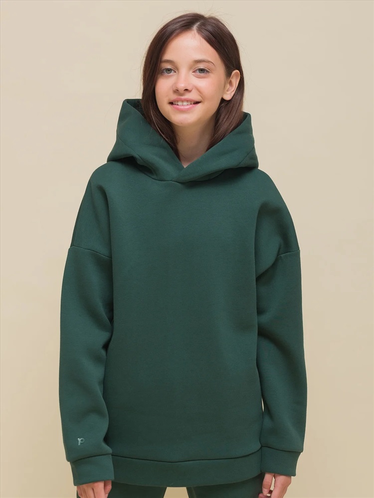 Худи для девочек и мальчиков из футера с начесом свободного силуэта с длинным рукавом, без карманов. Это однотонная базовая вещь для детского гардероба. Красивая и яркая одежда для ребенка, практичная и удобная при надевании для родителей. Двухшовный капюшон с подкладом из основного материала аккуратно ложится по голове и убережет от холода. Манжеты рукавов и низа изделия из основной ткани. Не утягивают, но придают силуэт. Деликатная изюминка модели - силиконовая буква P из логотипа бренда на правом рукаве.