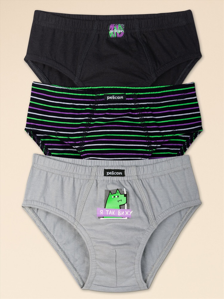 Выбирая бельё для своего ребёнка, любая мама заботится о его качестве и о том, чтобы ребёнку было удобно. Комплект трусов для мальчика (3 шт.) полностью соответствует этим запросам. В составе ткани 100% хлопка — трусы слипы приятны на ощупь, великолепно пропускают воздух, давая коже ребёнка дышать. Качественный натуральный материал и анатомически правильный крой гарантируют идеальную посадку на теле — ребёнку комфортно на протяжении всего дня. Мягкая широкая резинка в поясе исключает трение и дискомфорт. Трусы детские для мальчика представлены в трёх вариантах расцветки: чёрные в фиолетово-зелёную полоску, однотонные чёрные и серые с небольшим принтом в виде зелёной собаки и надписи "я так вижу" по переду. Принт мягкий и устойчивый, отлично переносит частые стирки. Трусы слипы для мальчика превосходно сочетаются с любой одеждой. В линейке представлены хлопковые трусы следующих размеров: 1 (86): 2 (92): 3 (98): 4 (104): 5 (110): 6 (116): 7 (122): 8 (128): 9 (134): 10 (140): 11 (146). Модель подходит малышам, мальчикам дошкольного возраста, младшего школьного возраста и мальчикам-подросткам. Отличный вариант детского белья для повседневной носки, спорта и отдыха. Модные трусы станут хорошим подарком сыну или внуку. Выбирайте нужный размер по таблице размеров на фото. Цвет товара на экране вашего устройства может отличаться от цвета изделия вживую. Товар возврату и обмену не подлежит.
