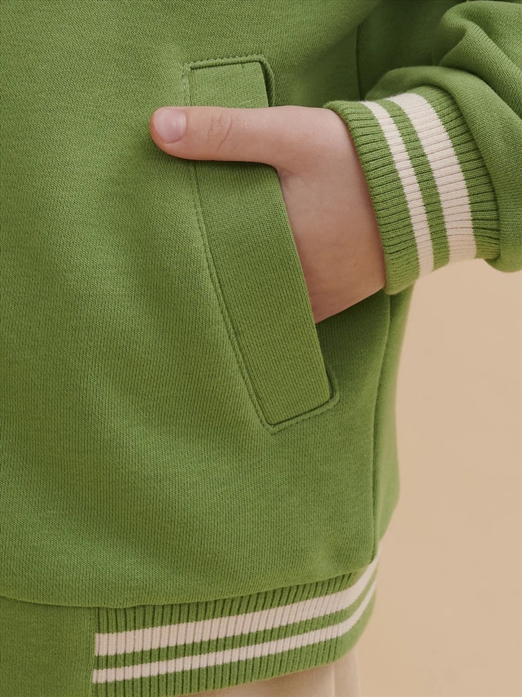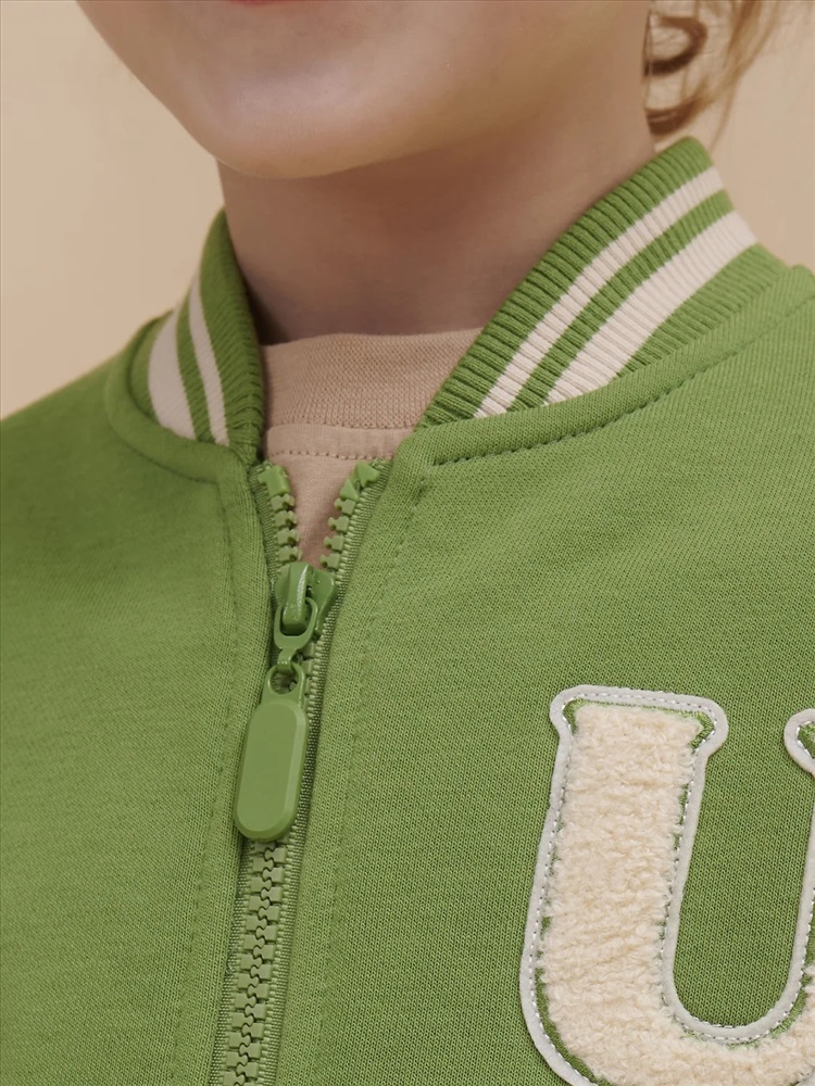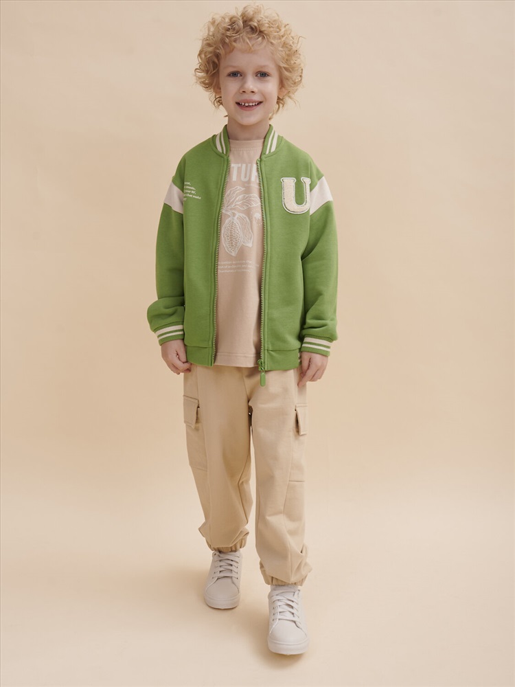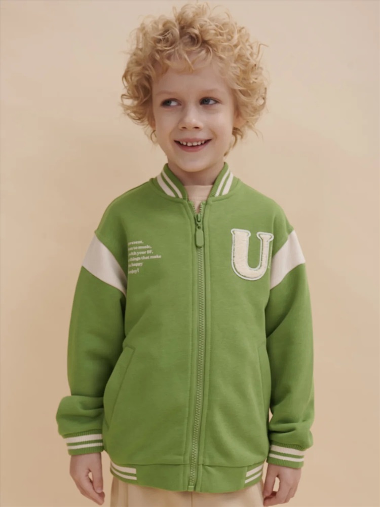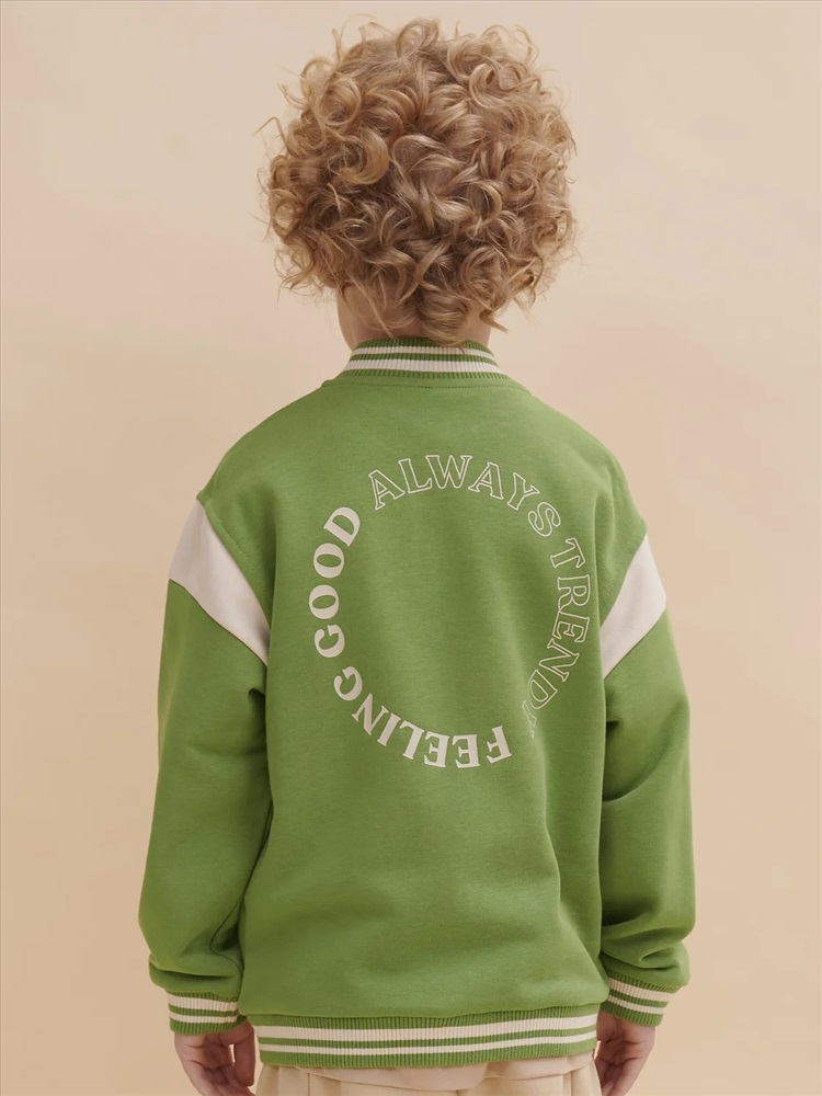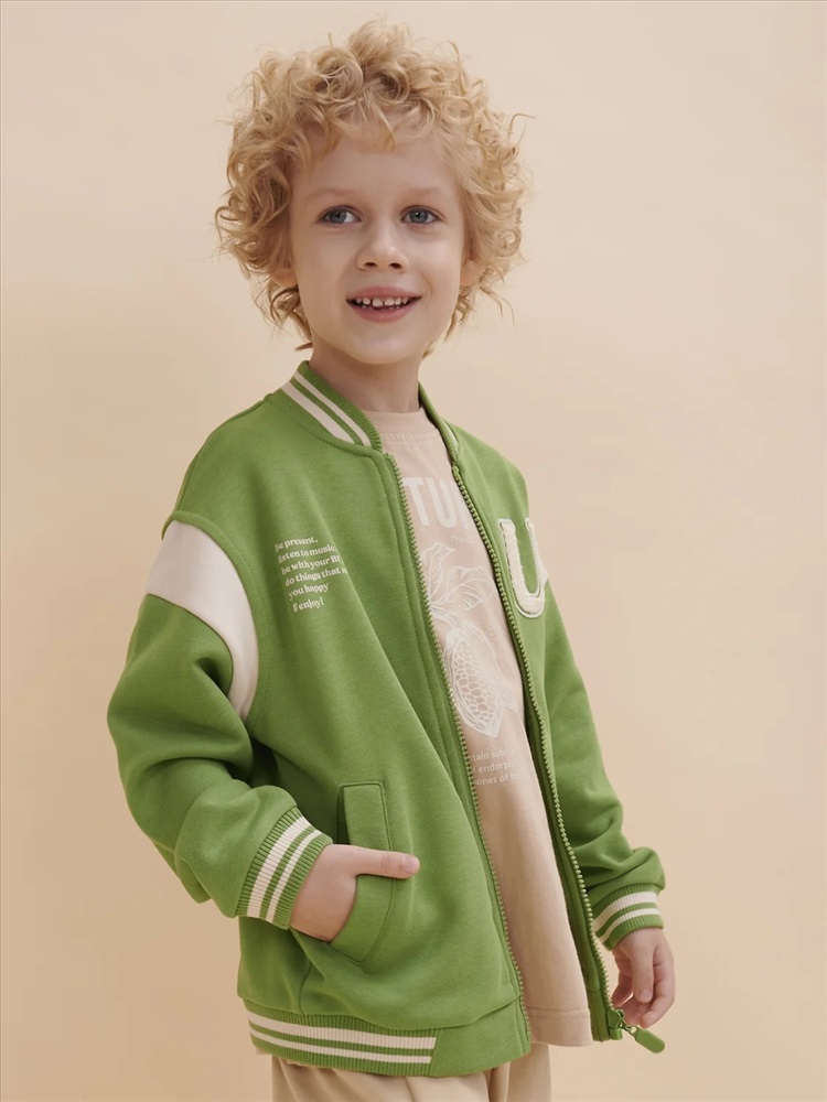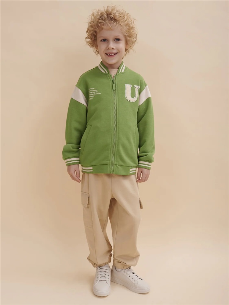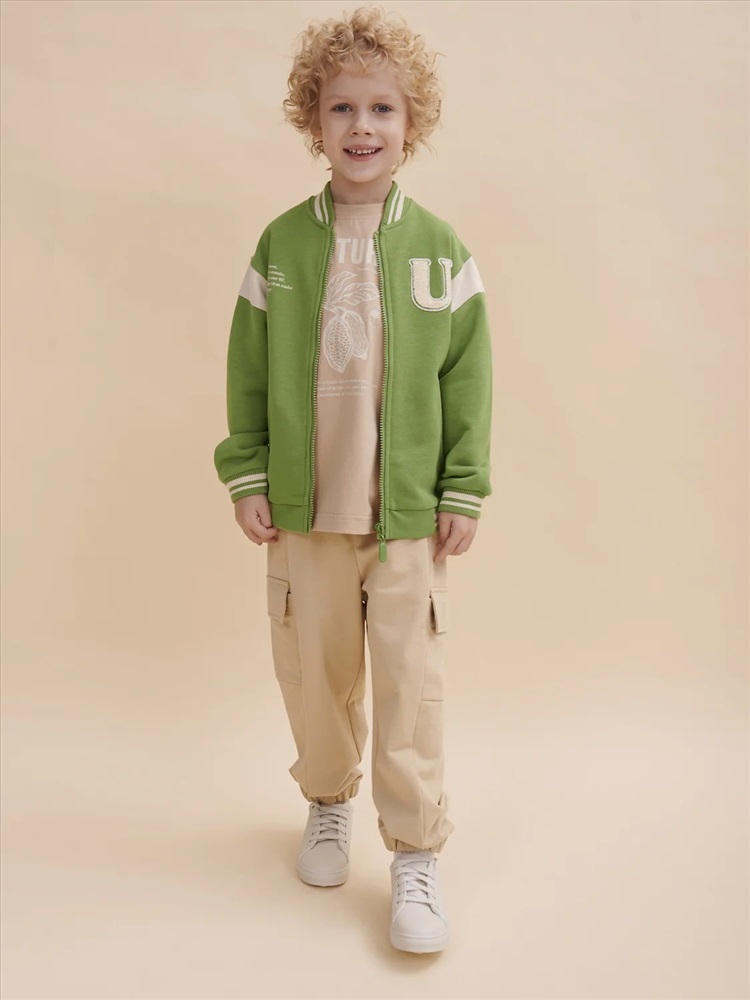 Бомбер для мальчика – трикотажная модель свободного кроя на позднюю весну, лето. Уютная вещь для создания стильного образа. Жакет для мальчика легко сочетать с любым низом, использовать для многослойных образов. Куртка бомбер для мальчика идеальна в качестве плотной кофты для прохладного помещения. Трикотажная куртка выполнена из смесовой ткани с высоким содержанием хлопка и небольшим добавлением полиэстера. Материал хорошо пропускает воздух, обеспечивает здоровую гигроскопичность. Ребенок не потеет и комфортно чувствует себя во время активных игр и занятий спортом. Наличие полиэстера наделяет жакет для мальчика повышенной износоустойчивостью к усадке, защитой от образования катышек. Изделие не линяет после стирки и сохраняет красивый внешний вид. Детский бомбер на центральной застежке молнии, со спущенным плечом и углубленной проймой. Воротник, манжеты по рукавам и низу изделия - из декоративного полосатого риба – стильная резинка в университетском стиле. На рукавах вставки из основного материала контрастного цвета. Боковые карманы с листочками расположены на переде под наклоном. Детский жакет для мальчика украшен модным университетским шрифтом с засечками. Перед декорирован нашивкой – объемной мягкой аппликацией из бербер-флиса (барашек) и графичной шрифтовой композицией. Меховая нашивка буквой "U": unity – перевод "единство, командная сплоченность". Надпись: "Be present, listen to music, be with you BF, do things that make you happy #enjoy!" - перевод "Живи в моменте, слушай музыку, встречайся со своим лучшим другом, делай то, что делает тебя счастливым #наслаждайся!". На спине круговая шрифтовая композиция: "Feeling good always trendy" - перевод "Хорошее настроение всегда в тренде (модно)". Куртка бомбер для мальчика подростка представлена в размере для малышей и школьников. Размерная линейка: 1 (86): 2 (92): 3 (98): 4 (104): 5 (110): 6 (116): 7 (122): 8 (128): 9 (134): 10 (140): 11 (146). Бомбер для мальчика - отличный подарок для сына, внука, братика, племянника, крестника! Выбирайте нужный размер по таблице размеров на фото. Цвет товара на экране вашего устройства может отличаться от цвета изделия вживую.