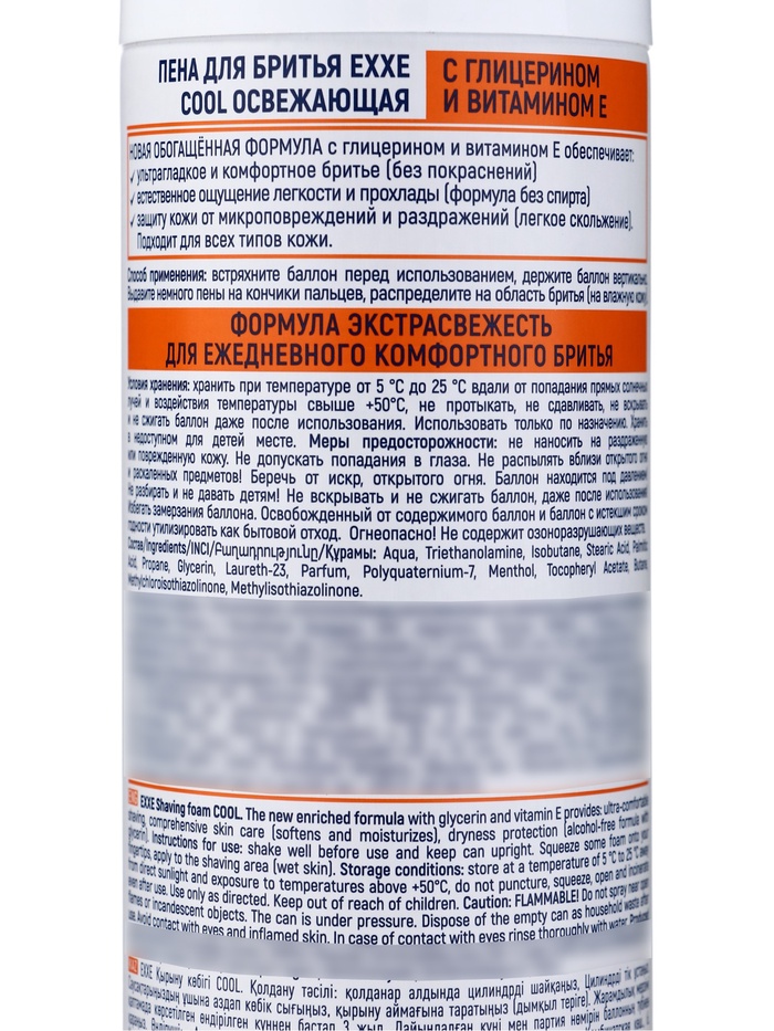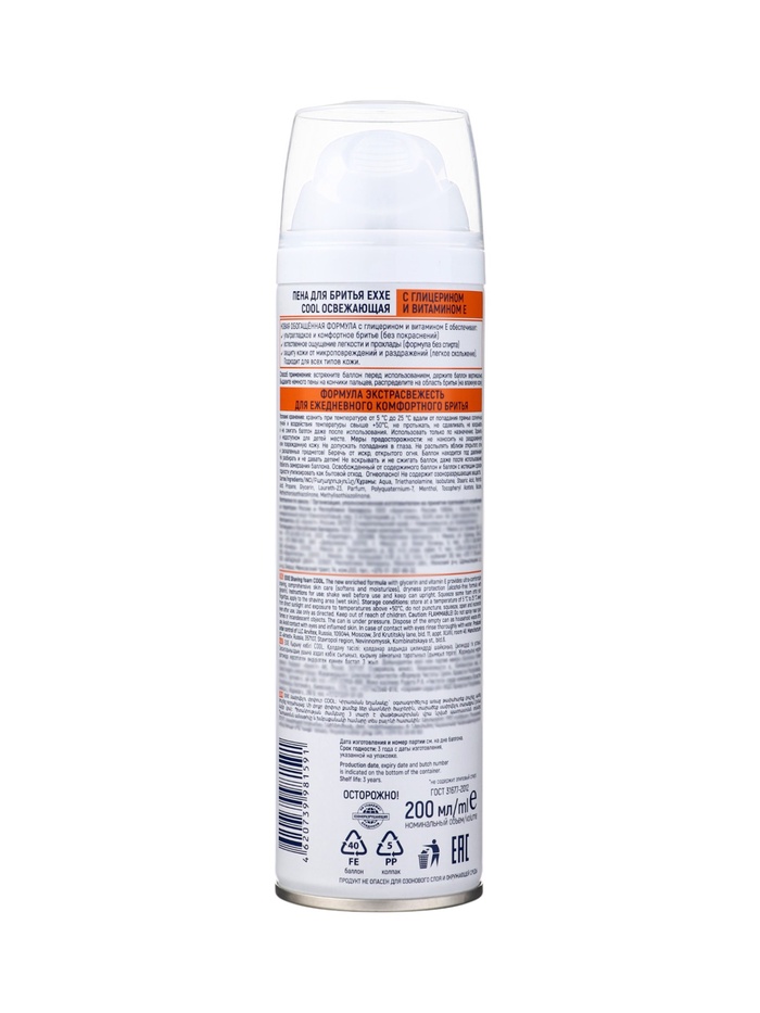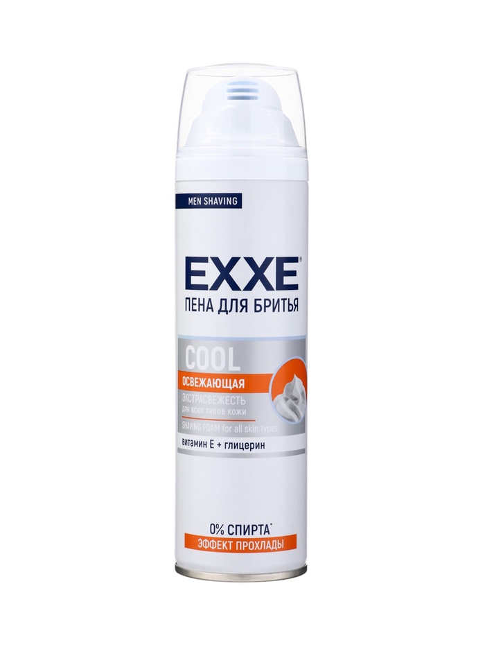 Пена для бритья Exxe Cool. Новая обогащенная формула с глицерином и витамином E обеспечивает ультрагладкое и комфортное бритье без покраснений, естественное ощущение легкости и прохлады формула без спирта с аллантоином, защиту кожи от микроповреждений и раздражений смягчает и увлажняет. Подходит для всех типов кожи.