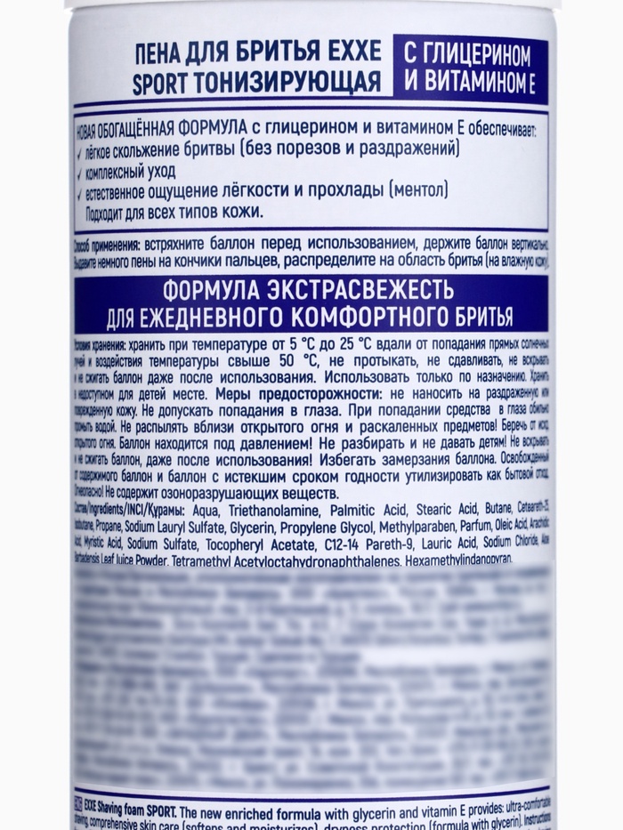Габариты: 20,5 x 5 x 5 Страна: Турция В боксе: 12 шт Состав: См. на упаковке Материалы: см. на упаковке Фасовка: по 1 шт Индивидуальная упаковка: Без упаковки Сертификат: ЕАС Набор: Нет Для кого: Для мужчины Объём, мл: 200 Применение: Для бритья Темпер. ограничение НЕ НИЖЕ ℃: 0 Тип кожи: Для всех типов В состав пены для бриья EXXE SPORT с ментолом входит максимум натуральных компонентов, которые не сушат кожу, питают и увлажняют её, обеспечивая плавное и легкое бритье. Глицерил смягчает и увлажняет, а ментол охлаждает, дарит ощущение прохлады. Повышенное пенообразование обеспечивает длительное время использования. Имеет ненавязчивый и приятный мужской аромат. Комментарии к товару