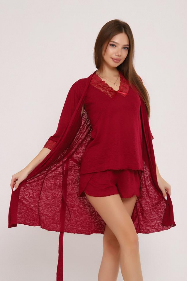 Женский кружевной комплект - именно то, что нужно для создания нежного и сексуального образа. Он состоит из пеньюара на запах и тройки из майки с шортами. В комплекте халат, который можно надеть поверх комплекта для создания дополнительного комфорта. Боковые швы шорт выполнены в нахлест, создавая по бокам разрезы, и обработаны окантовкой. Идеальный вариант для отдыха и сна. Материал изготовления - ДЕВОРЕ, который обладает дышащими свойствами и позволяет телу дышать, не вызывая дискомфорта.