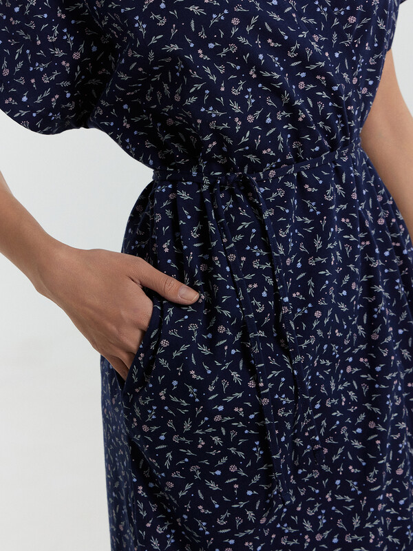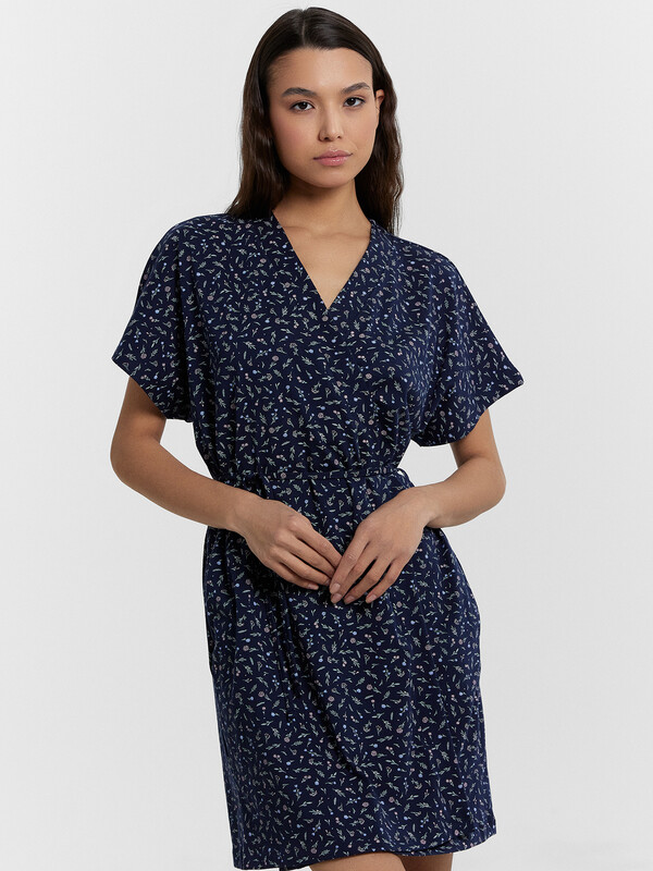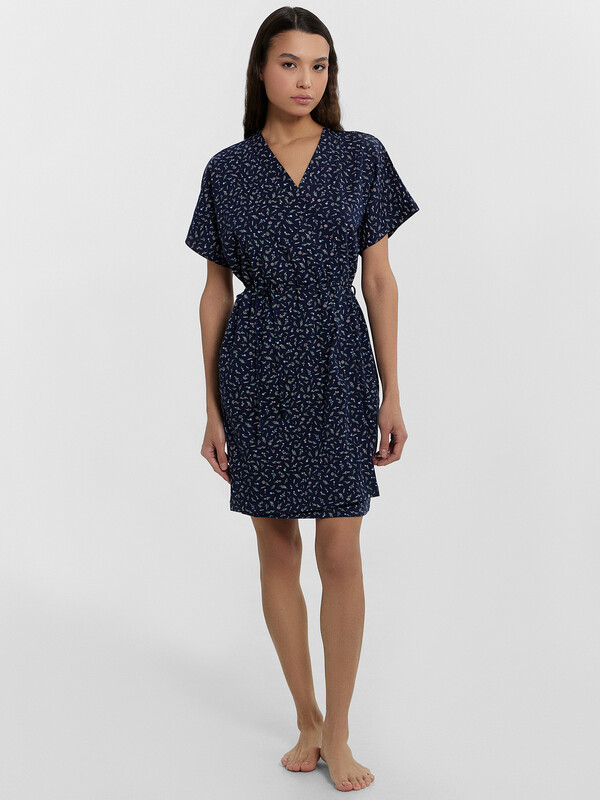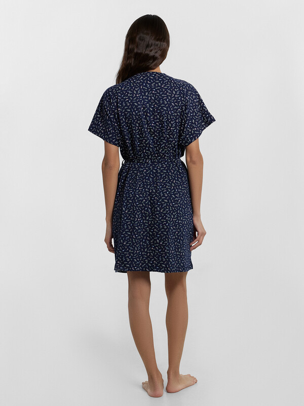 Производитель: Mark Formelle Хлопковый женский халат с короткими рукавами. Модель запахивается и дополнительно фиксируется с помощью тонкого пояса с декоративными кисточками. Длина халата чуть выше колена. Уютно и стильно!