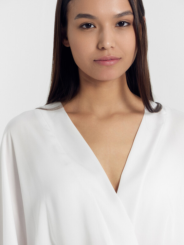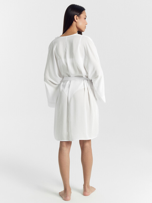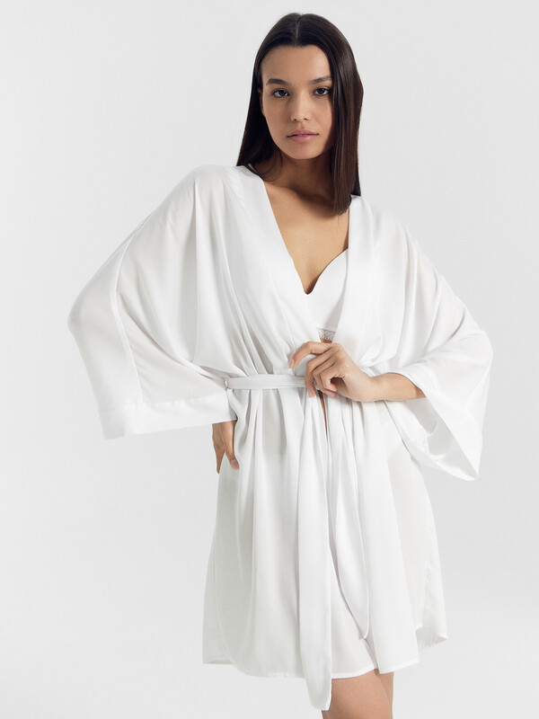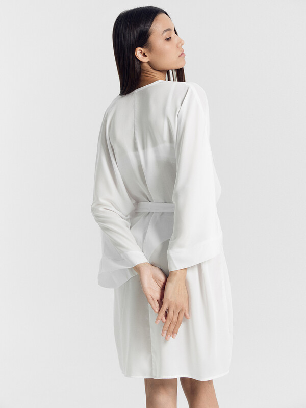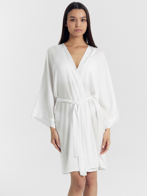 Халат прямого силуэта. Спинка состоит из двух деталей . Халат с запахом, со съемным поясом, продетым в шлевки в боковом шве. Концы пояса свободно завязываются. Рукава длинные, цельнокроеные. По горловине притачена бейка из основного полотна . Нижние срезы рукавов обработаны широкой подгибкой имитирующую манжеты. Низ халата обработаны швом в подгибку. Низ изделия обработан швом вподгибку.