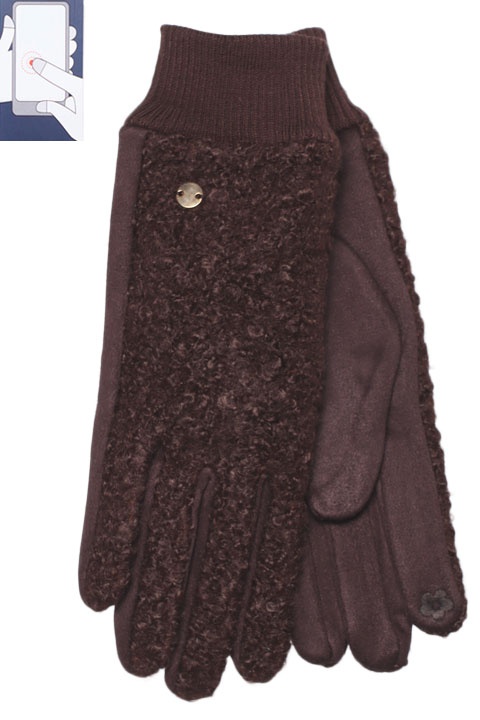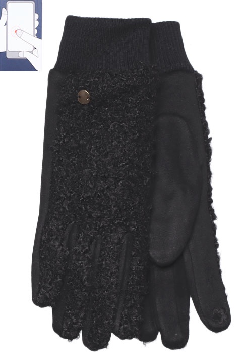 Перчатки сенсорные (нашивка на кончике указательного пальца). Комбинированные: ладонь иск.замша на велюровой основе, сверху - плотная, мягкая ткань "букле". Трикотажный манжет, шириной 4,5 см.