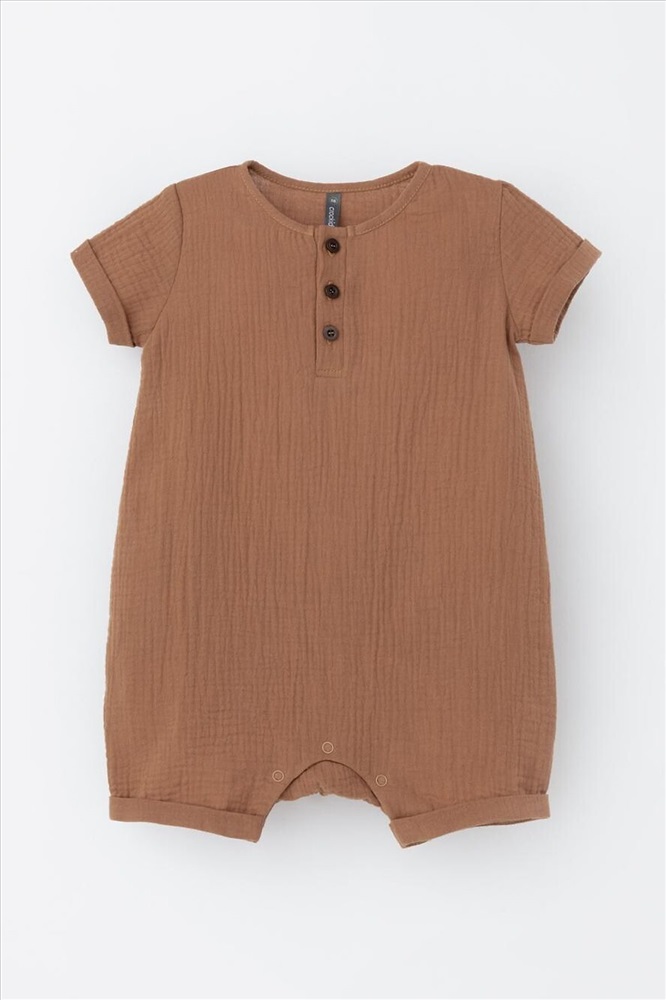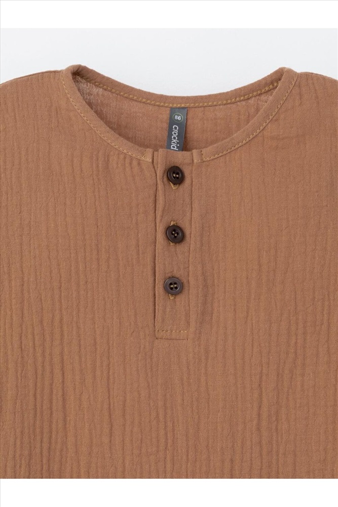 Легкий песочник для мальчика из мягкого хлопокового муслина с застежкой на пуговицы. Изделие сохраняет цвет, форму и фактуру жатости после многократных стирок.