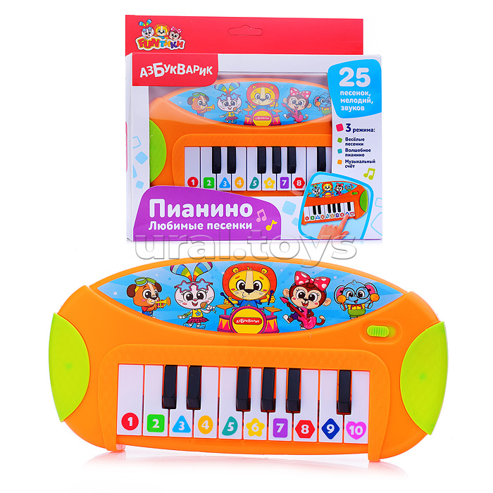 Код: 376088 Штрихкод: 4630027292728 Страна производитель: Китай Размеры упаковки: 20 x 24 x 4 см Количество в коробке: 30 Яркое пианино для маленьких музыкантов! Выбирай один из трех режимов – играй и пой, учись и веселись! В режиме «Веселые песенки» ребенок послушает 10 детских хитов («Как чудесно жить на свете!», «Зарядка», «Вот как весело считать», «Бум-Бум», «Всё разноцветное вокруг», «Что такое праздник?» и др.). Режим «Музыкальный счет» – это самое оригинальное обучение счету! Малыш будет нажимать клавиши – петь по нотам и учить цифры. А в игре «Волшебное пианино» ребенок сможет сам сыграть на клавишах пять известных мелодий: «Песенка про кузнечика», «Каравай», «Два весёлых гуся», «Серенький козлик», «Во саду ли, в огороде». Игры с таким пианино прекрасно развивают музыкальный слух и память, а еще дарят отличное настроение! Размер: 22 х 11 х 3,3 см. Материал: пластик. Для детей от 3-х лет. Соответствует требованиям безопасности продукции. Комментарии к товару
