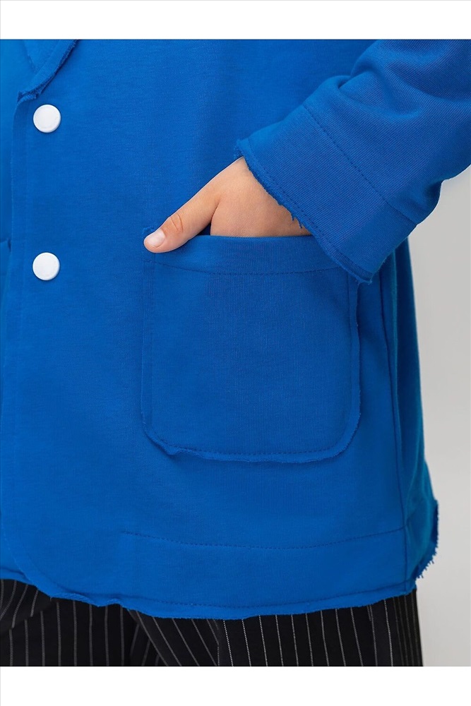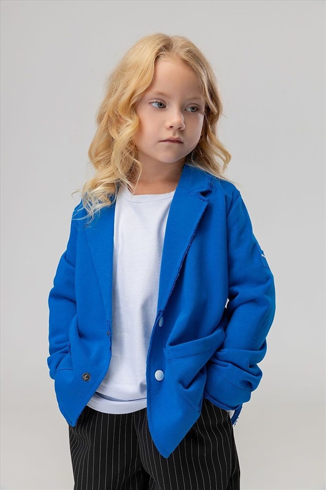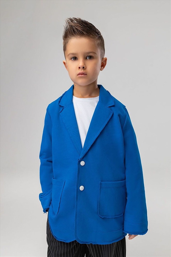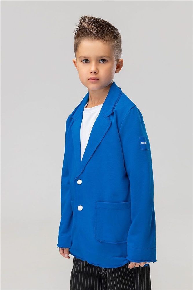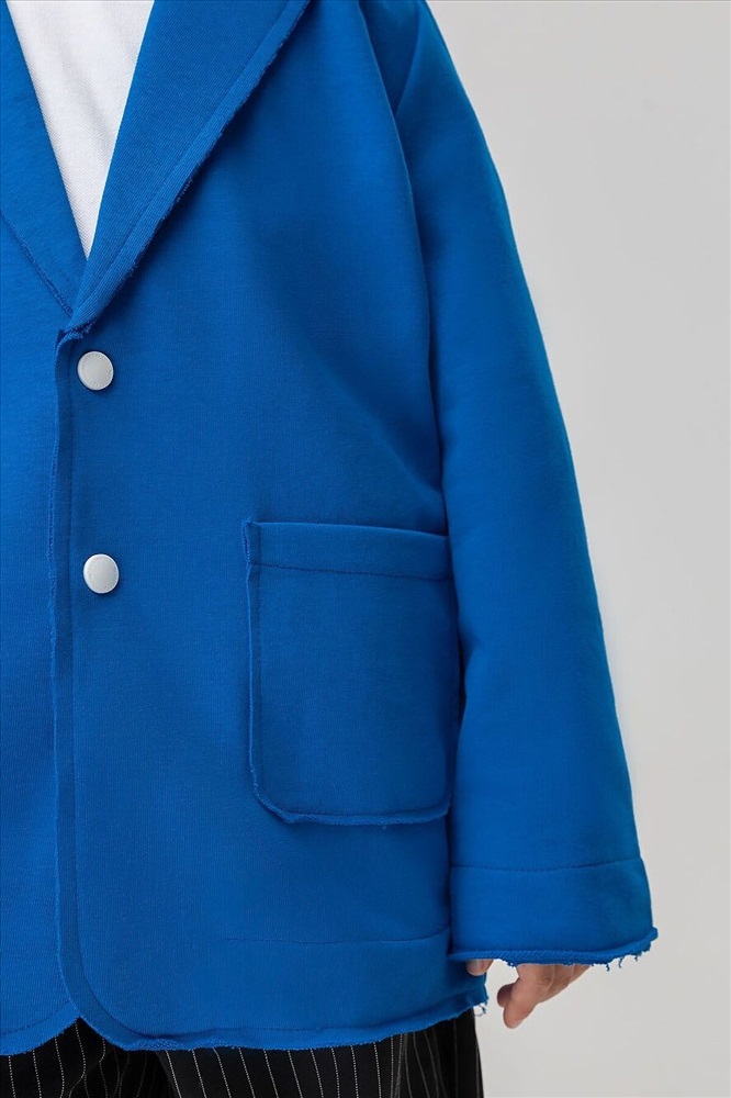 Пиджак с необработанными краями на кнопках. Прямой пиджак без подкладки, отложной воротник, на полочке два накладных кармана с необработанными краями.