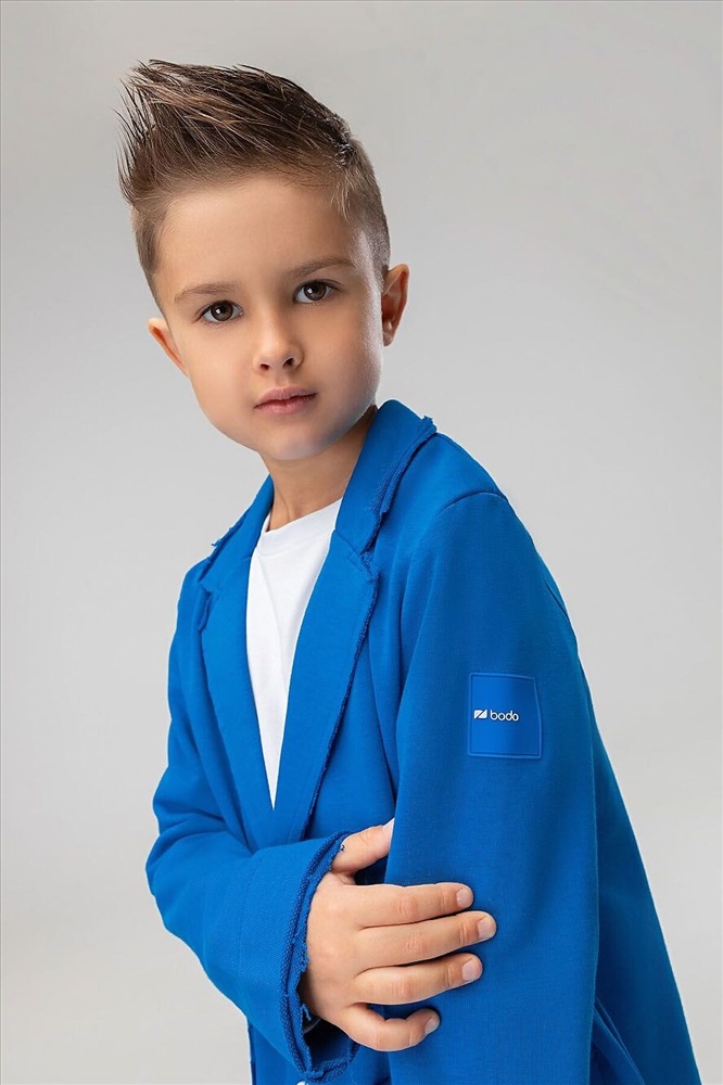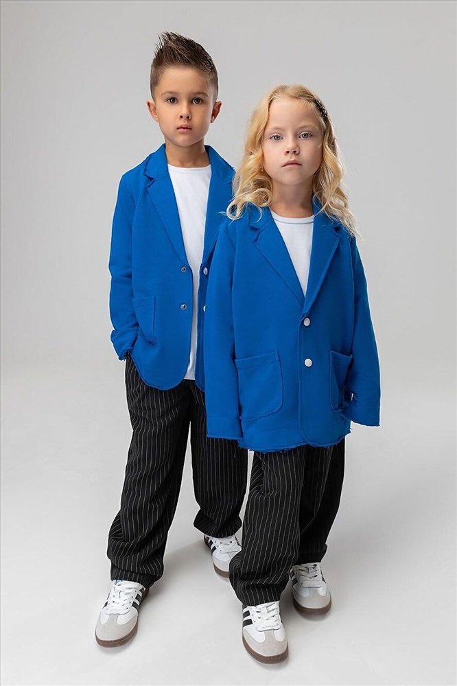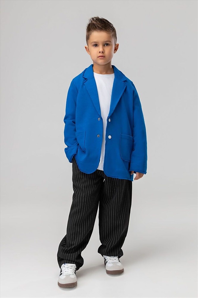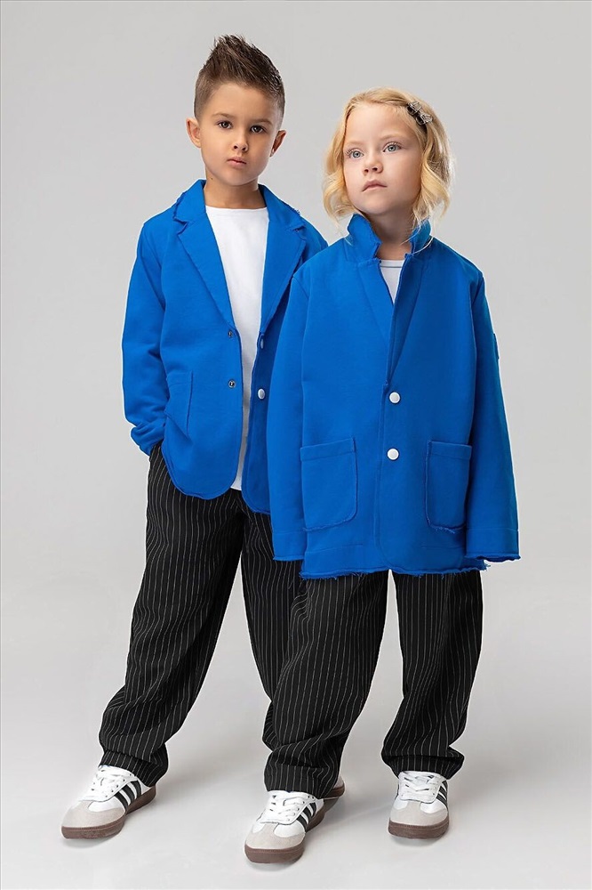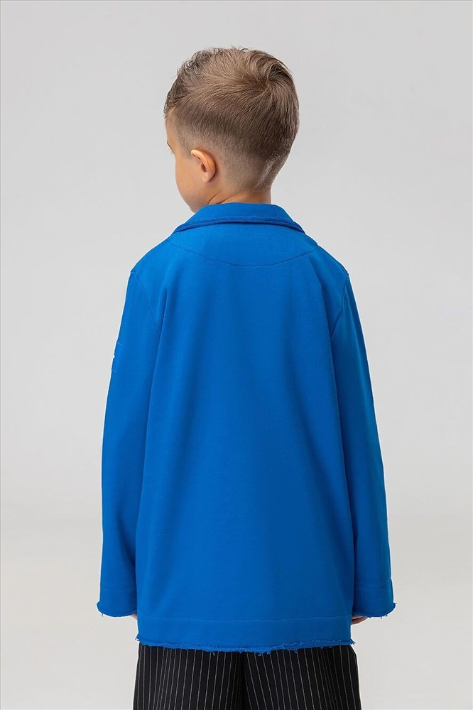 Пиджак с необработанными краями на кнопках. Прямой пиджак без подкладки, отложной воротник, на полочке два накладных кармана с необработанными краями.