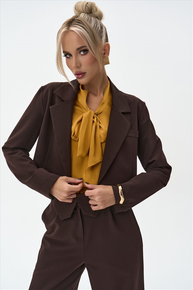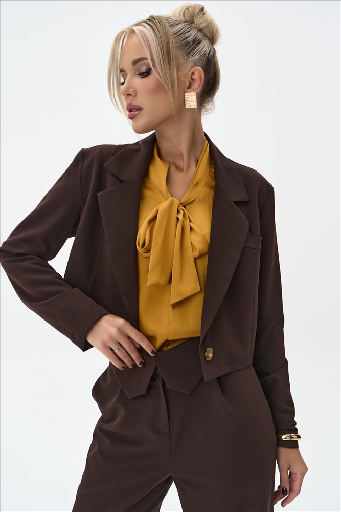 Жакет — укороченного кроя, с акцентированной линией плеч и классическим отложным воротником. Застёгивается на одну пуговицу, что визуально вытягивает силуэт и подчеркивает талию.