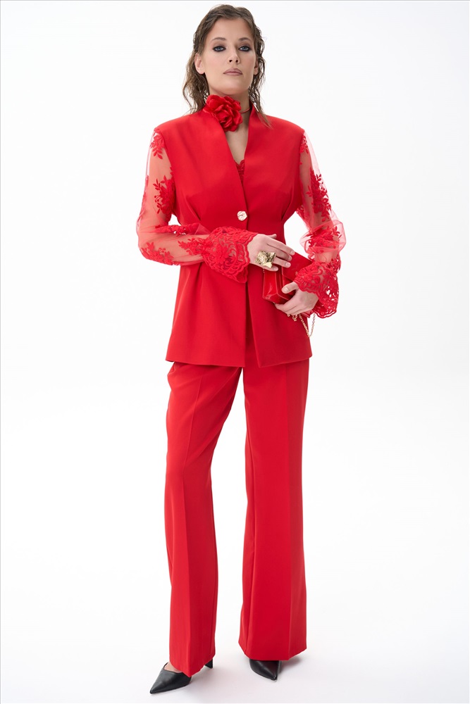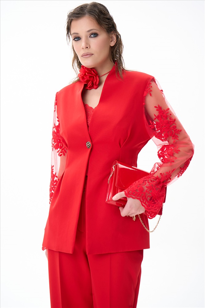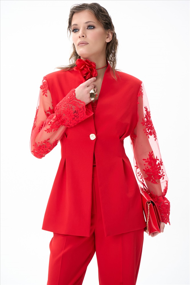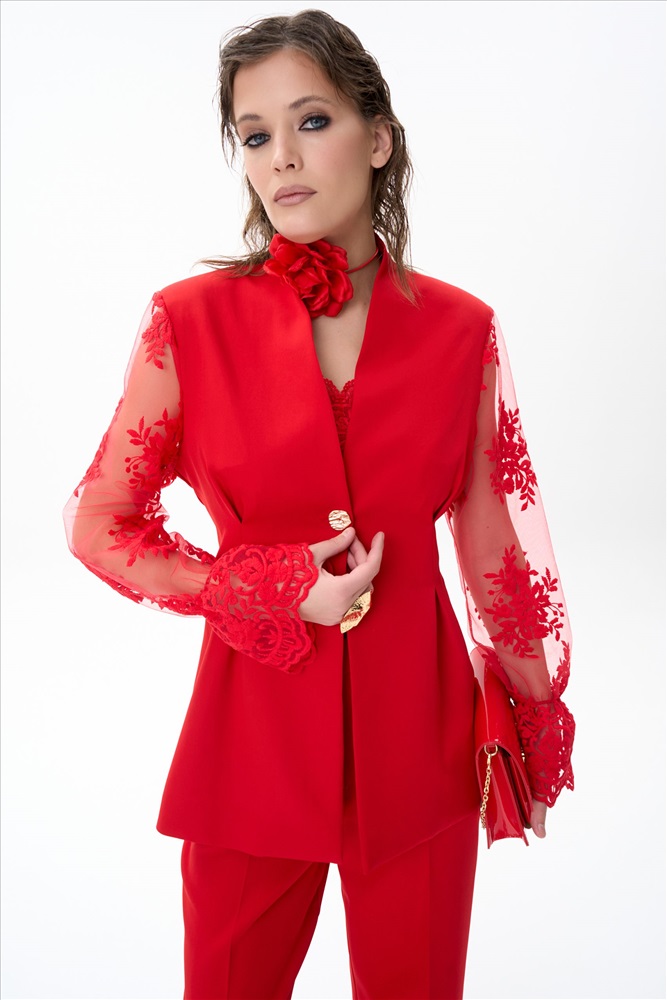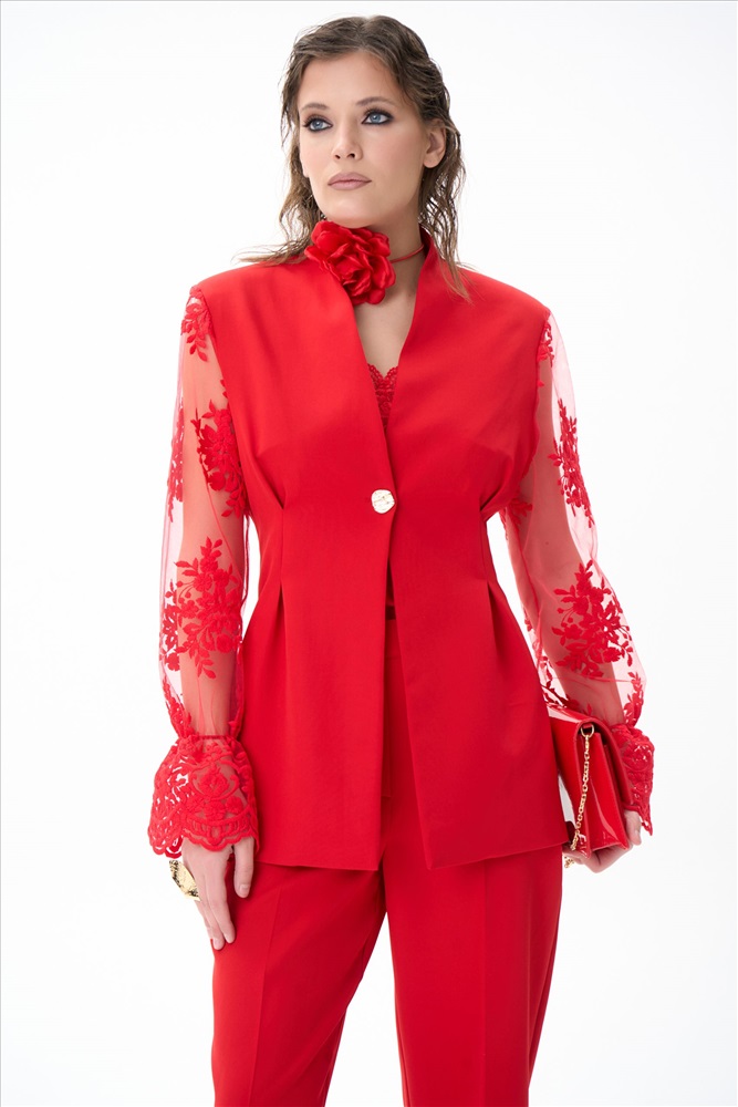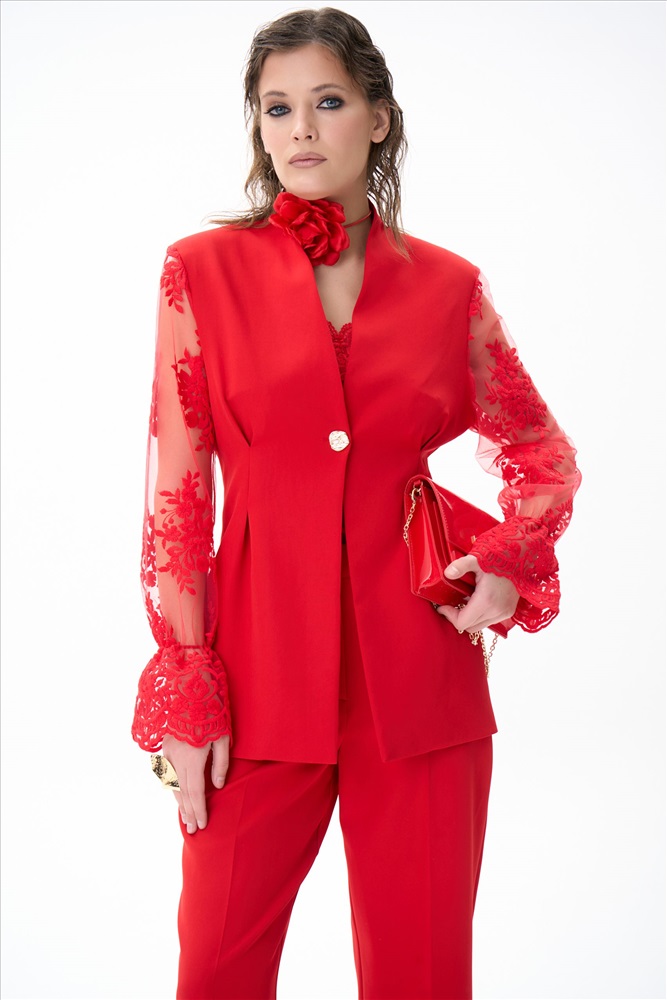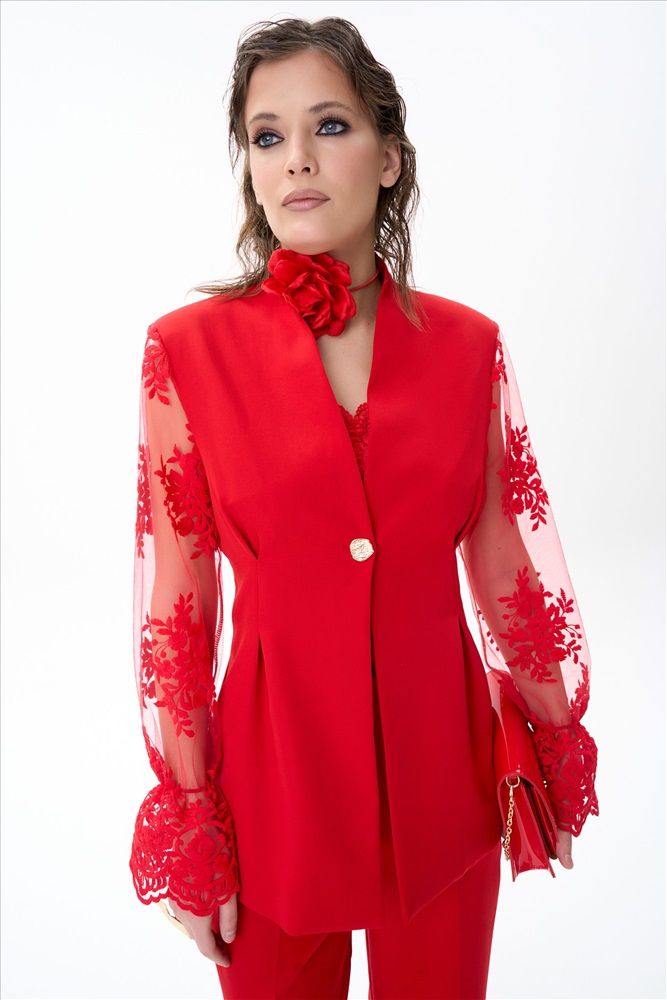 Современный и утончённый пиджак, который станет центром любого образа. Его изящный приталенный силуэт подчёркивает талию и создаёт элегантный силуэт, идеально подходящий как для офиса, так и для торжественных случаев. Однобортная застёжка на одну пуговицу добавляет сдержанной изысканности, а кружевные рукава придают образу лёгкость и романтичность. Кружево мягкое и приятное к телу — оно абсолютно не колется и не раздражает кожу.