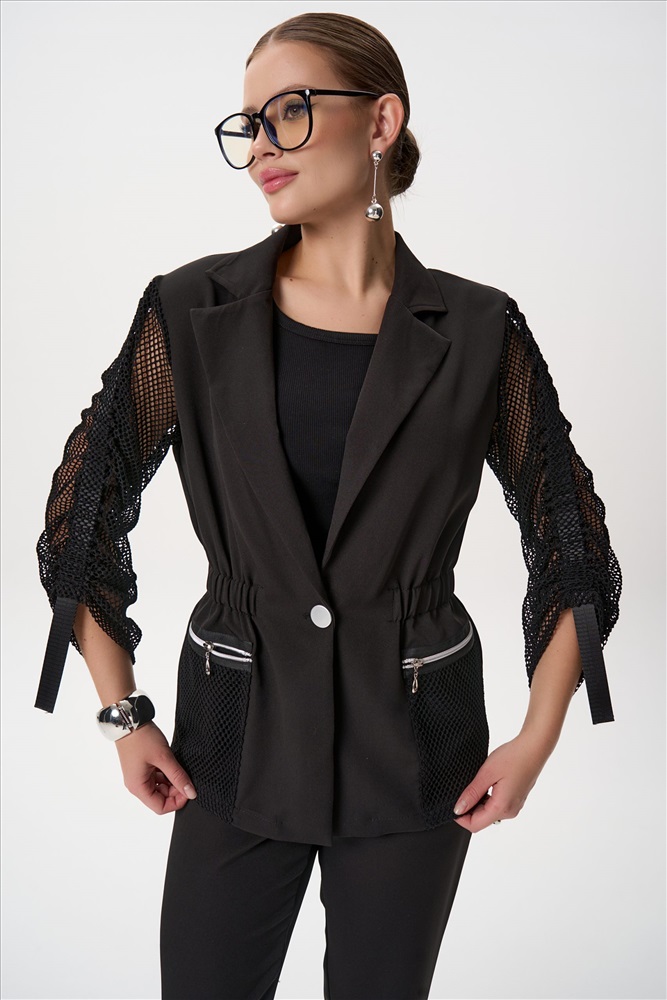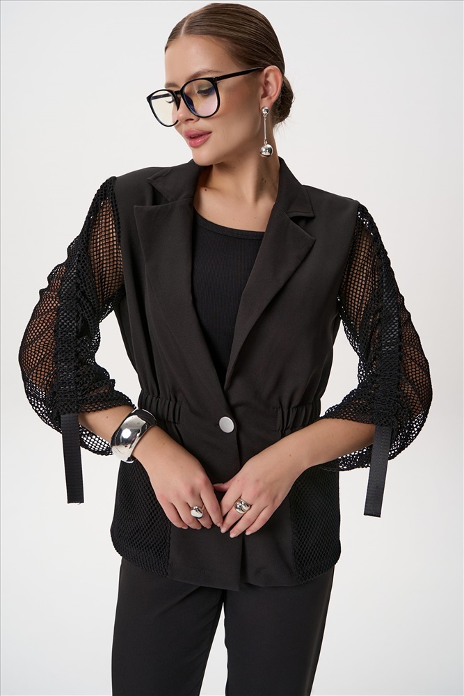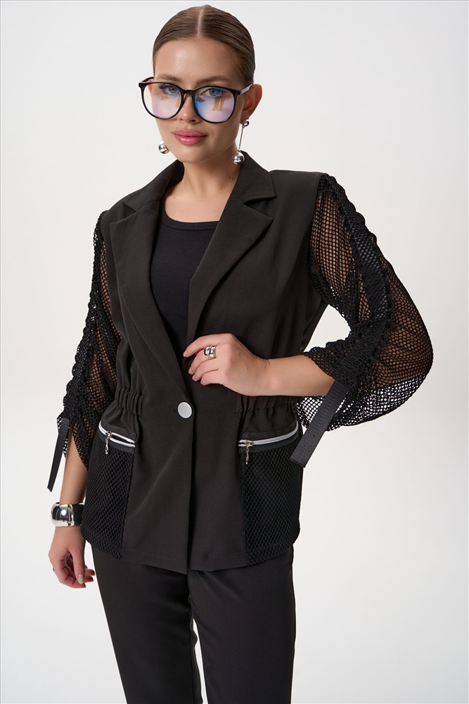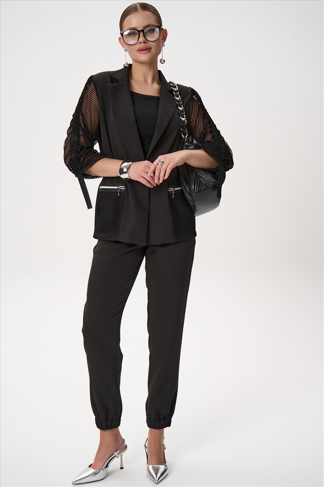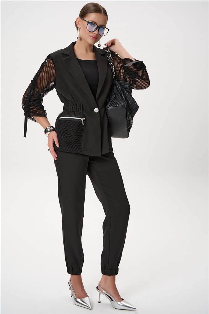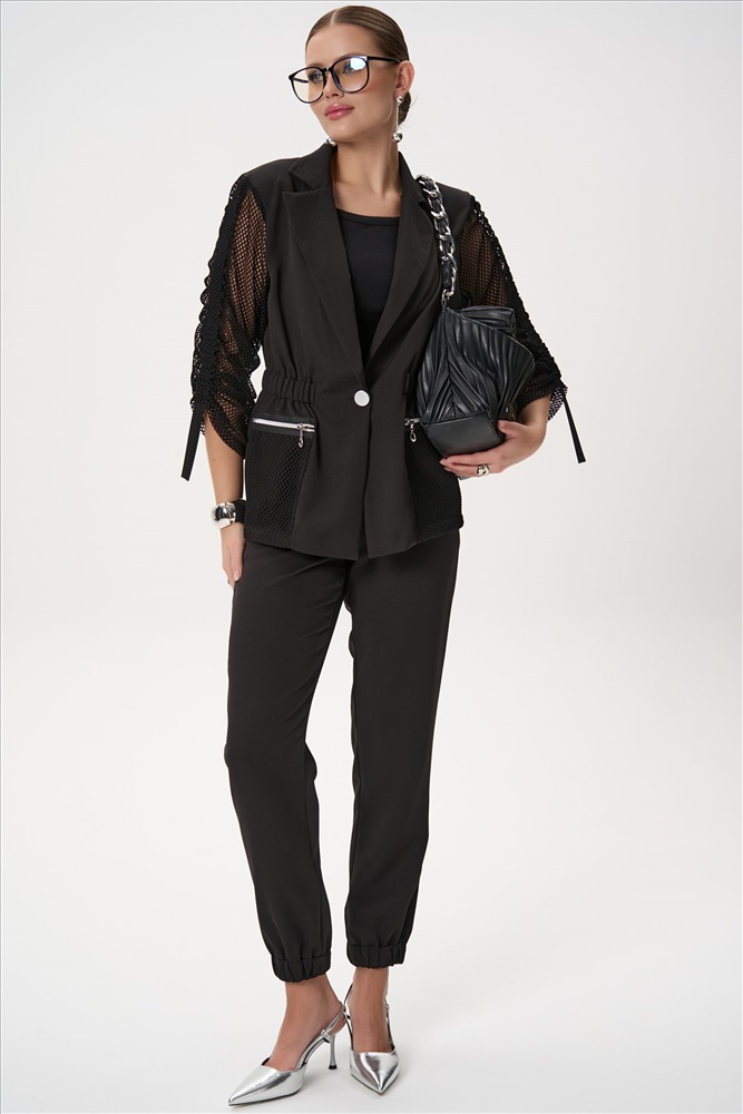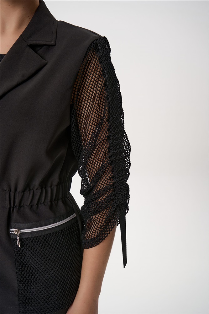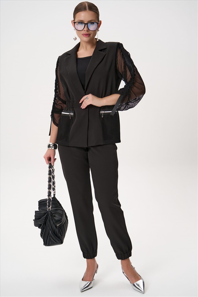 сочетание гладкой костюмной ткани и сетки создаёт эффект многослойности;