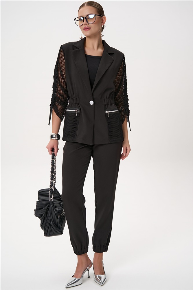 Функциональный костюм, сочетающий архитектуру классического жакета и комфорт повседневной одежды. Модель создана для активного городского ритма: выглядит собранно и элегантно, при этом обеспечивает свободу движения и удобство в течение всего дня.