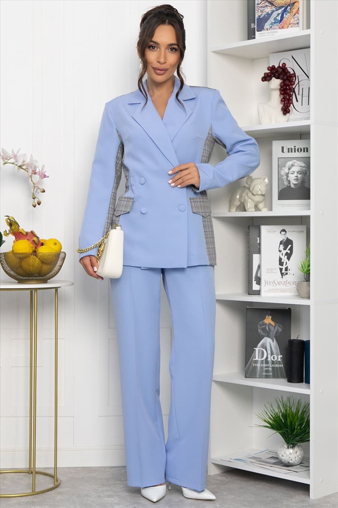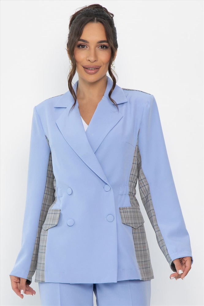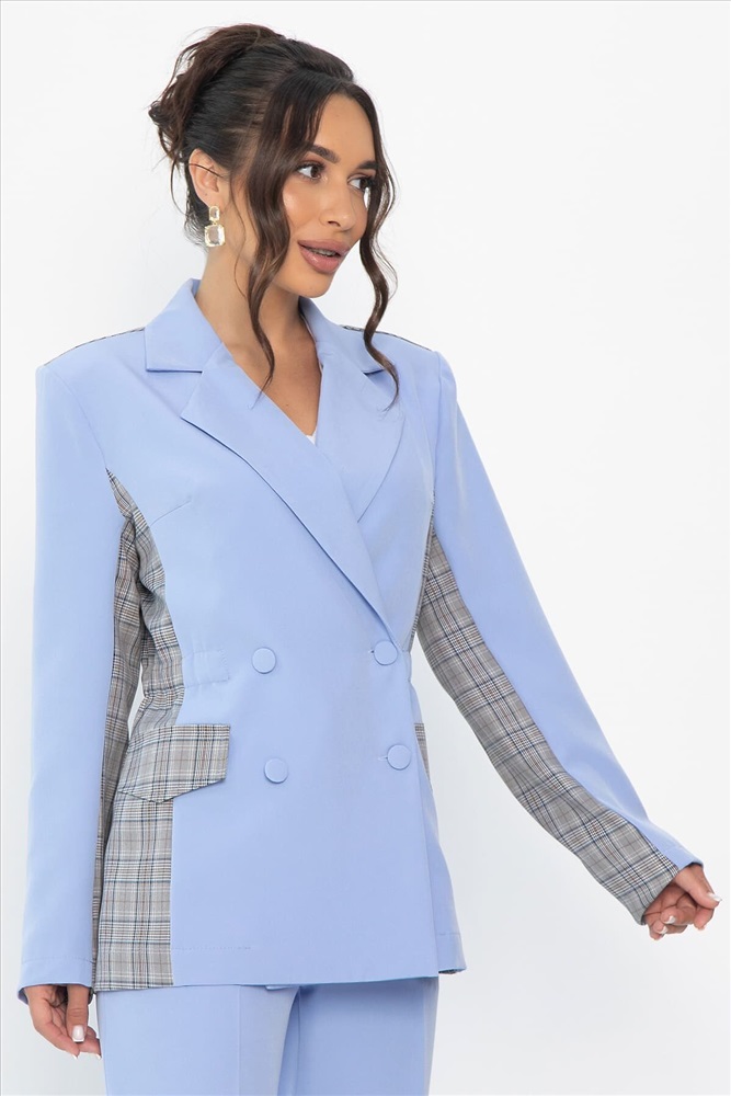 Добавьте в свою коллекцию элегантный пиджак, который подчеркнёт вашу фигуру и создаст неповторимый образ. Модель в двухцветном исполнении: однотонный голубой цвет гармонично сочетается с клетчатой тканью. Резинка на спинке, накладные клапаны и пуговицы придают изделию изысканность и комфорт. Этот пиджак станет основой вашего гардероба, позволяя создавать стильные образы для работы, встреч и торжественных событий.