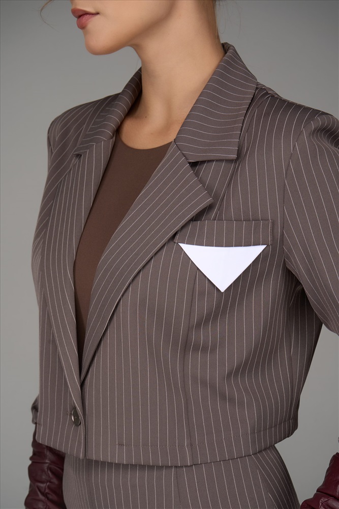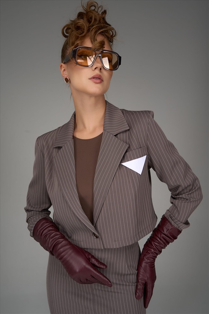 Современная интерпретация классики. Укороченный двубортный пиджак в тонкую белую полоску подчеркивает талию и гармонично дополняет как офисные, так и вечерние образы. Строгий крой смягчен изящными деталями: акцентным карманом и возможностью дополнить образ съемными кружевными манжетами.
