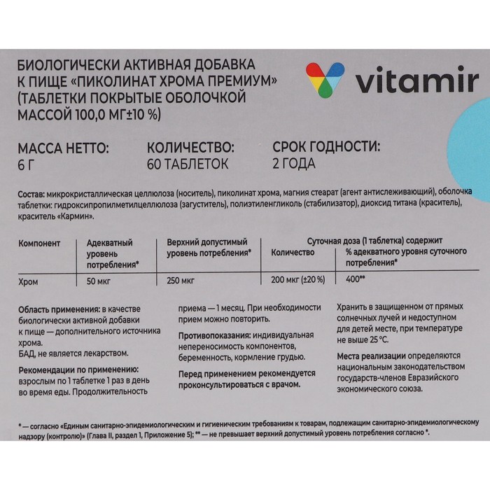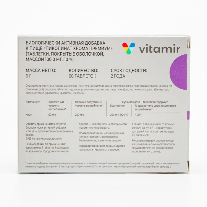 Габариты: 10 x 8 x 2 Страна: Россия В боксе: 60 шт Состав: См. на упаковке Материалы: см. на упаковке Фасовка: по 1 шт Индивидуальная упаковка: Цветная картонная коробка Сертификат: ЕАС Вес, г/Объём, мл: 6 В упаковке, шт.: 60 Вид: Витаминные комплексы Назначение: Для похудения Форма выпуска: Таблетки Микроэлементы: Cr (хром) Показания: Избыточный вес Действие: Похудение «Пиколинат хрома Премиум» — это БАД к пище, рекомендуется в качестве дополнительного источника хрома. Рекомендации по применению: взрослым по 1 таблетке 1 раз в день во время еды. Продолжительность приема – 1 месяц. При необходимости прием можно повторить. Избыточный вес — одна из самых животрепещущих тем для обсуждения, причем не только среди женщин, но и среди представителей мужского пола. Для снижения веса важен грамотный комплексный подход, который включает в себя сбалансированное питание, регулярные физические нагрузки, соблюдение режима сна и отдыха, а также прием необходимых биологически активных веществ. «Пиколинат хрома Премиум» — биологически активная добавка к пище, которая станет отличным помощником на пути к идеальному телу. Хром — довольно распространенный химический элемент. Пиколинат — это органическая форма, обеспечивающая максимальную биодоступность хрома для организма. Важнейшая биологическая роль хрома заключается в его участии в процессах синтеза жиров и обмена углеводов. Вместе с инсулином хром действует как регулятор уровня сахара в крови, обеспечивает нормальную активность инсулина. Дополнительный прием хрома используется для повышения чувствительности к инсулину при нарушении углеводного обмена. Одной из причин тяги к сладкому является дефицит хрома, причем чем больше человек употребляет сахаросодержащих продуктов, тем сильнее снижается уровень хрома — возникает своеобразный замкнутый круг. Хром позволяет легче придерживаться низкоуглеводного питания за счет уменьшения тяги к сладкому, а также помогает ускорить обмен веществ. При физических нагрузках хром помогает увеличить расход калорий, что облегчает процесс похудения. Комментарии к товару