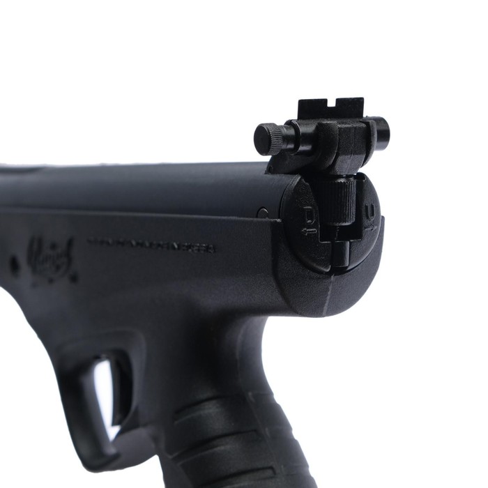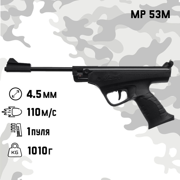 Самый массовый в России пневматический пистолет для тренировочной и развлекательной стрельбы. Прост и надёжен в эксплуатации. Конструкция классическая пружинно-поршневая, взведение боевой пружины осуществляется поворотом ствола в вертикальной плоскости. Предохранительные механизмы обеспечивают безопасность в обращении с пистолетом: исключен удар стволом при случайном срыве руки во время взведения; происходит блокировка от выстрела при неполностью запертом стволе. Эргономичная пластмассовая рукоятка позволяет одинаково комфортно стрелять как с правой, так и с левой руки. Спусковой механизм с регулировкой длины рабочего хода спускового крючка. Прицел с микрометрической регулировкой по горизонтали и вертикали, с изменяемой длиной прицельной линии.