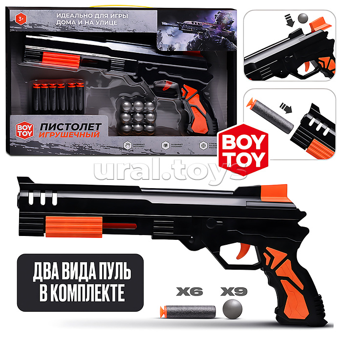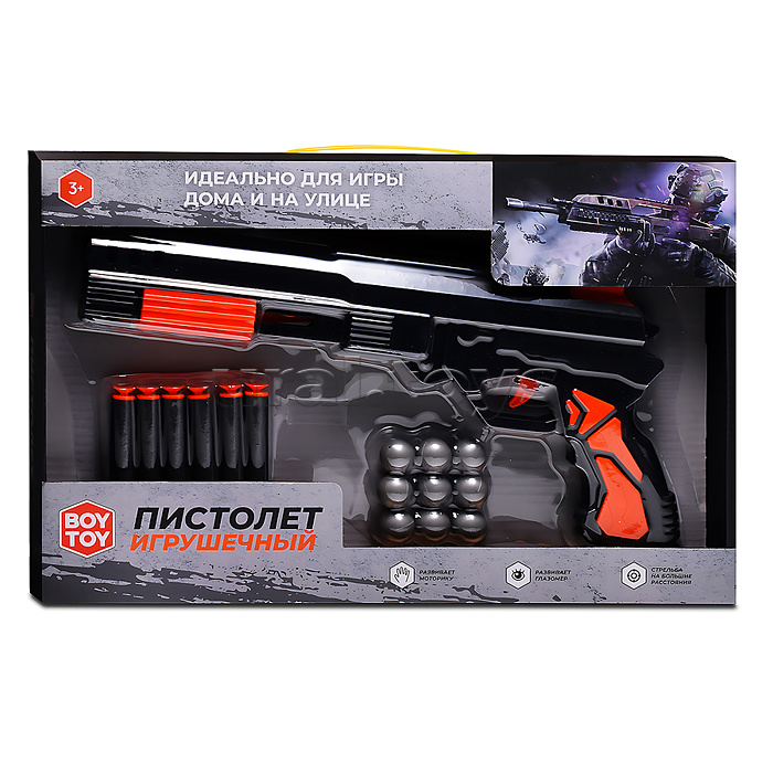 Код: 486576 Штрихкод: 4630432203456 Страна производитель: Китай Размеры упаковки: 37.5 x 3.5 x 24 см Количество в коробке: 48 Размеры пистолета: 32 х 2.5 х 16 см. Пневматический механизм стрельбы. Материал: пластик. В комплекте: - 9 пластиковых шариков. - 6 мягких пуль с присосками. Соответствует требованиям безопасности продукции. Для детей от 3-х лет. Комментарии к товару