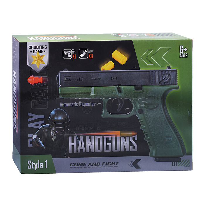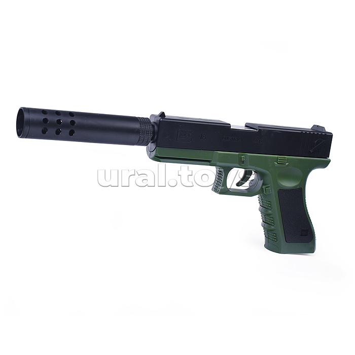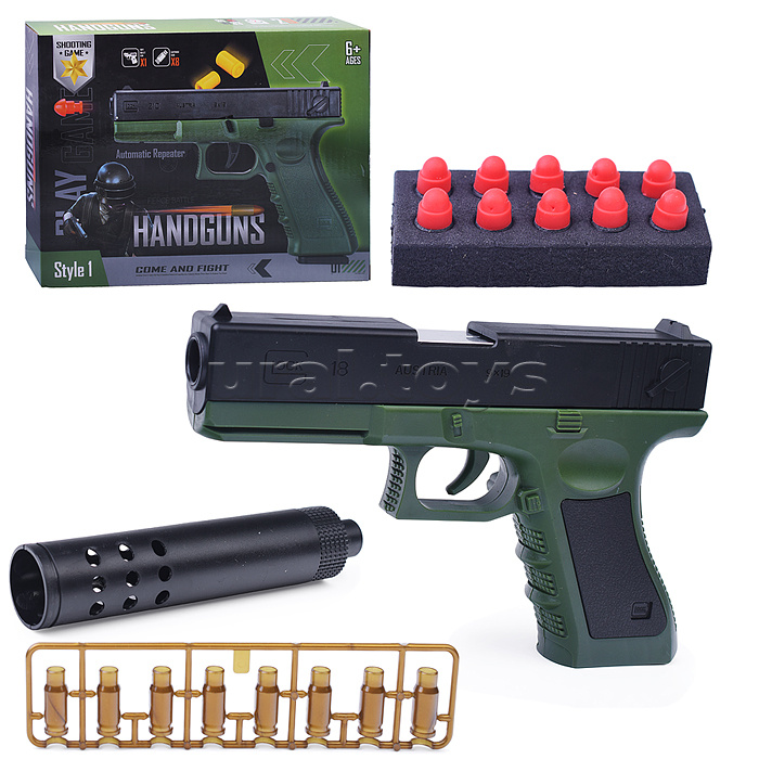 В наборе: - пистолет 20 х 3 х 13 см - глушитель 13 х 3 см - магазин - патроны Этот пистолет подарит вашему ребенку удивительное впечатление от игры, развивая при этом его навыки меткости, координации движений и сосредоточенности Материал: пластик Для детей от 3-х лет