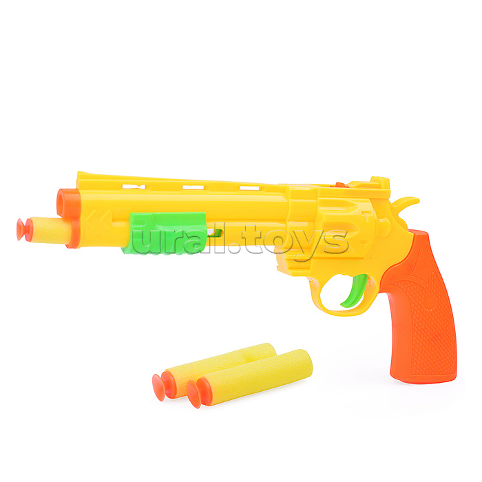 В комплекте три патрона из эва на присосках. Размеры пистолета: 26 х 4 х 12,5 см. Материал: пластик. Для детей от 3-х лет. Соответствует требованиям безопасности продукции.