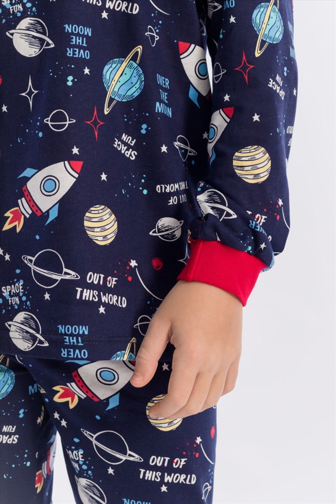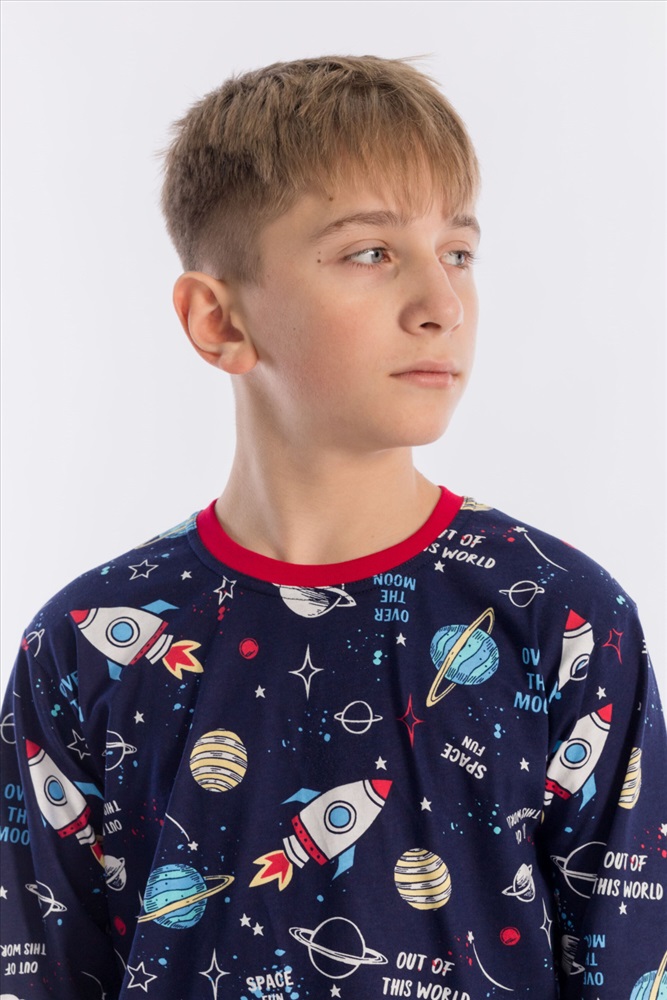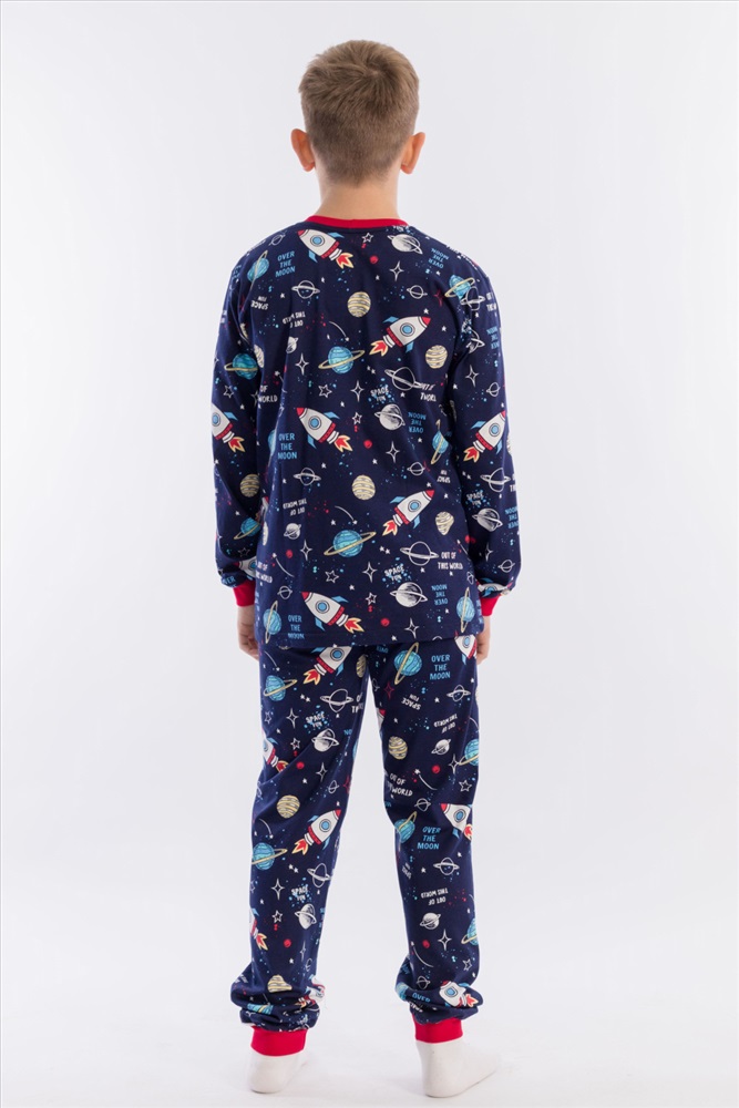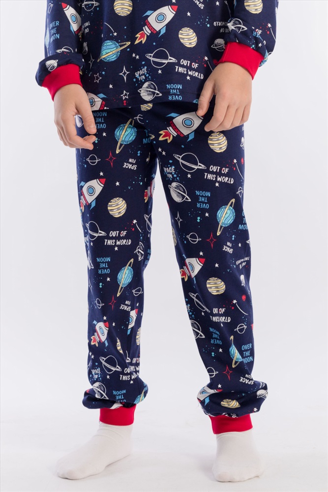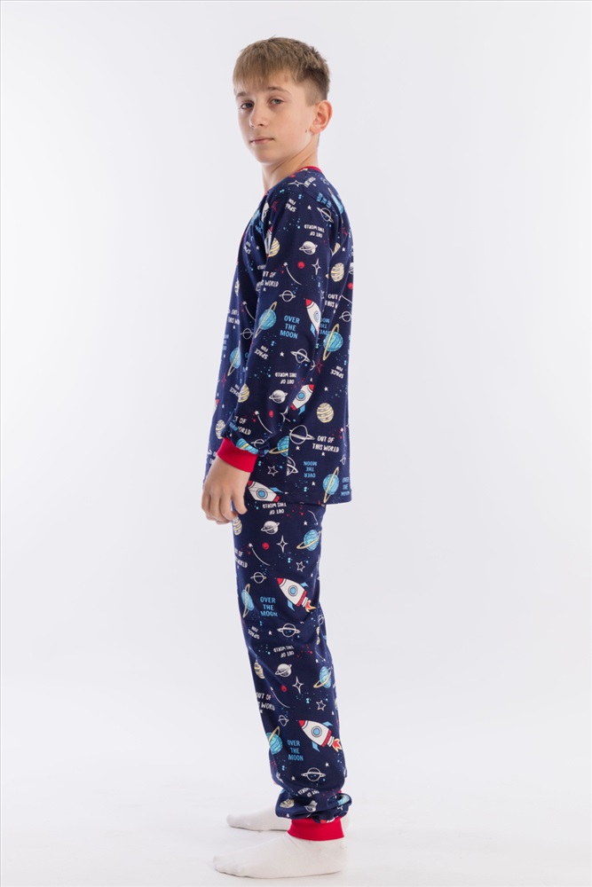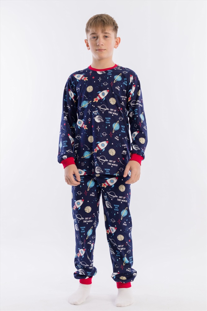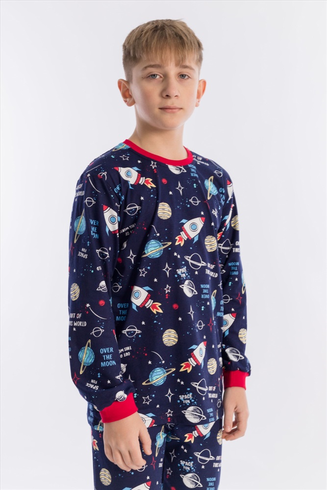 Вид низа комплекта: Брюки Вид ткани: Кулирка Сезон: Всесезонный Состав: Хлопок 100% Цвет Номенклатуры: синий/мультиколор Пижама для мальчика, выполнена из хлопковой ткани с набивным рисунком. Футболка с длинным рукавом на манжете, брюки с поясом на резинке и манжетах снизу. ВНИМАНИЕ !!! На данную модель нет гарантии по цвету. Расцветка набивки может отличаться от представленной на фото. Комментарии к товару