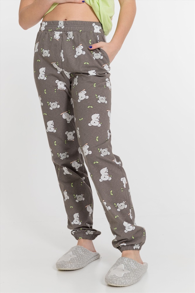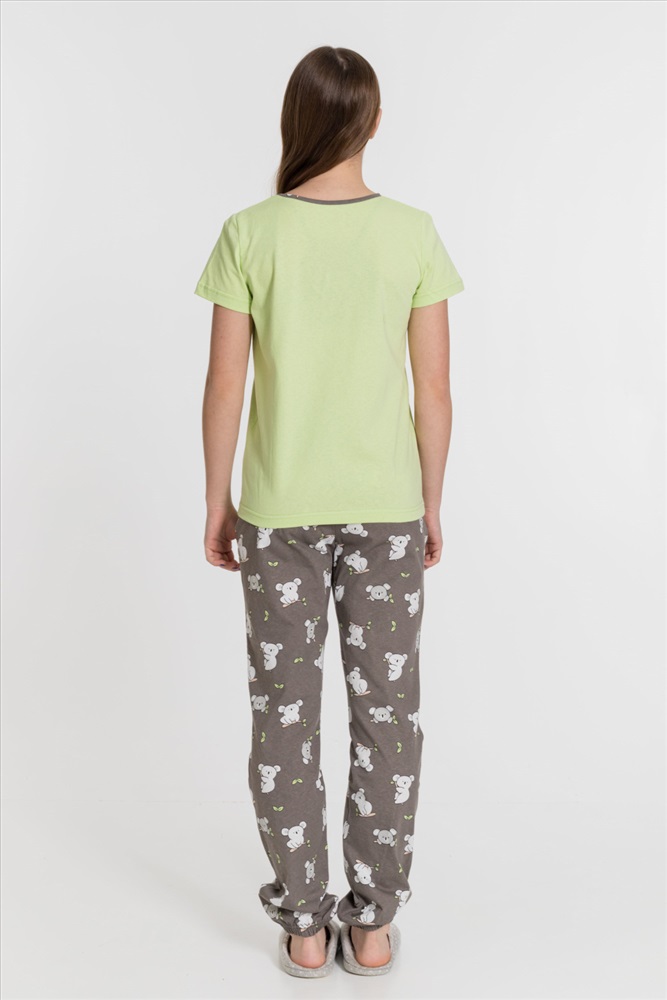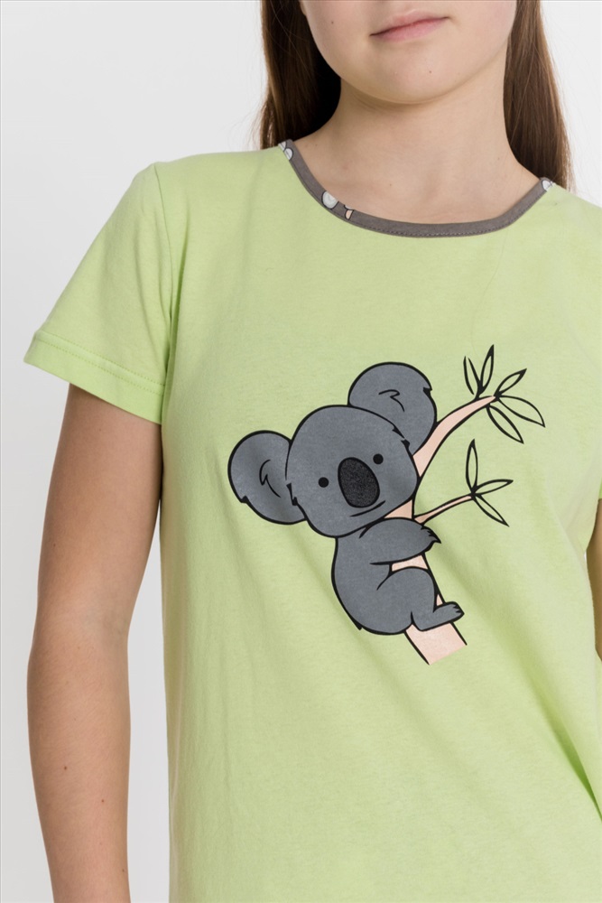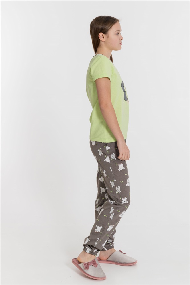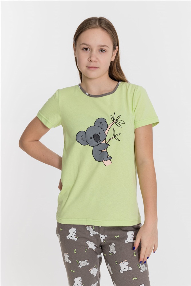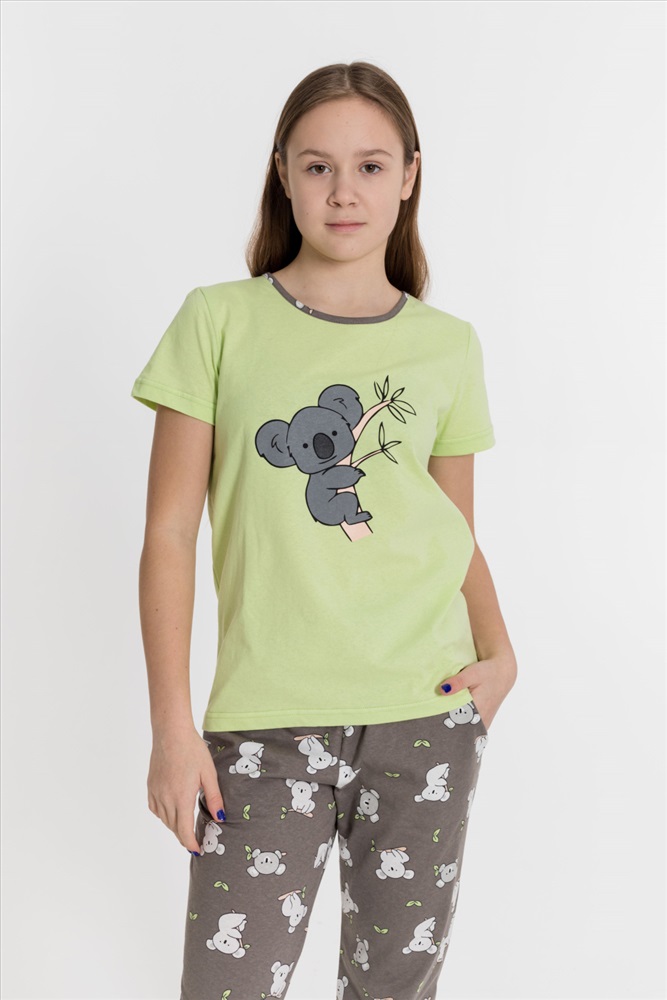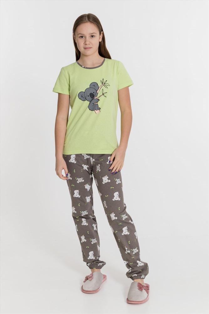 Вид низа комплекта: Брюки Вид ткани: Кулирка Сезон: Всесезонный Состав: Хлопок 100% Цвет Номенклатуры: фисташковый Костюм выполнен из 100% хлопкового полотна, состоит из футболки и брюк. Футболка с принтом спереди, горловина обработана бейкой. Брюки с карманами по бокам, низ слегка присборен резинкой. Комментарии к товару