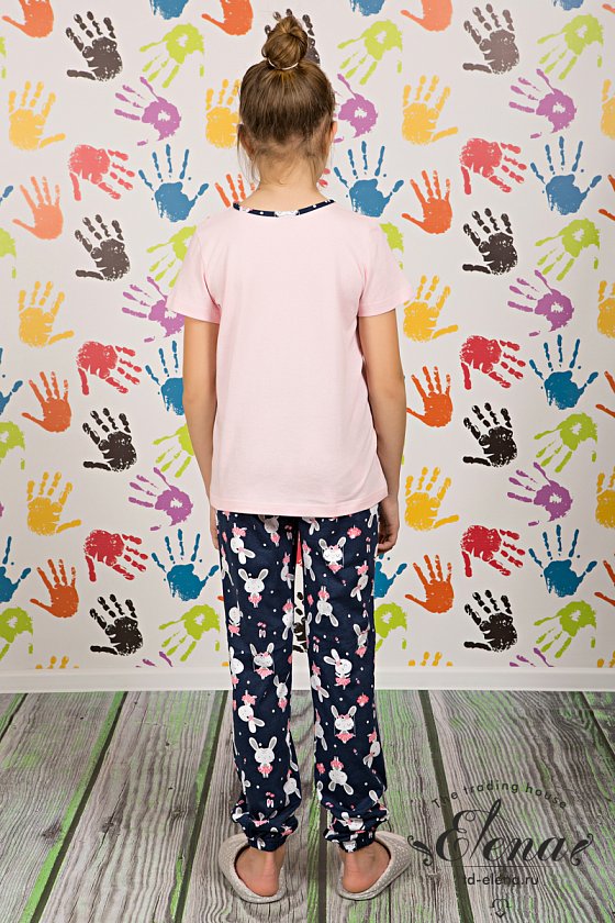 Костюм выполнен из х/б полотна, состоит из футболки и брюк. Футболка с принтом спереди, горловина обработана бейкой. Брюки с карманами по бокам, низ слегка присборен резинкой.